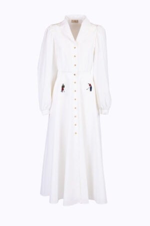 Abito Lungo in Cotone e Seta con Bottoncini e Ricami Golfisti – Bianco