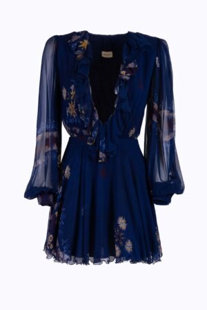 OTRAVEZ ARCHIVE PROMPT DELIVERYShort V-Neck Dress with Ruffles – Flowers Blue Background