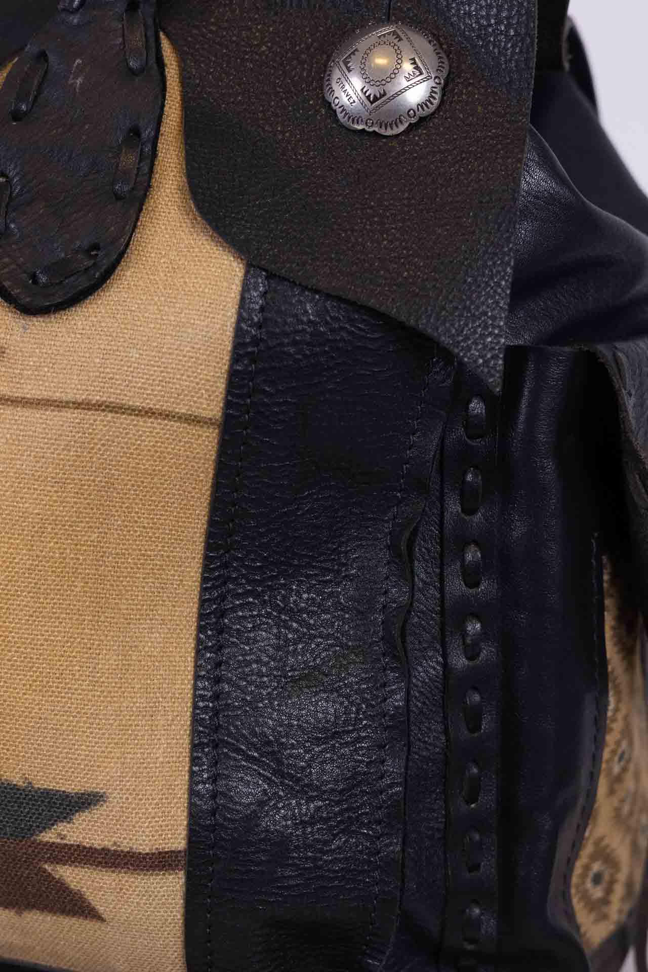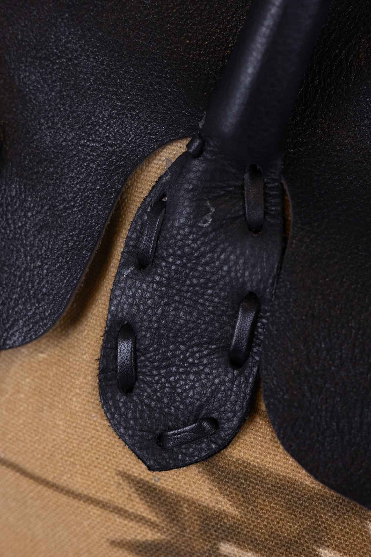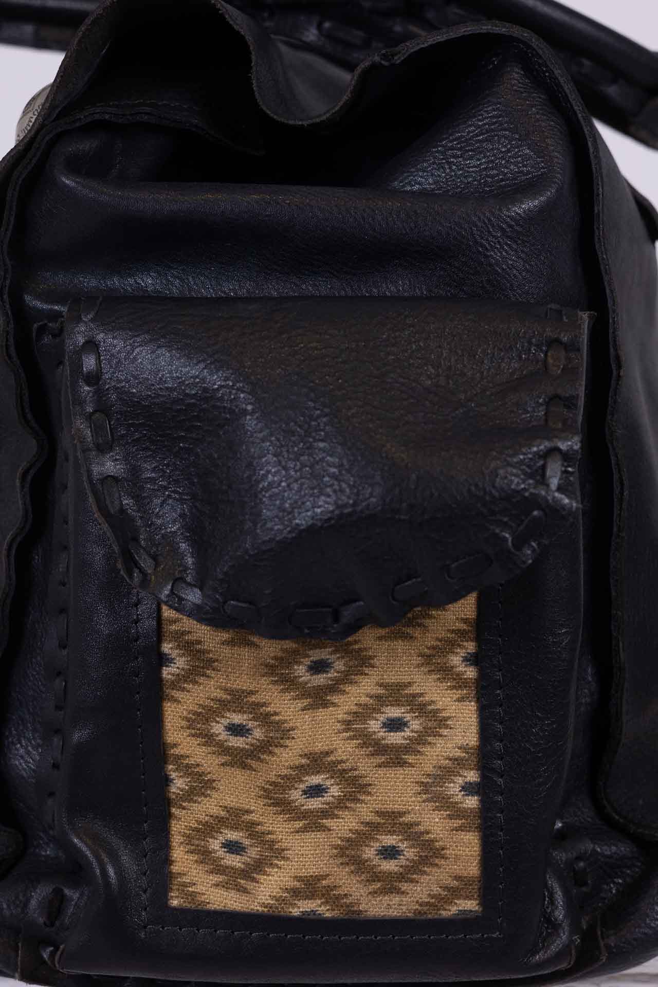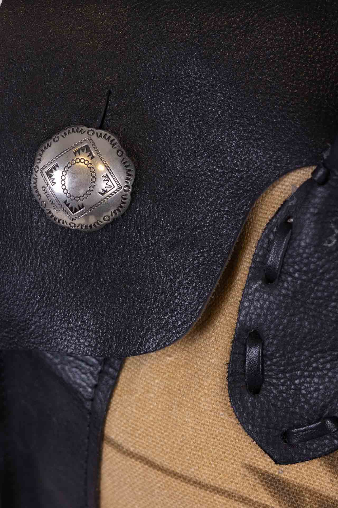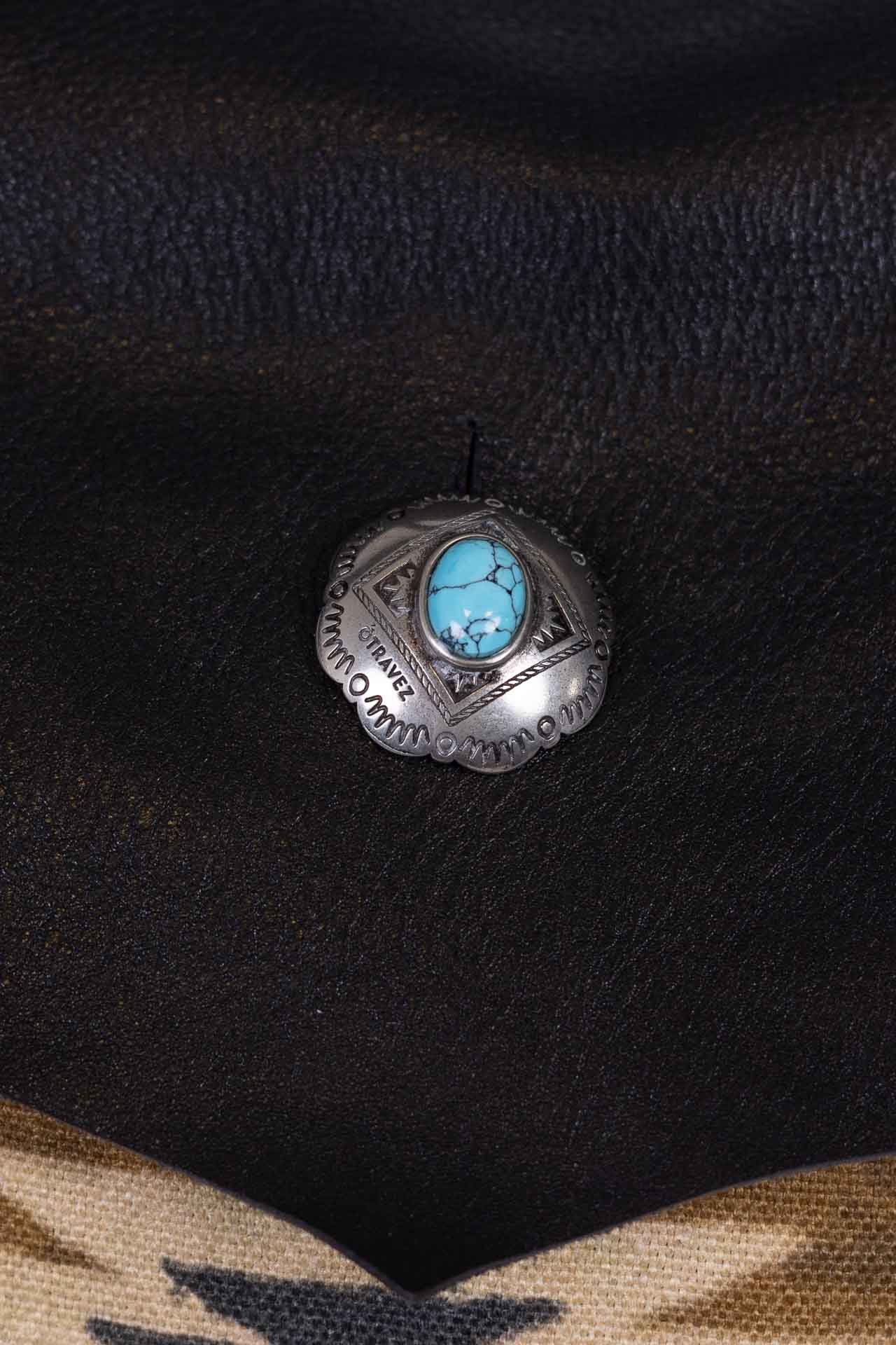 Made of fine black leather, it features a central fastening with three Otravez buttons, the central one of which is embellished with a natural turquoise paste stone.