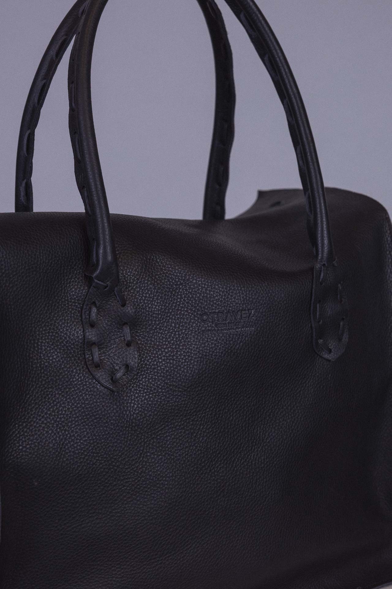 The hand-threaded decorative stitching on the handles and side pockets highlights its artisanal attention to detail and gives it an exclusive character. The sturdy handles, with their carefully studied length, ensure total comfort whether carried by hand or on the shoulder.