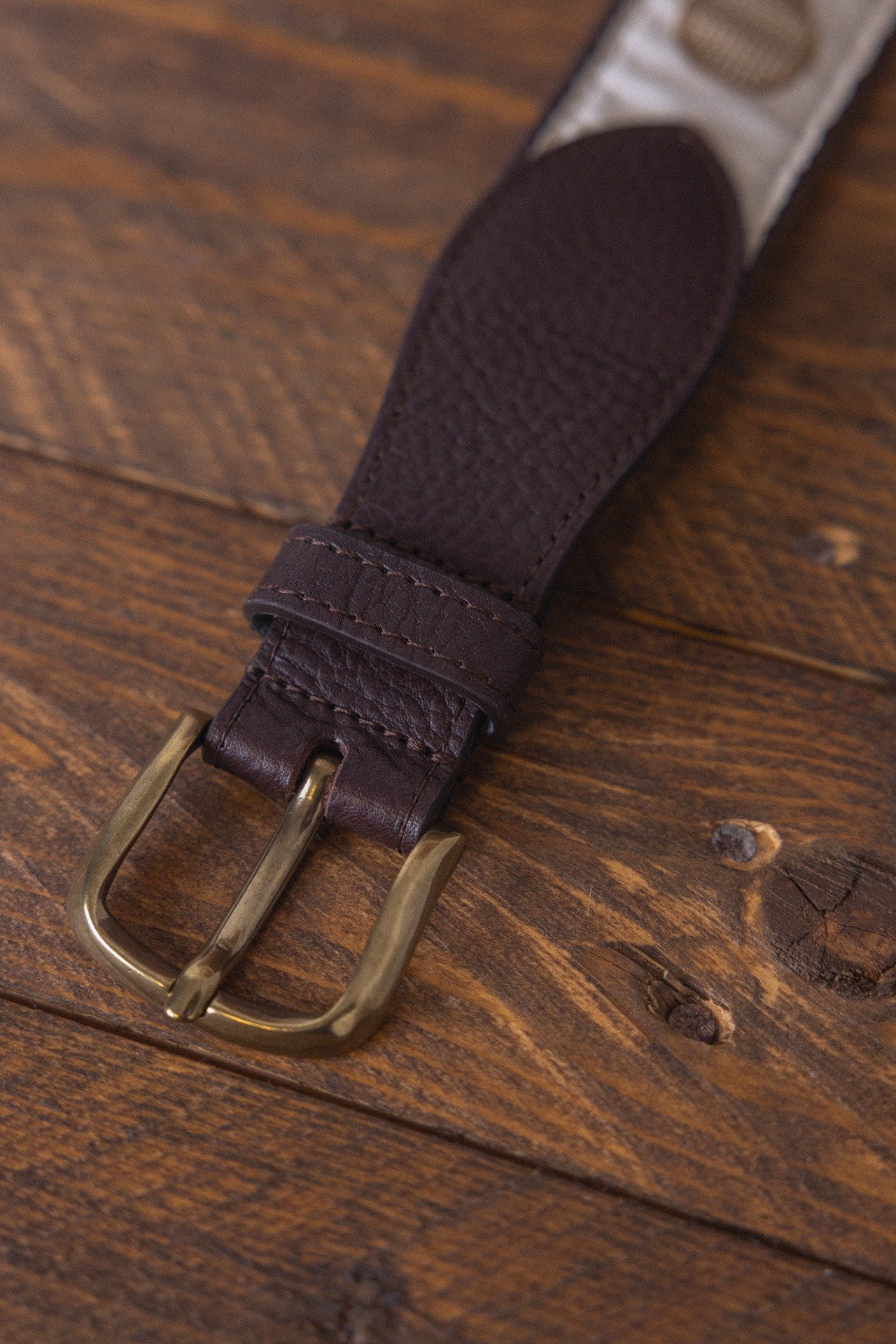 Crafted with a custom jacquard design, it authentically interprets the capsule collection’s imagery through a refined and recognizable graphic motif. Handmade in Italy, it embodies the excellence of traditional craftsmanship, with hammered dark brown leather details and a vintage-style metal buckle. The warm, natural colors of the ribbon blend harmoniously, creating an elegant balance between heritage and modernity.