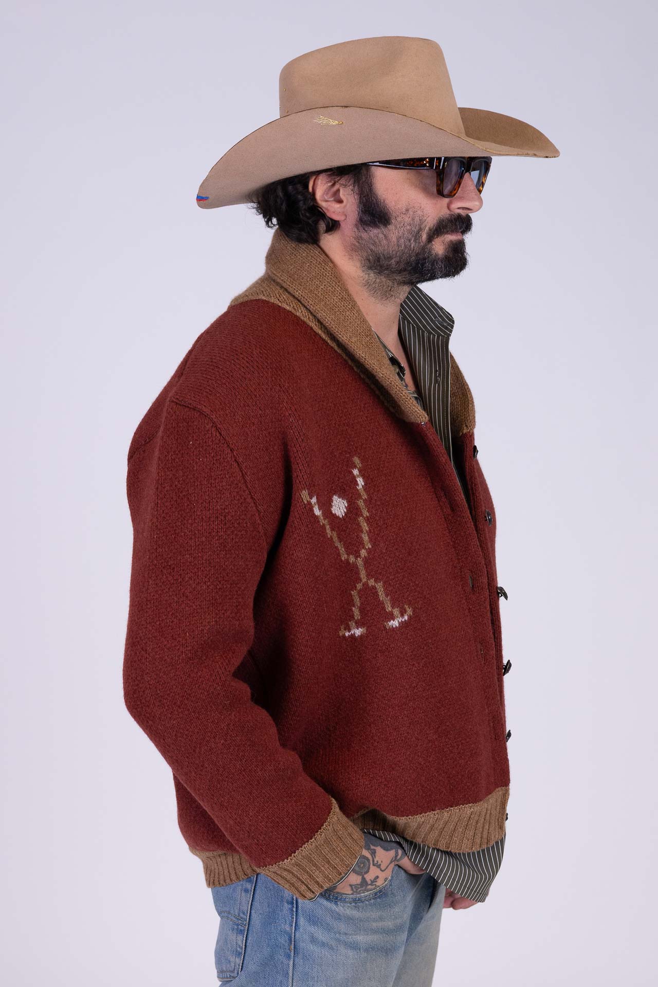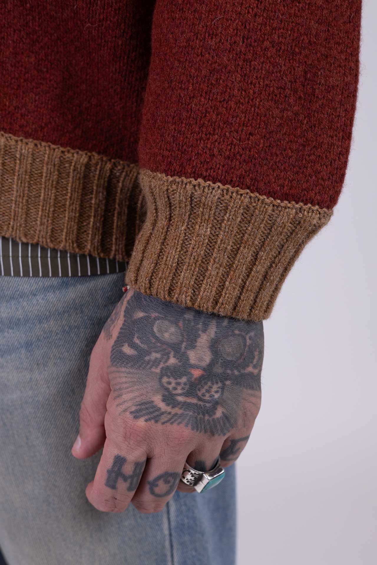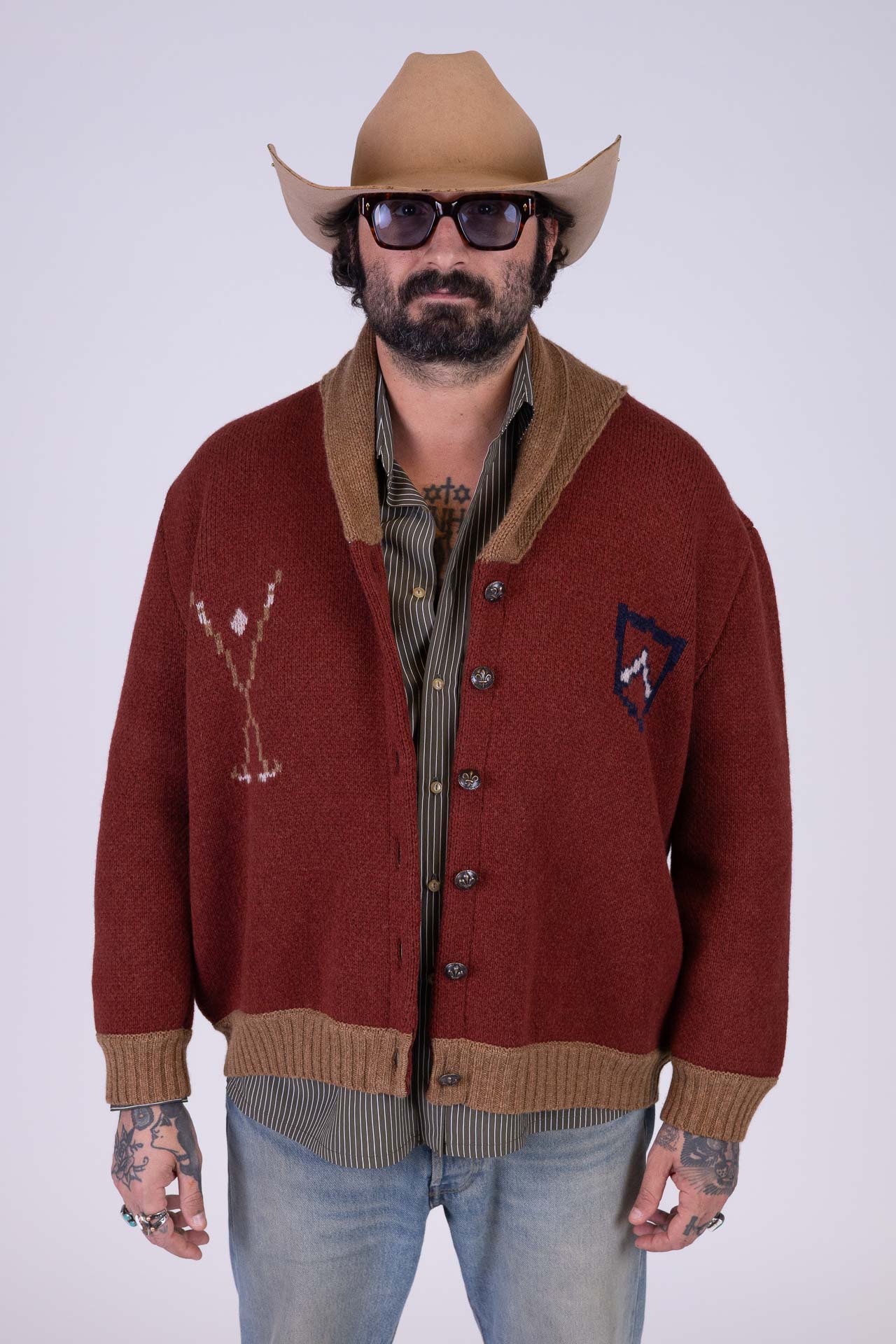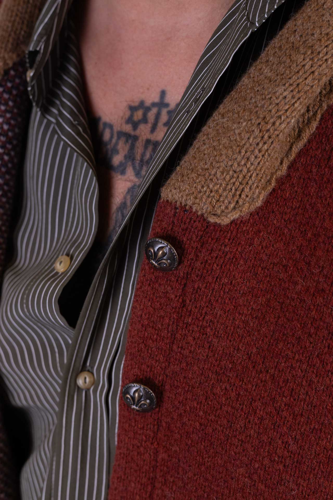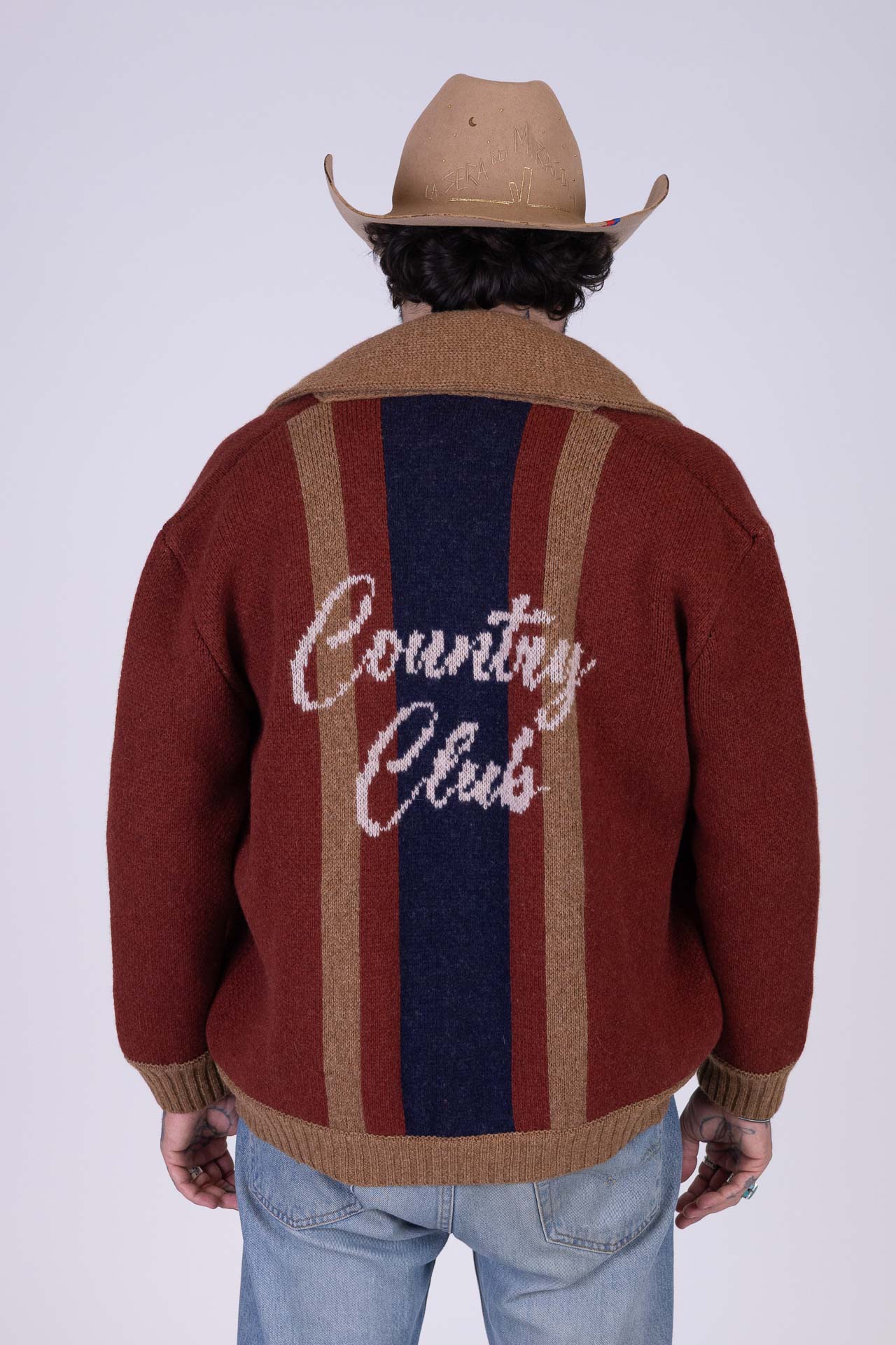This exclusive cardigan, made with fine English wool yarns, blends artisanal elegance with the timeless charm of sporting heritage. The warm and intense burgundy red base is embellished with a sophisticated jacquard workmanship depicting two crossed polo bats and a heraldic shield on the front — symbols of a refined style inspired by the world of English sports clubs. On the back, the graphic composition becomes bolder: two vertical navy blue stripes cross the back, framing the central knitted “Country Club” writing, a clear tribute to a timeless aesthetic that recalls tradition and belonging. The front closure is entrusted to six metal buttons with aged brass plating, which give the garment an additional vintage and distinctive touch. With its comfortable fit and refined design, this cardigan is designed for those who love to combine style and identity, paying homage to sporting elegance with a one-of-a-kind garment.