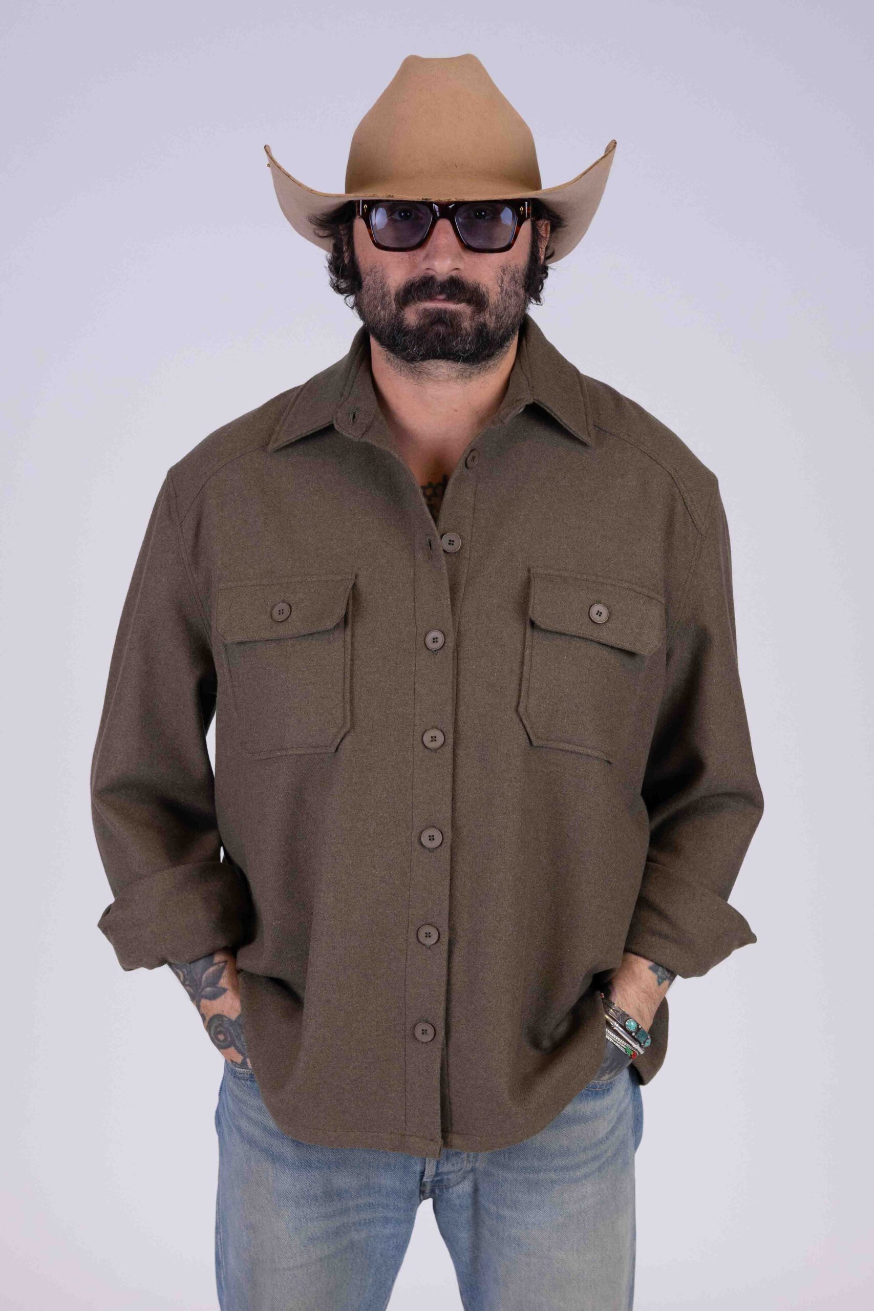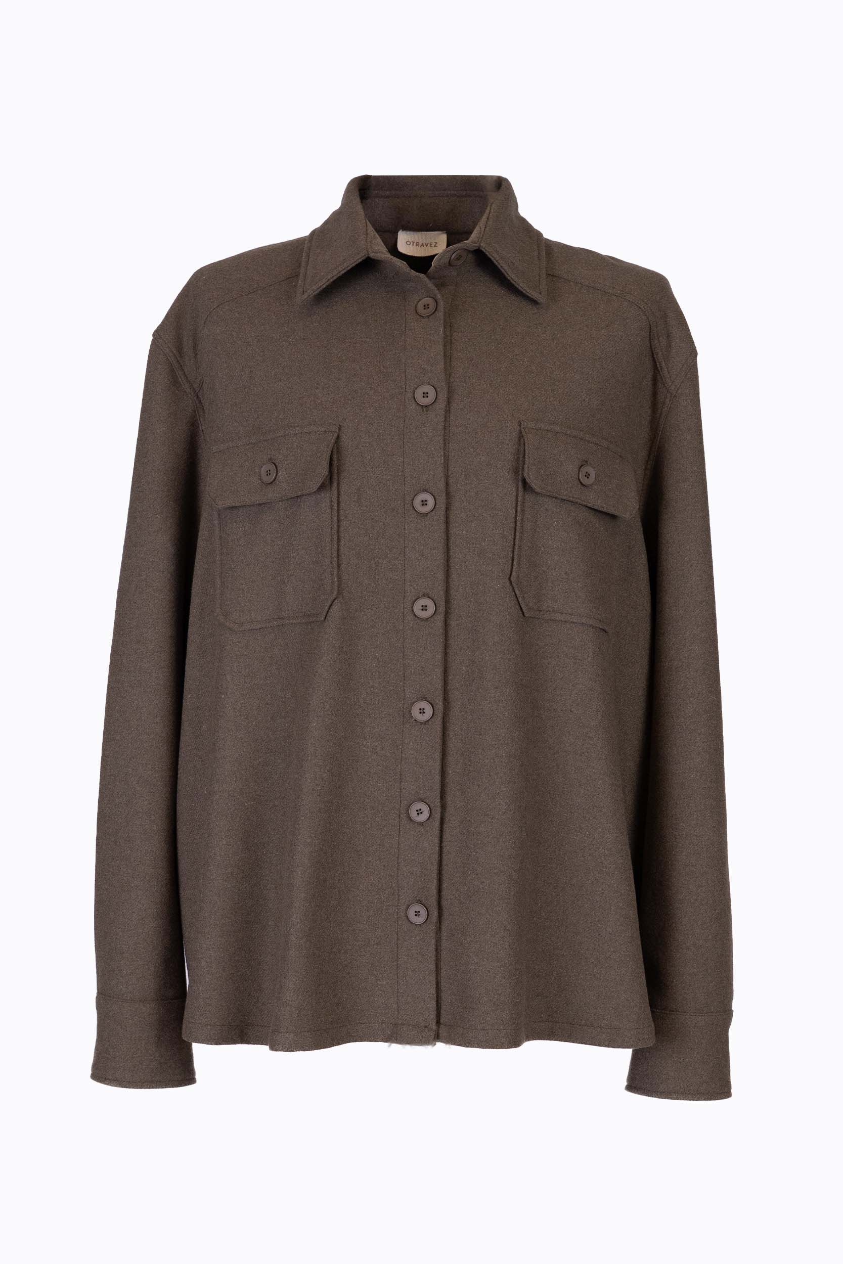 Crafted in a wool blend, it offers warmth and a soft touch, while maintaining breathability and durability. The design is enhanced by a central band with tone-on-tone buttons, which integrate seamlessly with the shirt for a minimal and refined effect. The two flap pockets on the chest add a touch of utility without sacrificing style, while the buttoned cuffs ensure a flawless fit.