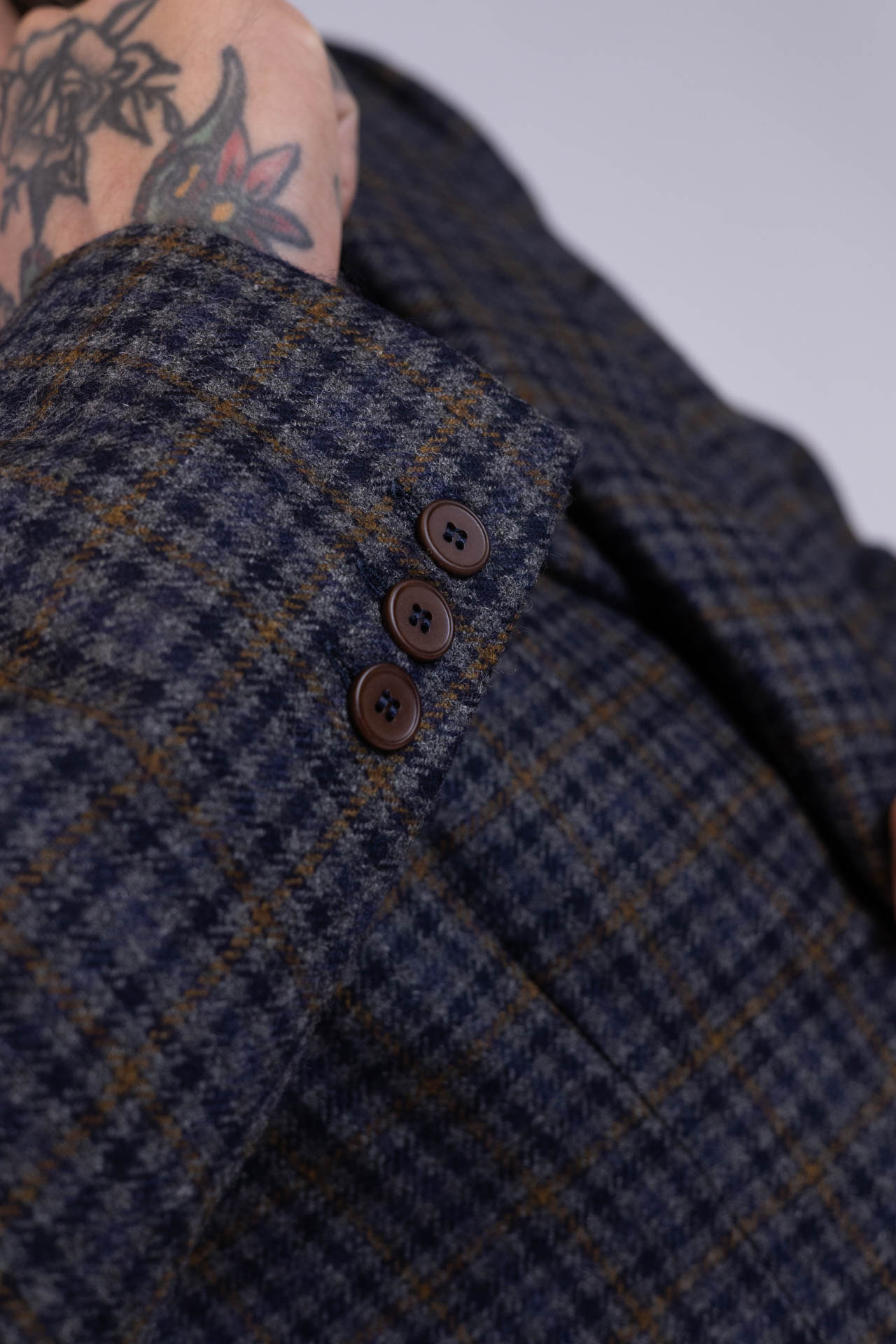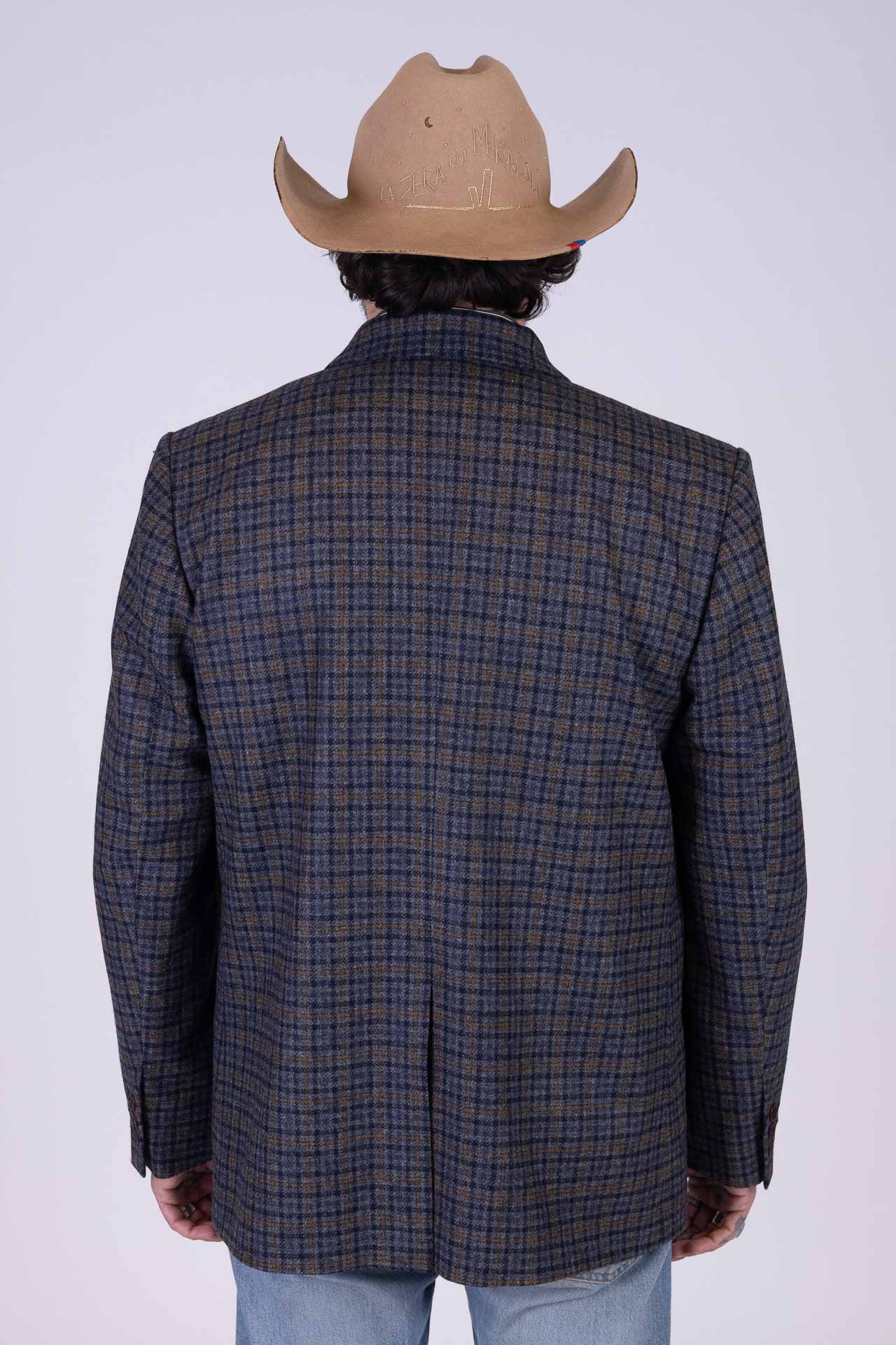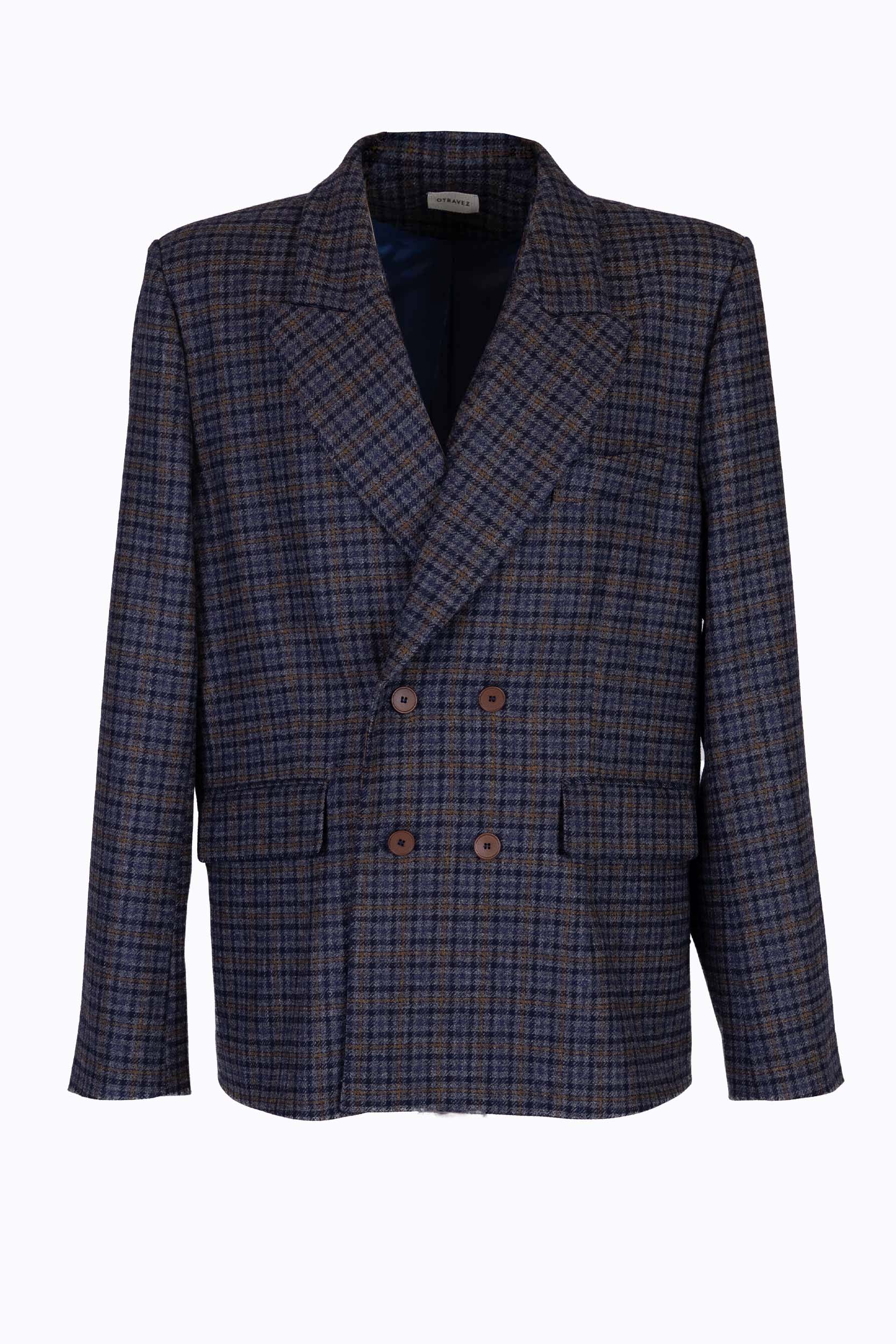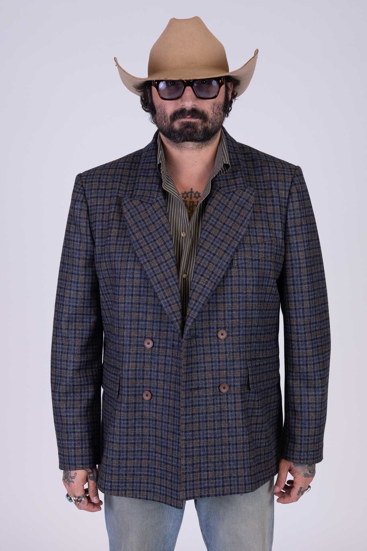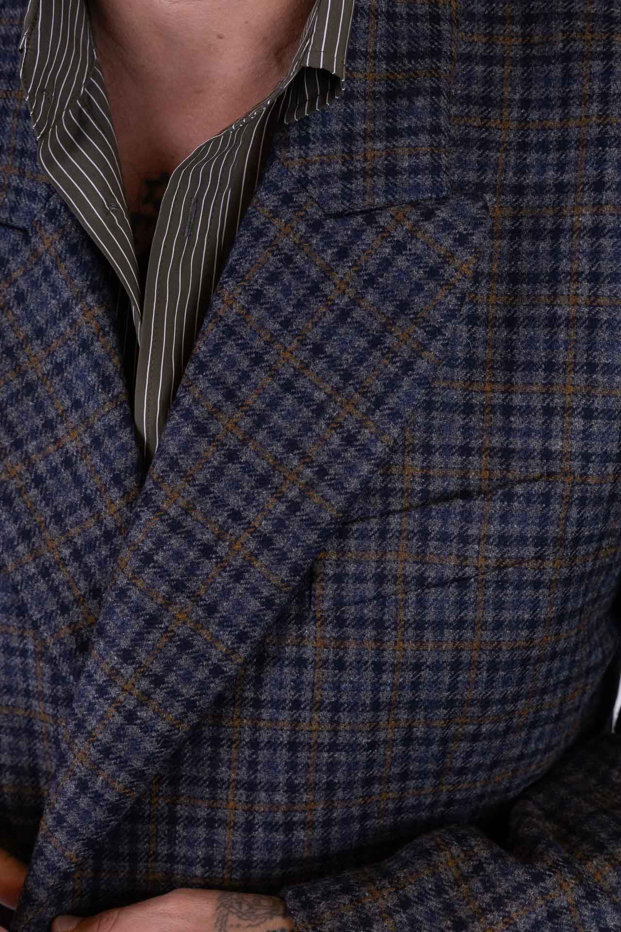 Crafted from pure English wool with a gray and blue tartan pattern, this relaxed-fit jacket combines tradition and contemporary style. The line falls below the hips with balance and ease, enhancing the garment’s structure without sacrificing comfort.