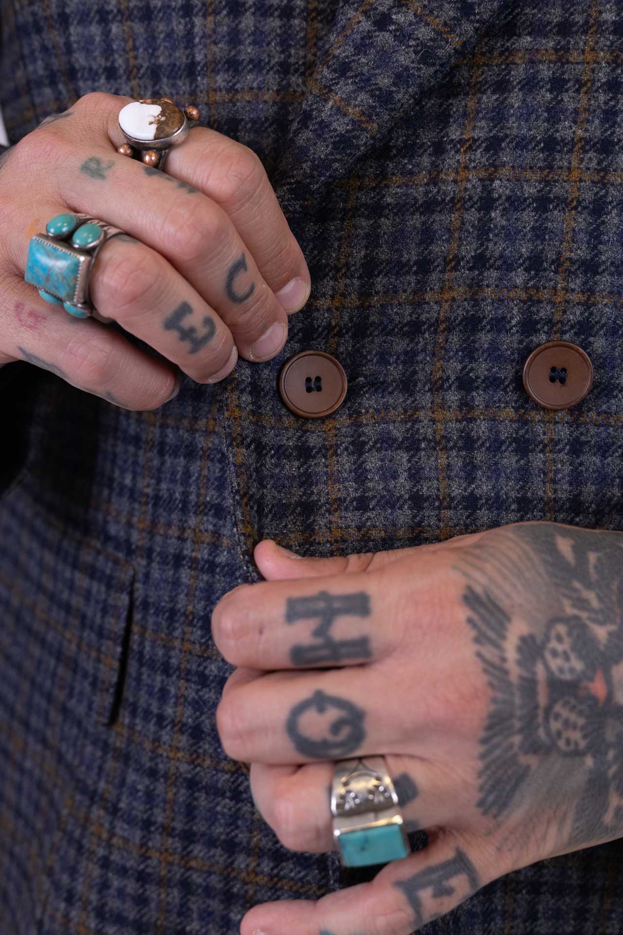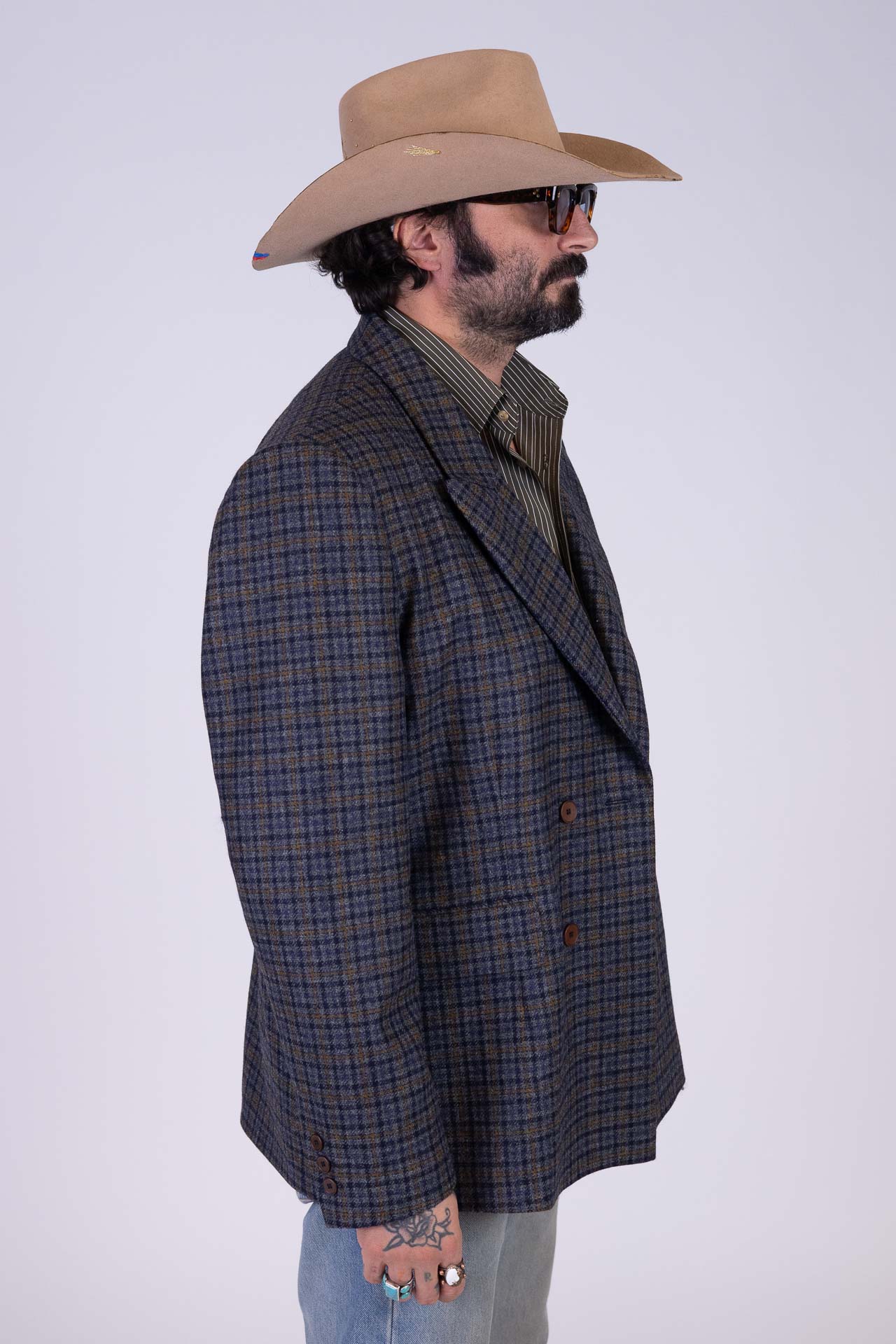 The notched lapel and double-breasted four-button front closure lend a bold, masculine elegance, while three small buttons on the cuffs complete the design with meticulous tailoring.