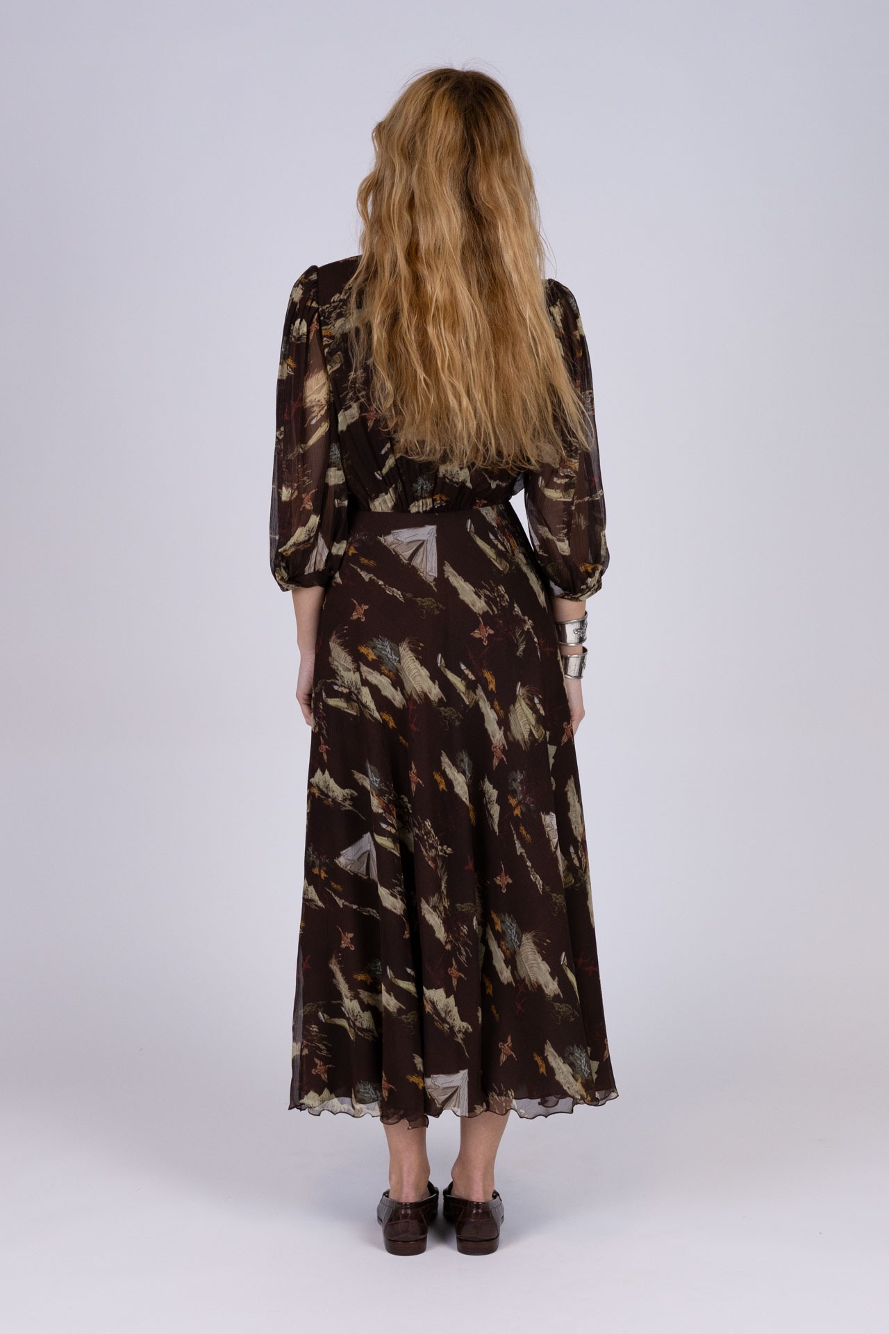 A midi dress with a feminine and harmonious silhouette, crafted from silk and lined in viscose to ensure a fluid, comfortable fit that gently caresses the body with natural lightness. The bodice softly embraces the bust, enhancing the décolleté, while the defined waist creates an elegant balance between structure and softness, opening into a skirt that moves with graceful fluidity and refined drape.