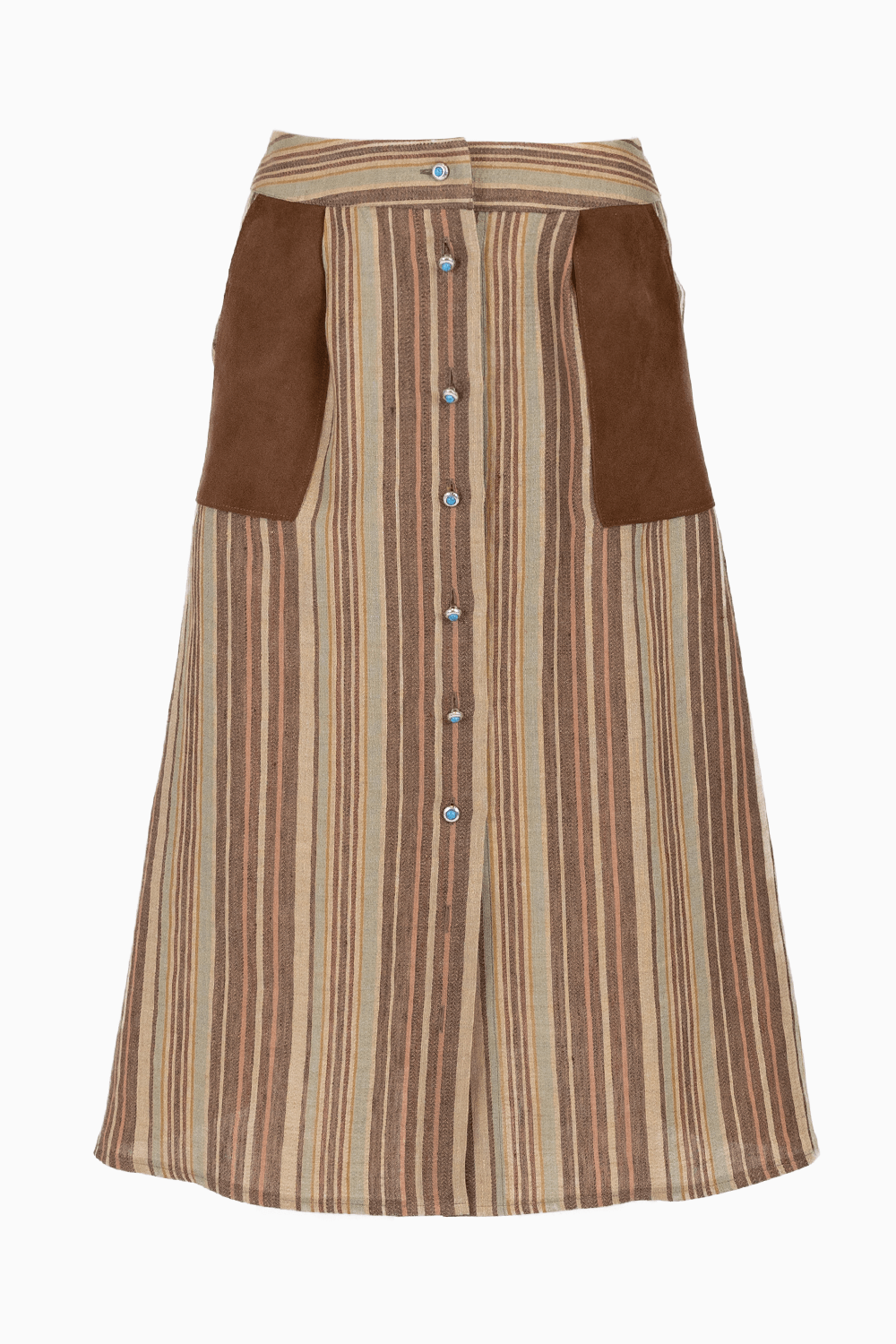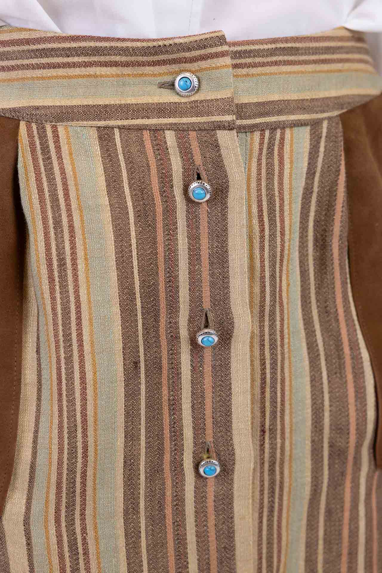 The soft, flowing line enhances the silhouette, while the leather patch pockets add a touch of personality and craftsmanship, creating a refined contrast between the materials. On the front, a row of buttons embellished with natural turquoise stone inserts adds a touch of sparkle and a distinctive touch, making the piece even more special.