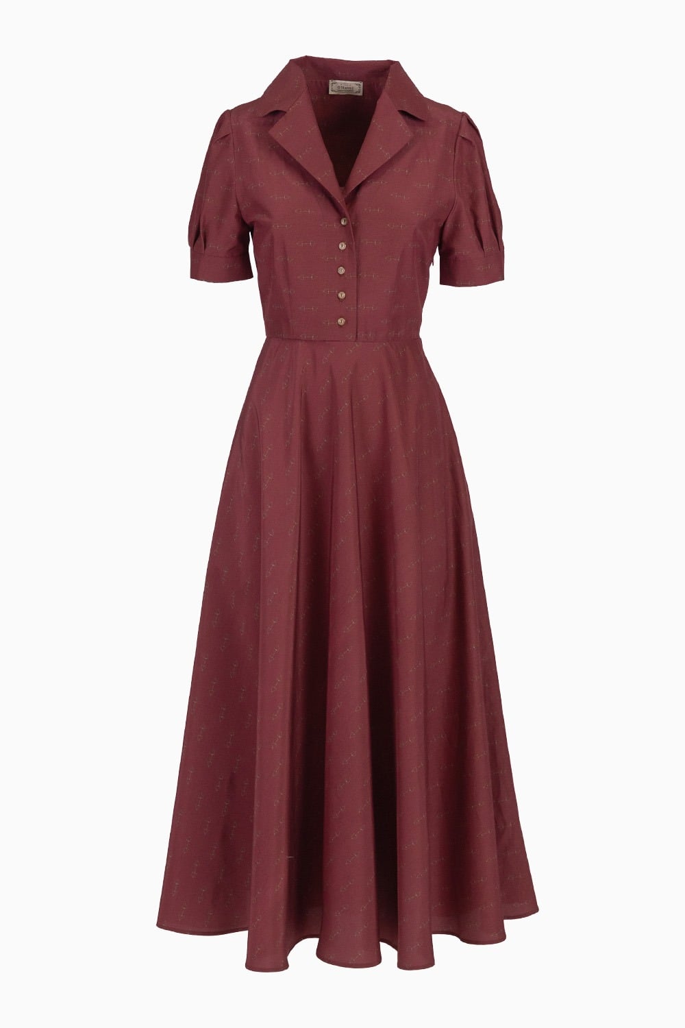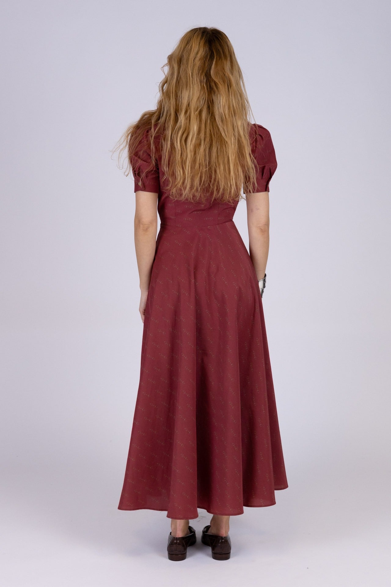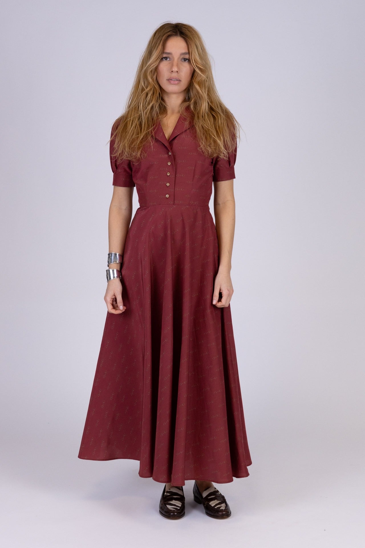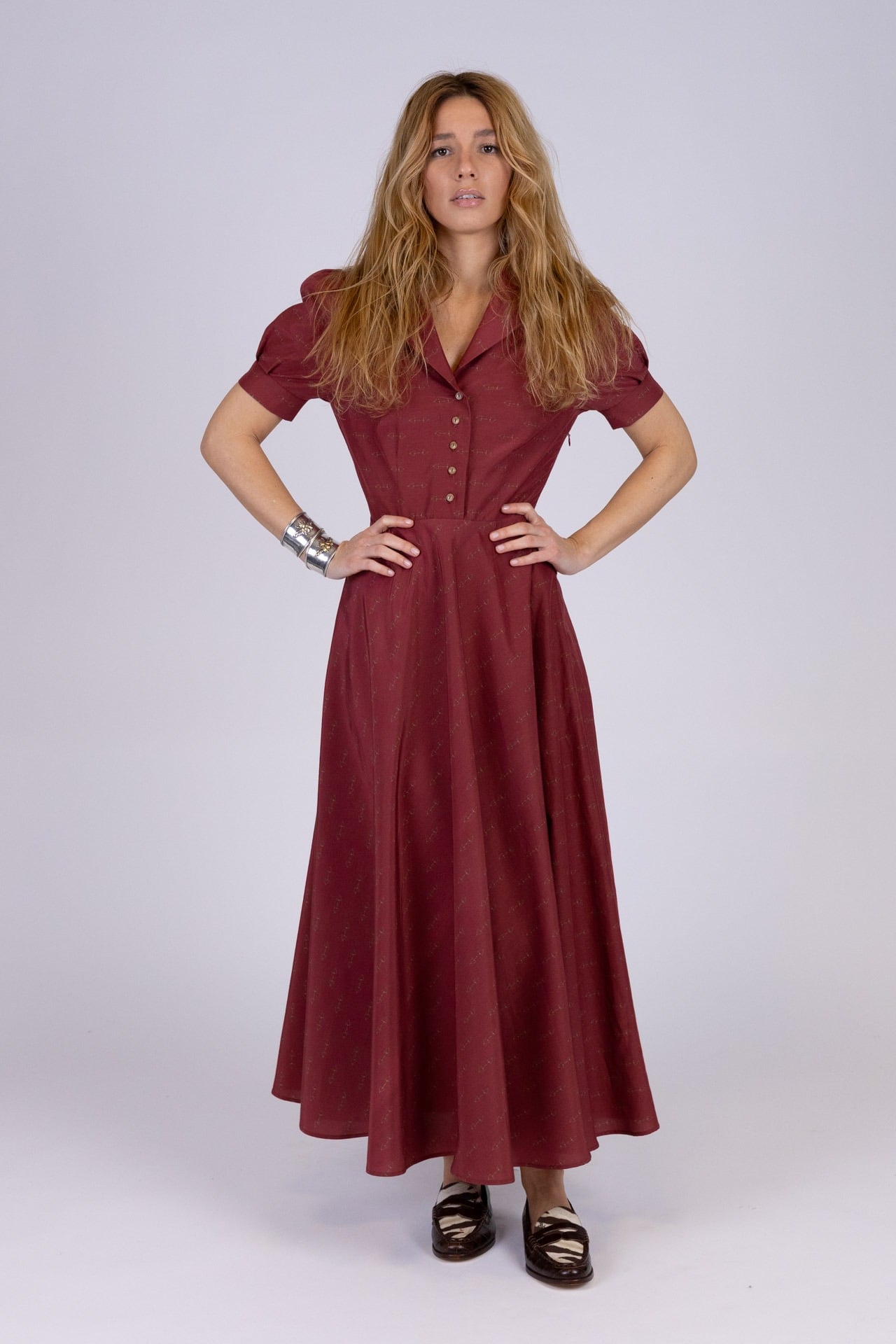 The midi silhouette with a wide, flowing skirt moves lightly with the body, while the shirt-style bodice expresses a balance between structure and delicacy. The short, voluminous sleeves are finished with a structured cuff and button placket adorned with natural buttons, symbols of care and artisanal authenticity.
