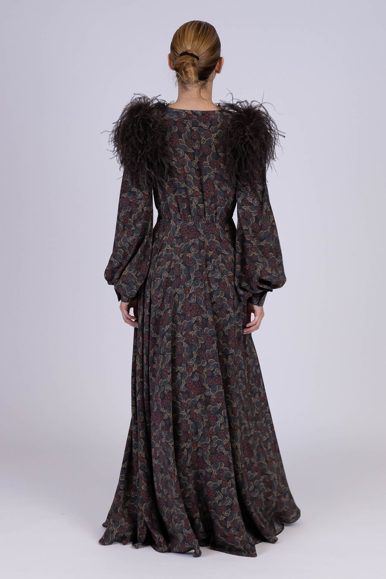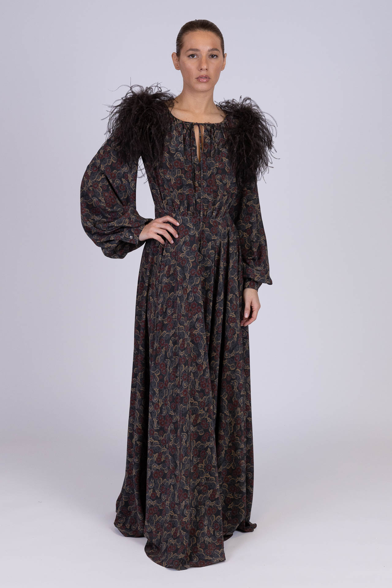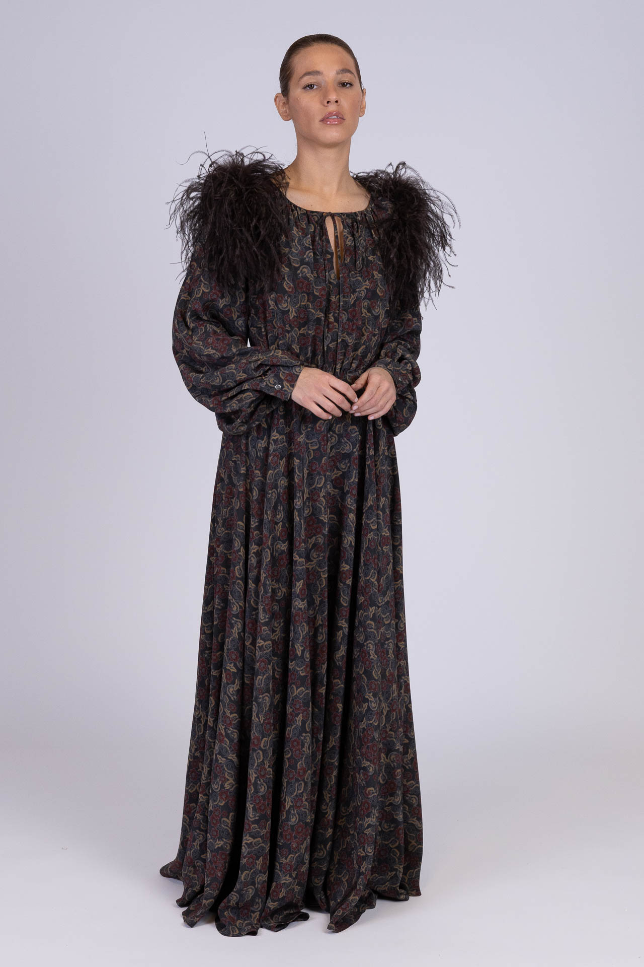 Realizzato in crêpe de chine di seta, avvolge la silhouette con un movimento morbido e fluente, leggero come un soffio. La lunghezza alla caviglia ne esalta la grazia naturale, mentre le piume di struzzo in tonalità caffè, applicate sulle spalle, aggiungono un accento di sofisticata teatralità.