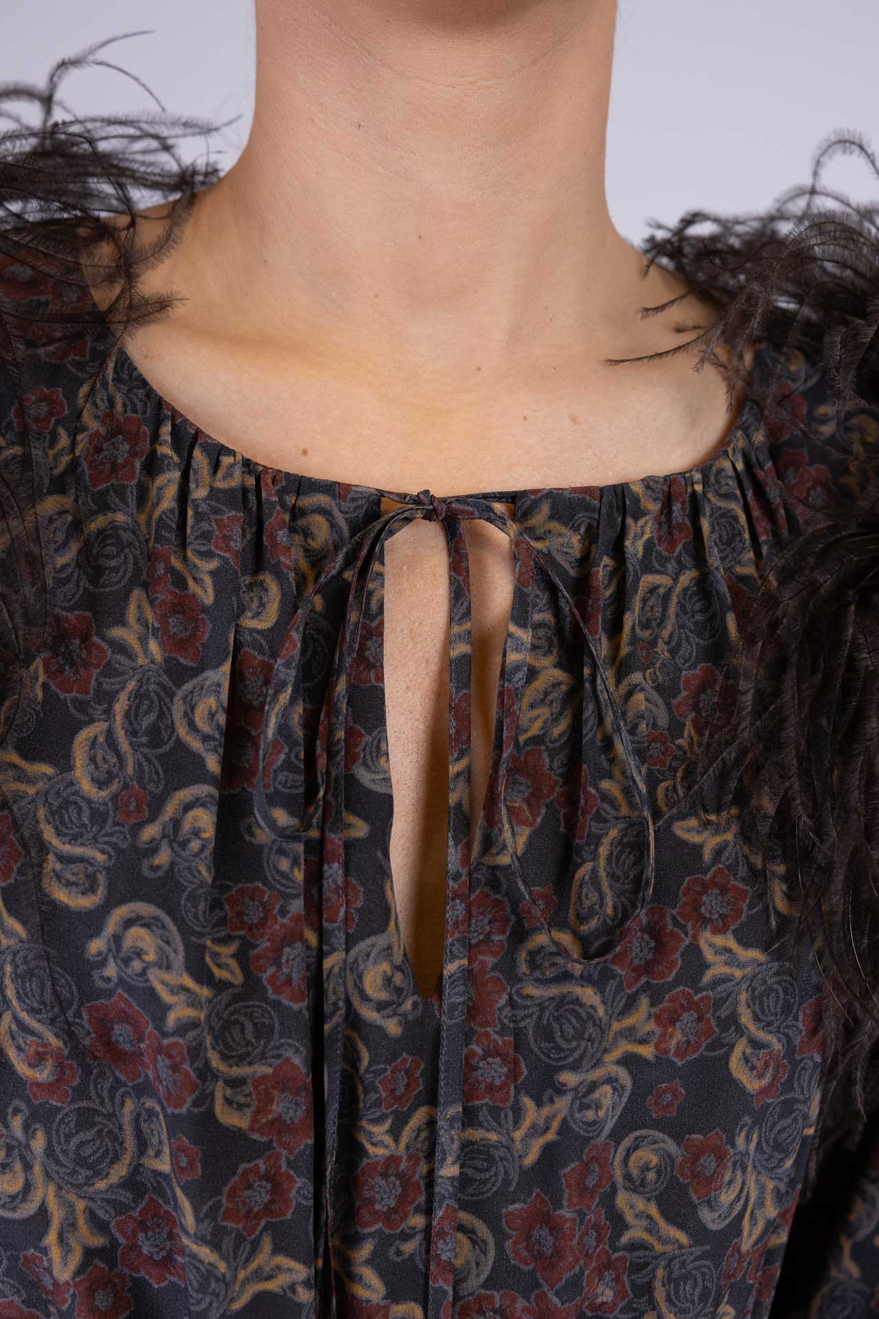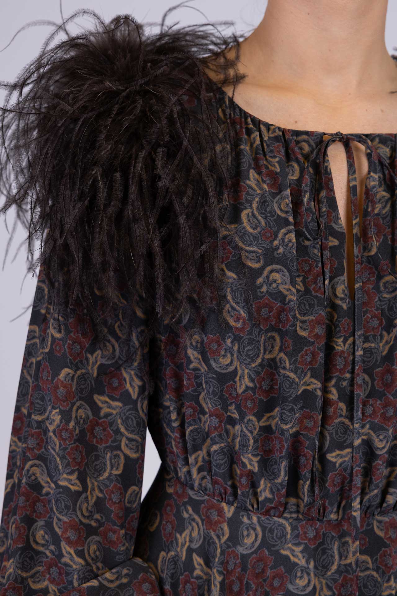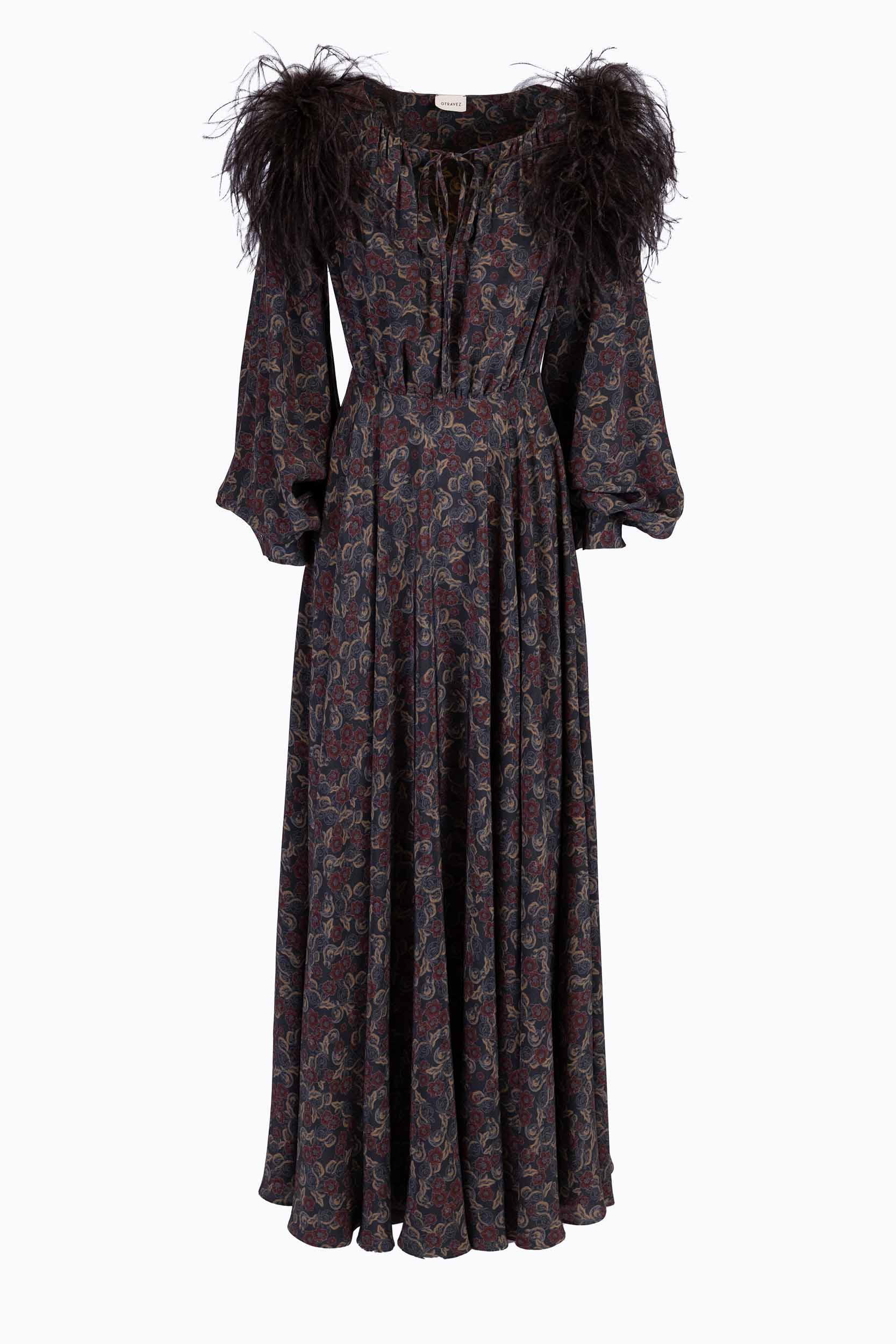 Realizzato in crêpe de chine di seta, avvolge la silhouette con un movimento morbido e fluente, leggero come un soffio. La lunghezza alla caviglia ne esalta la grazia naturale, mentre le piume di struzzo in tonalità caffè, applicate sulle spalle, aggiungono un accento di sofisticata teatralità.