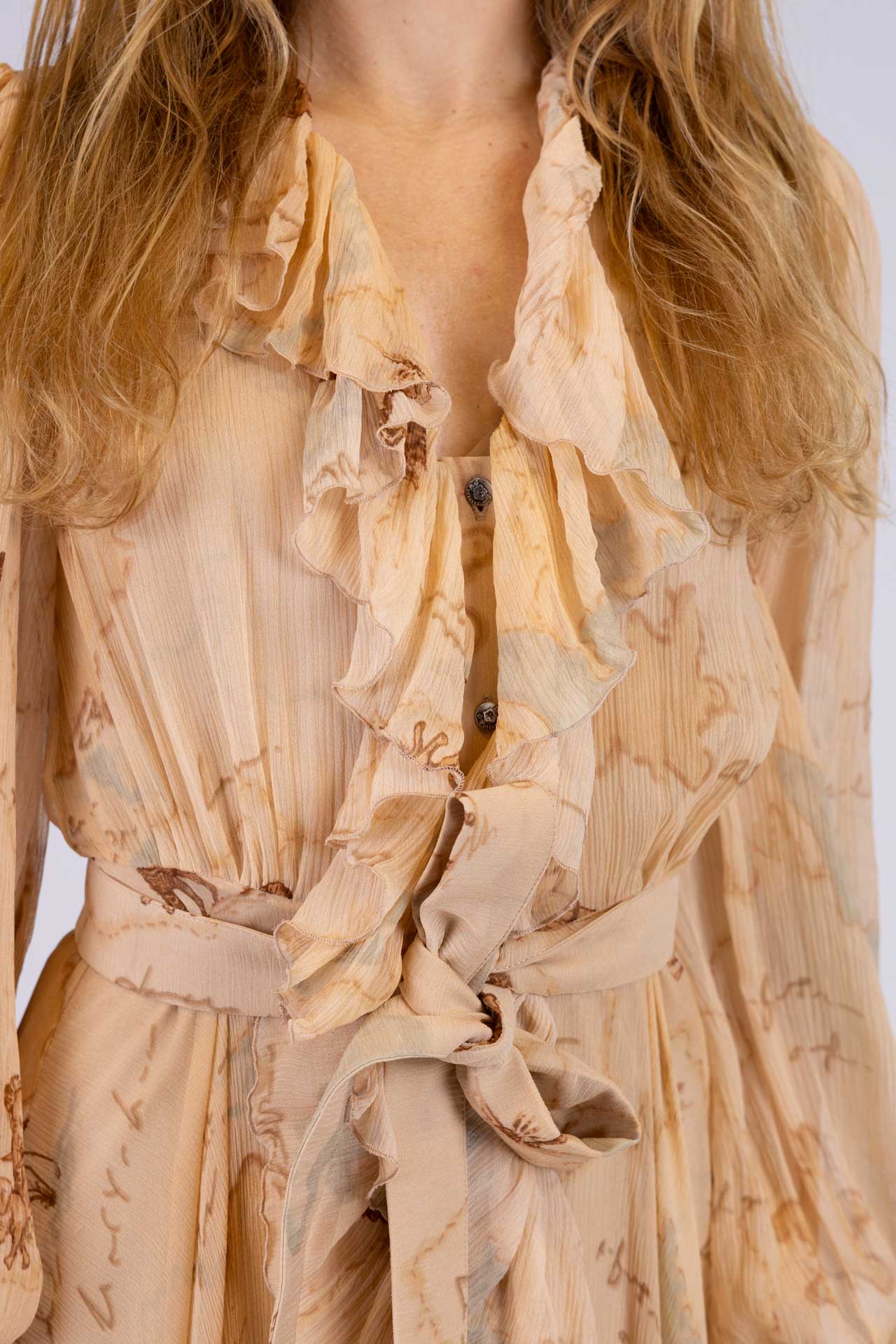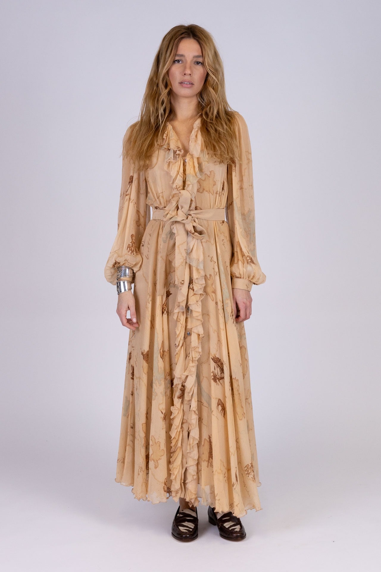 Abito lungo in crepon di seta con corpino arricciato e volant presenti nella scollatura che scendono su tutta la lunghezza dell’abito.