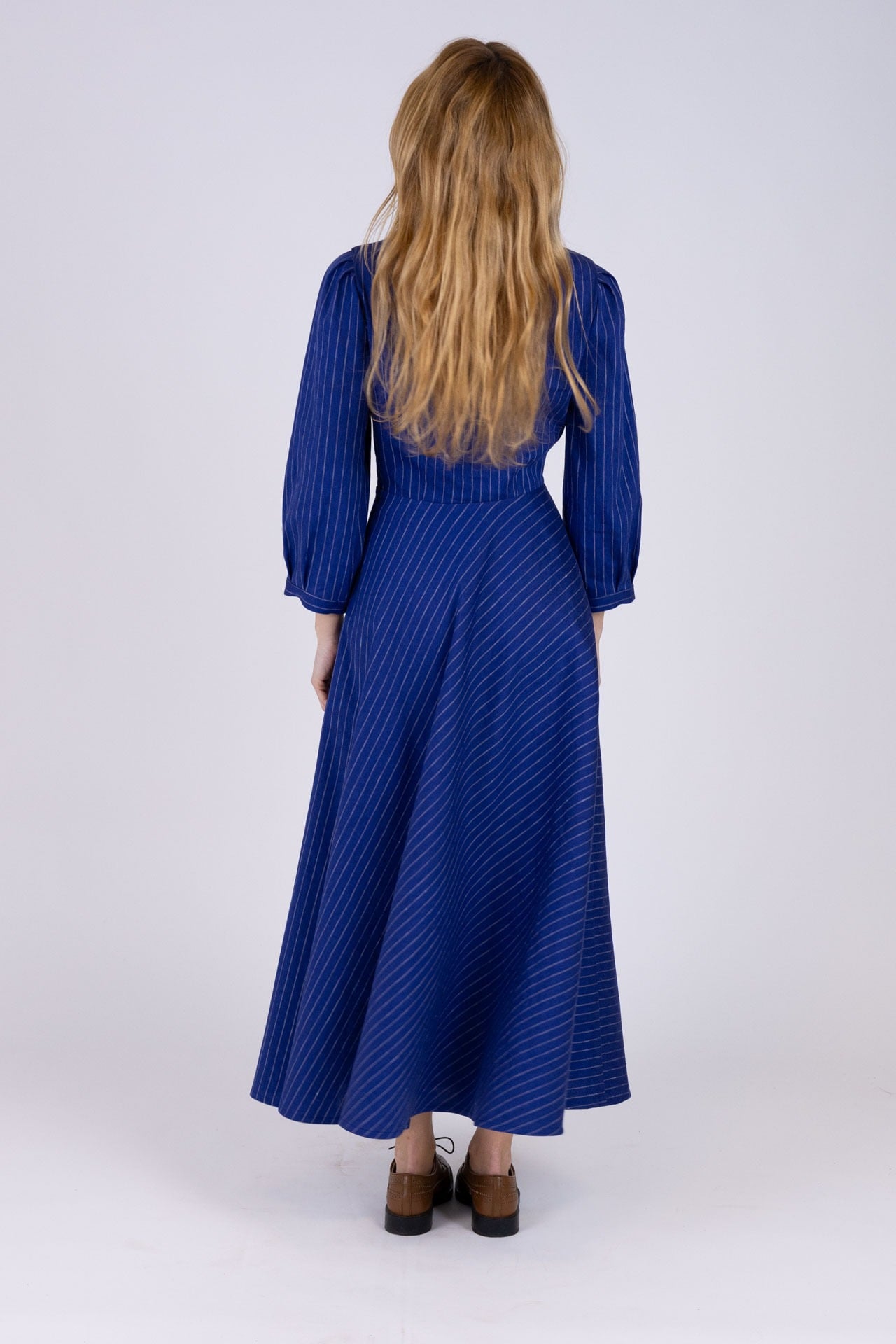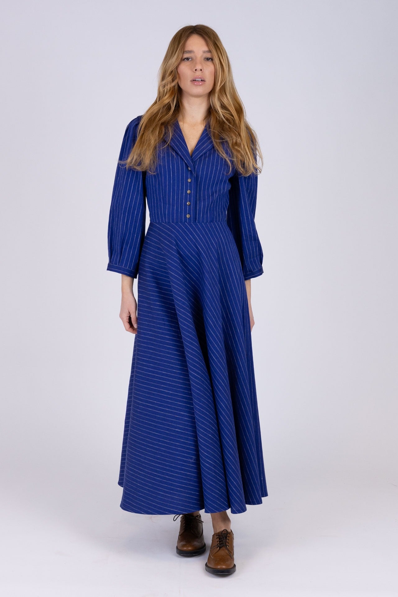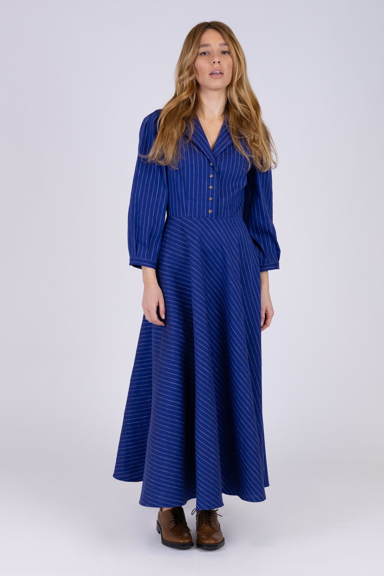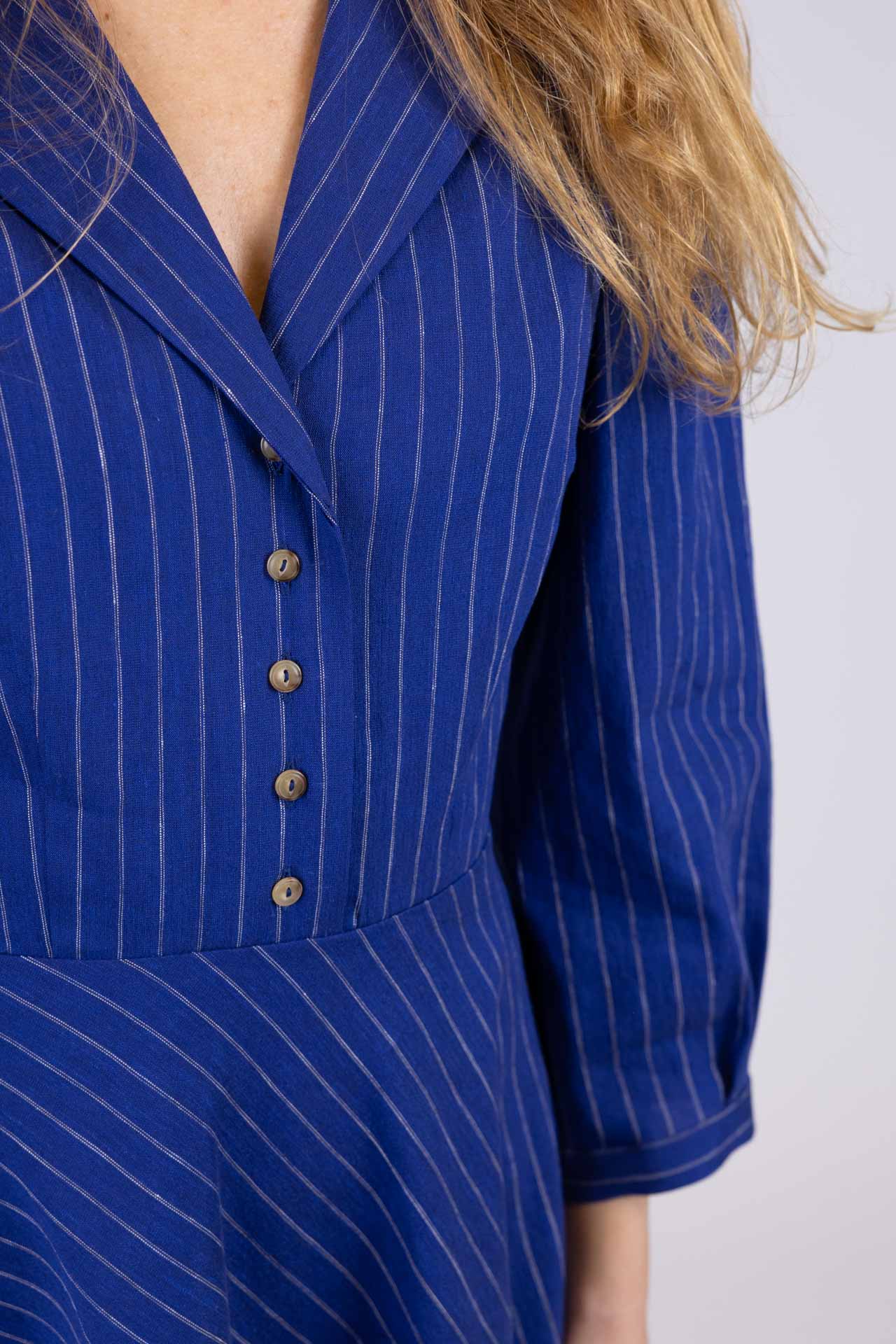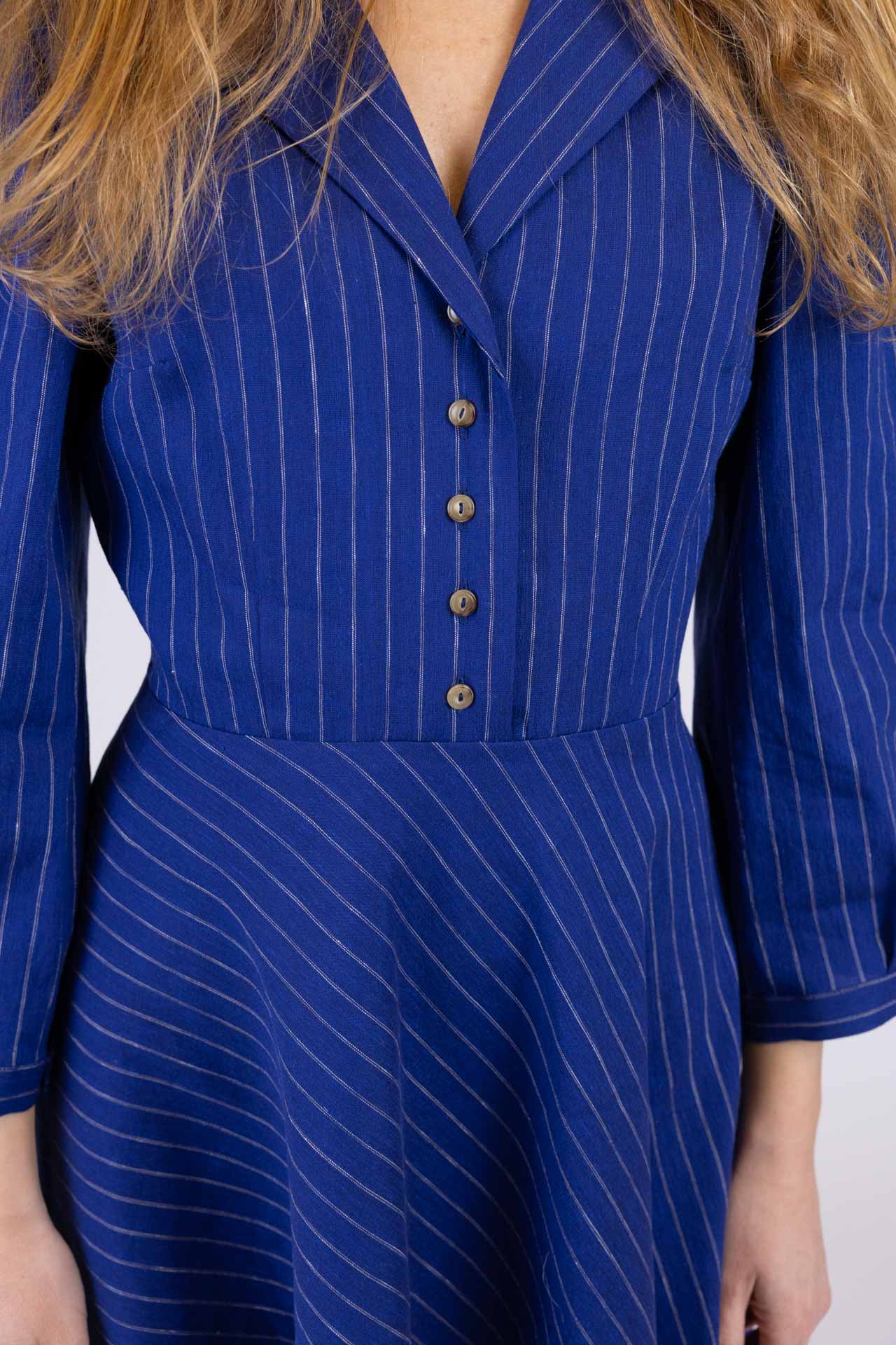 Abito midi realizzato in tessuto gessato lino e viscosa, si distingue per la sua linea impeccabile e la cura dei dettagli. La struttura chemisier, impreziosita da un collo a rever e da un corpino costruito con pinces che esaltano la silhouette, crea un equilibrio perfetto tra sobrietà e femminilità. I cinque bottoncini sul davanti aggiungono un tocco raffinato, sottolineando la sartorialità del capo. Le maniche sono caratterizzate da una spallina leggermente a sbuffo con lunghezza sotto al gomito, terminano con polsino basso e bottoncino . La gonna a 1/4 di ruota, con taglio in diagonale, gioca con le righe del tessuto , creando un movimento armonioso e dinamico che arricchisce la silhouette con leggerezza e fluidità. La qualità dei materiali e la precisione del taglio trasformano questo abito in un’icona di stile, capace di valorizzare chi lo indossa con grazia e sicurezza.