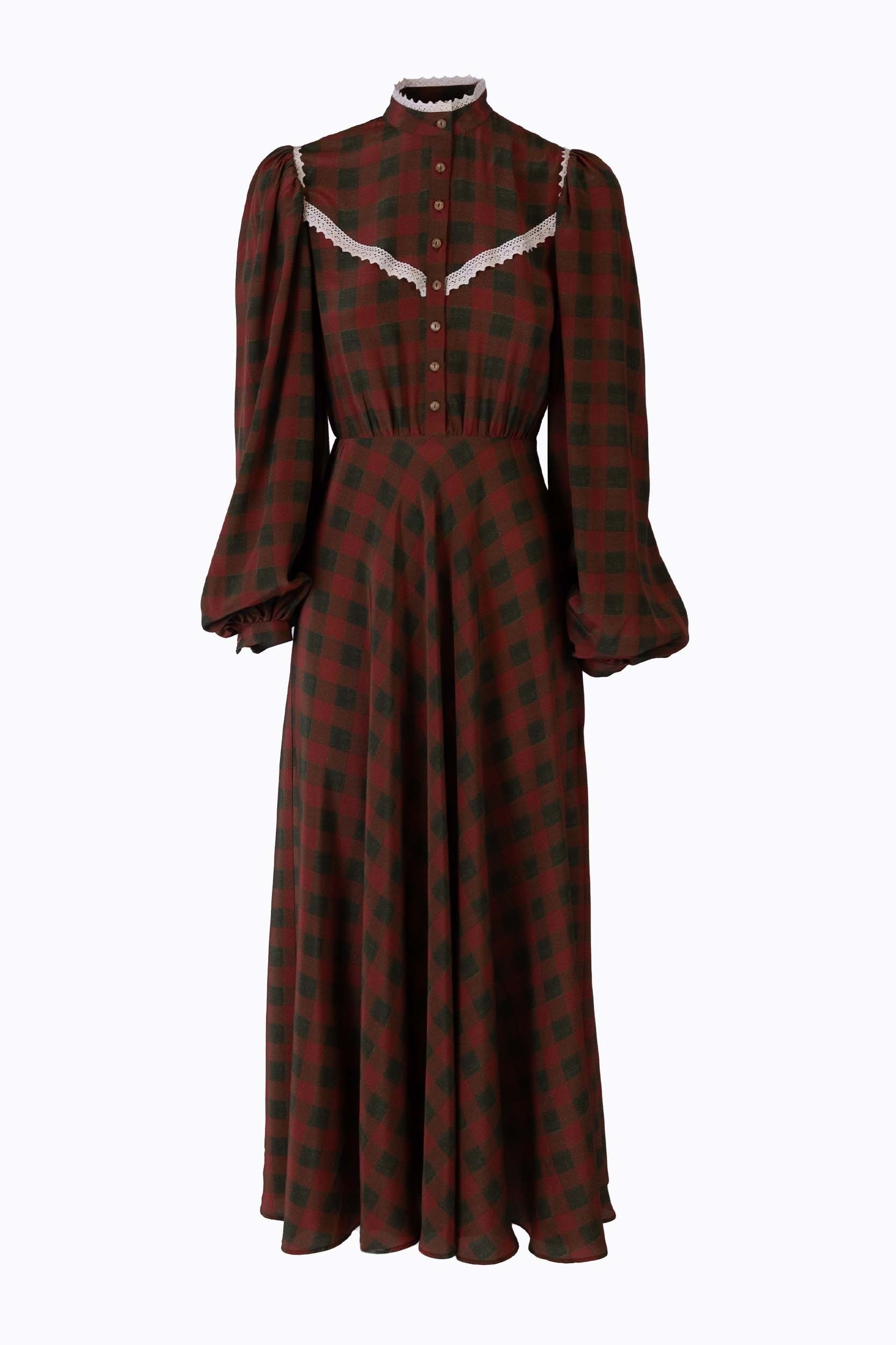 Il corpino è arricchito da bottoncini di colore neutro e inserti in pizzo di cotone color avorio, che disegnano il busto con raffinata leggerezza. Il colletto alla coreana, anch’esso impreziosito da un bordo in pizzo, incornicia il volto con discreta eleganza, evocando suggestioni romantiche e senza tempo.
