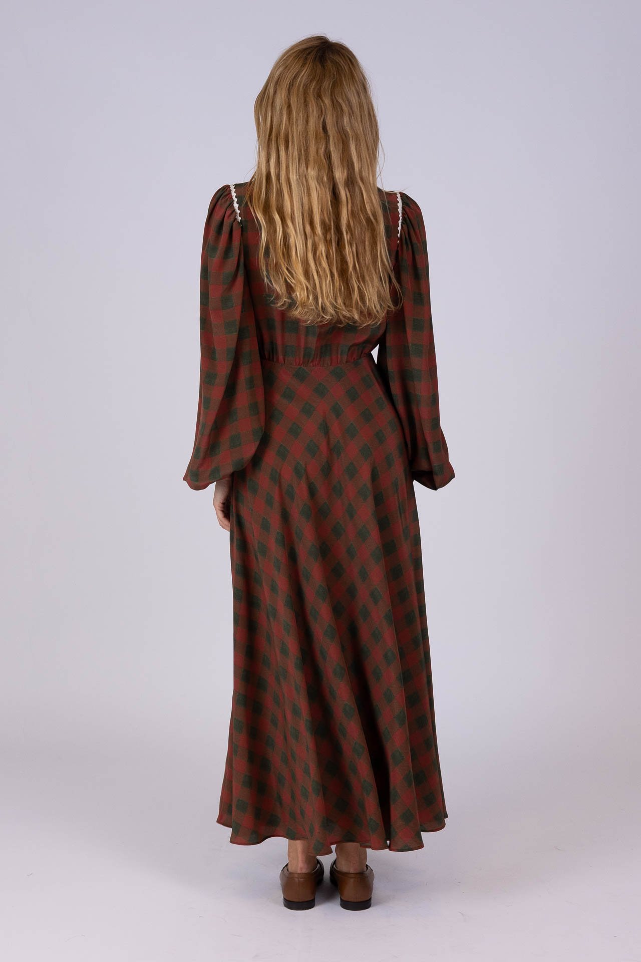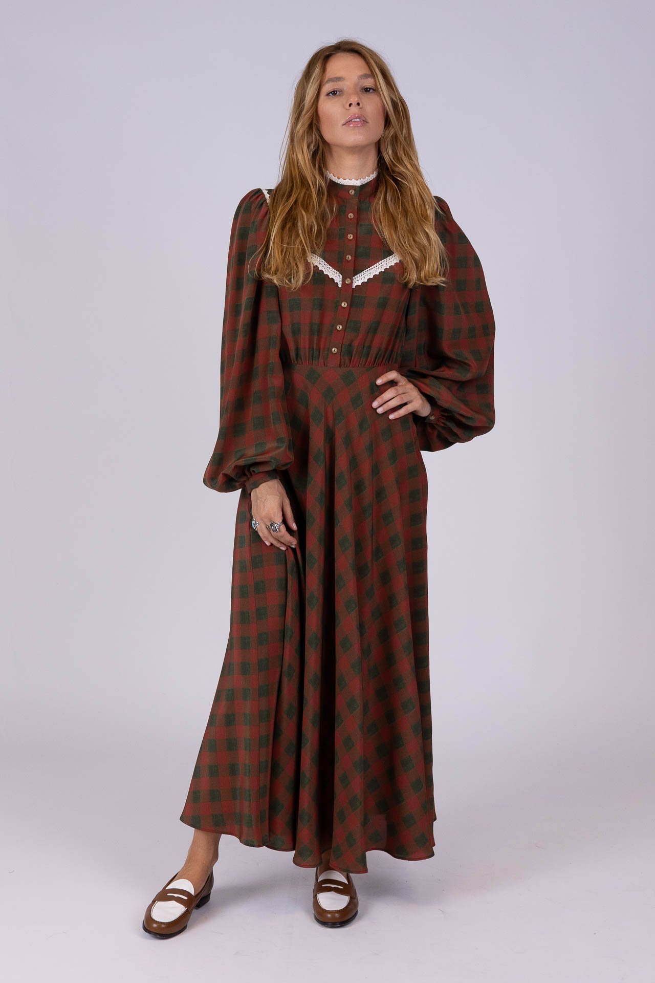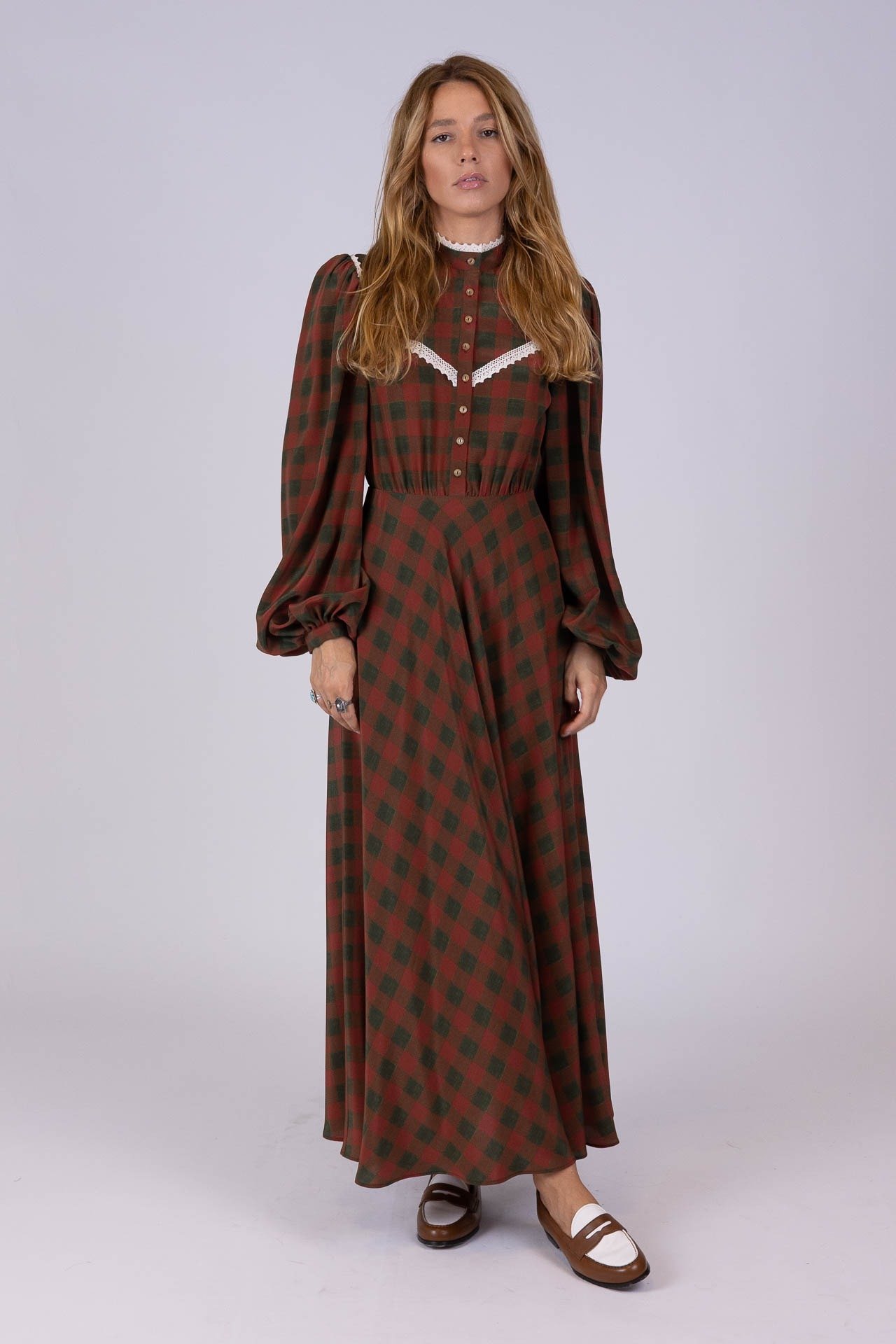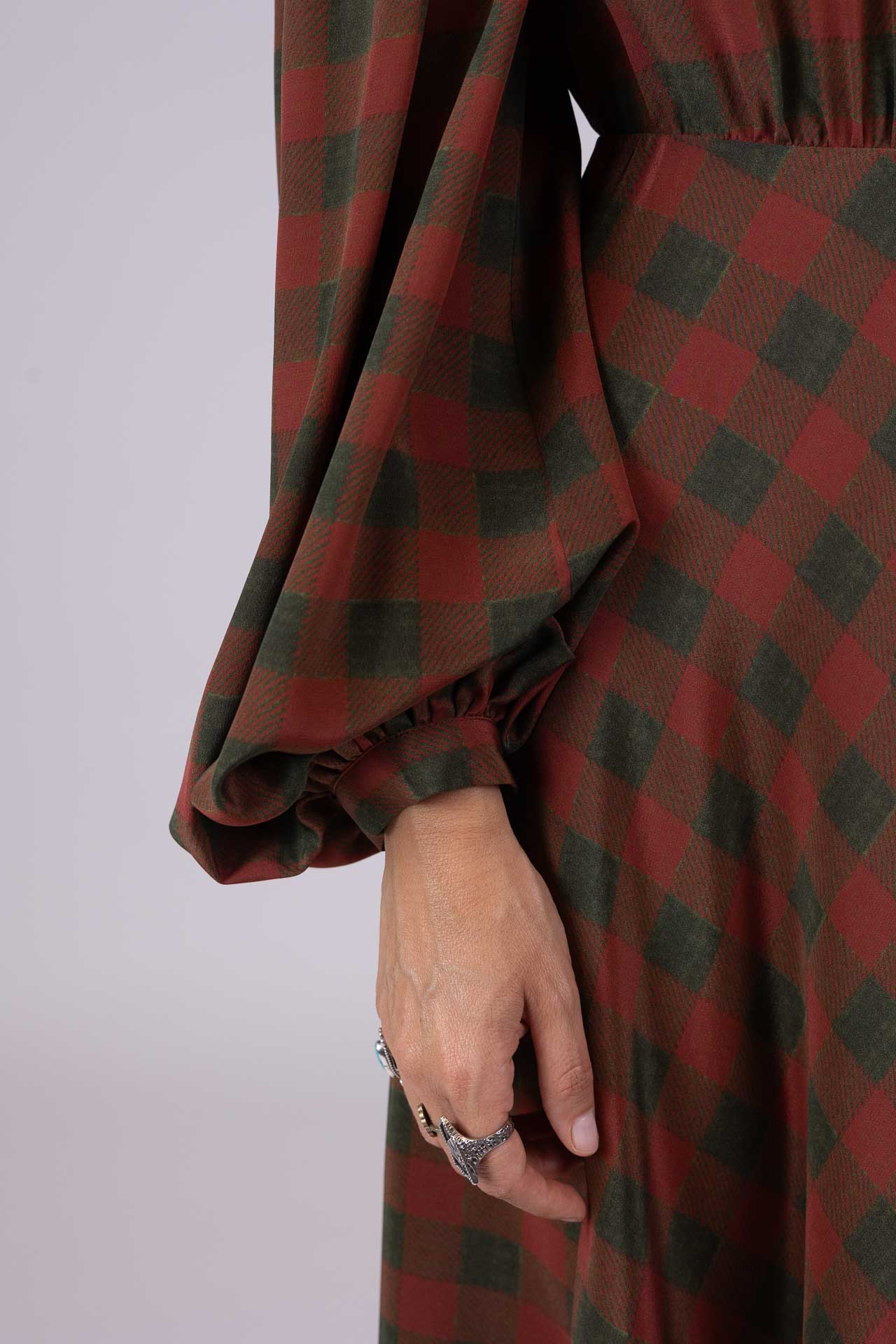 Modello morbido con vita a misura, maniche e gonna ampie.