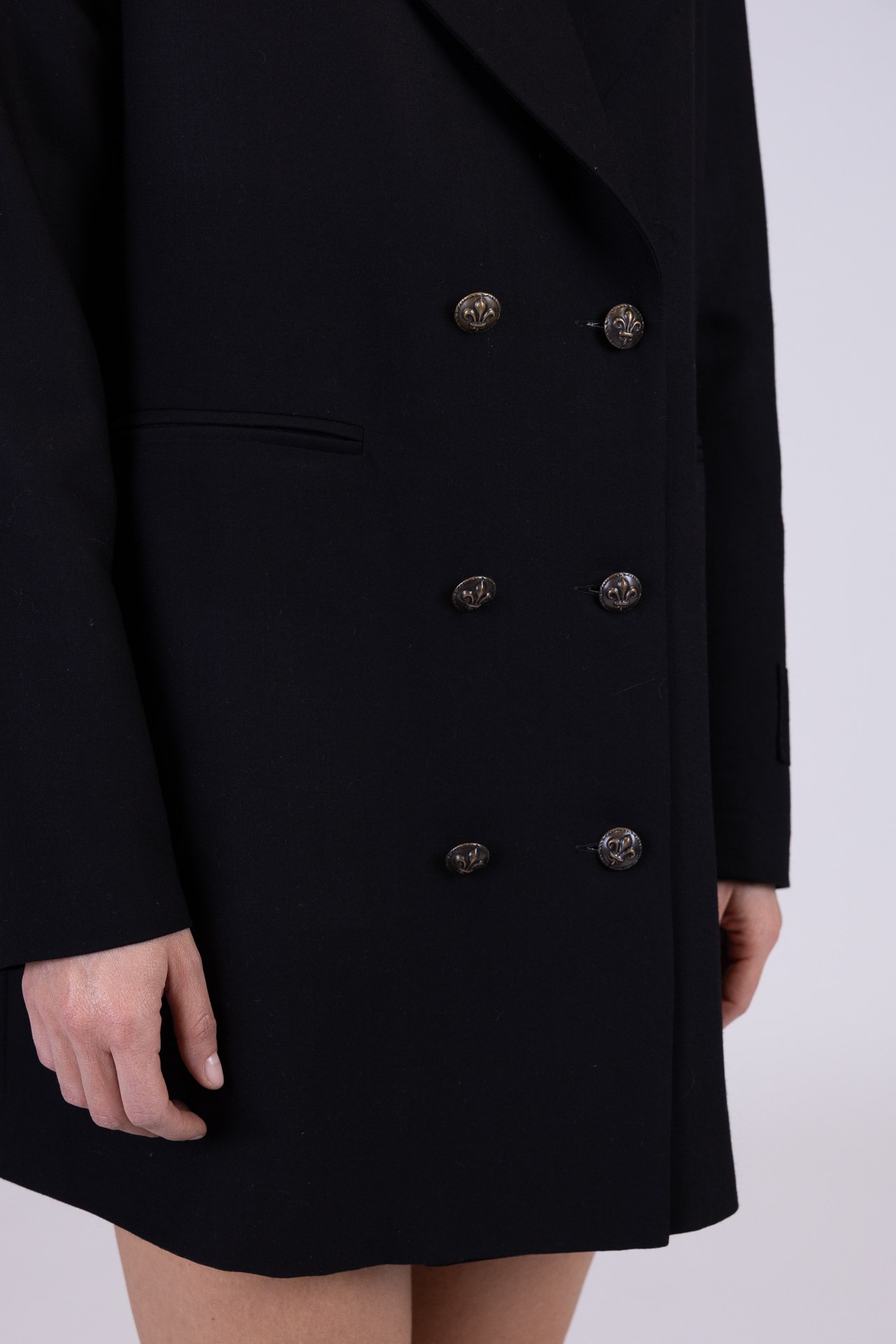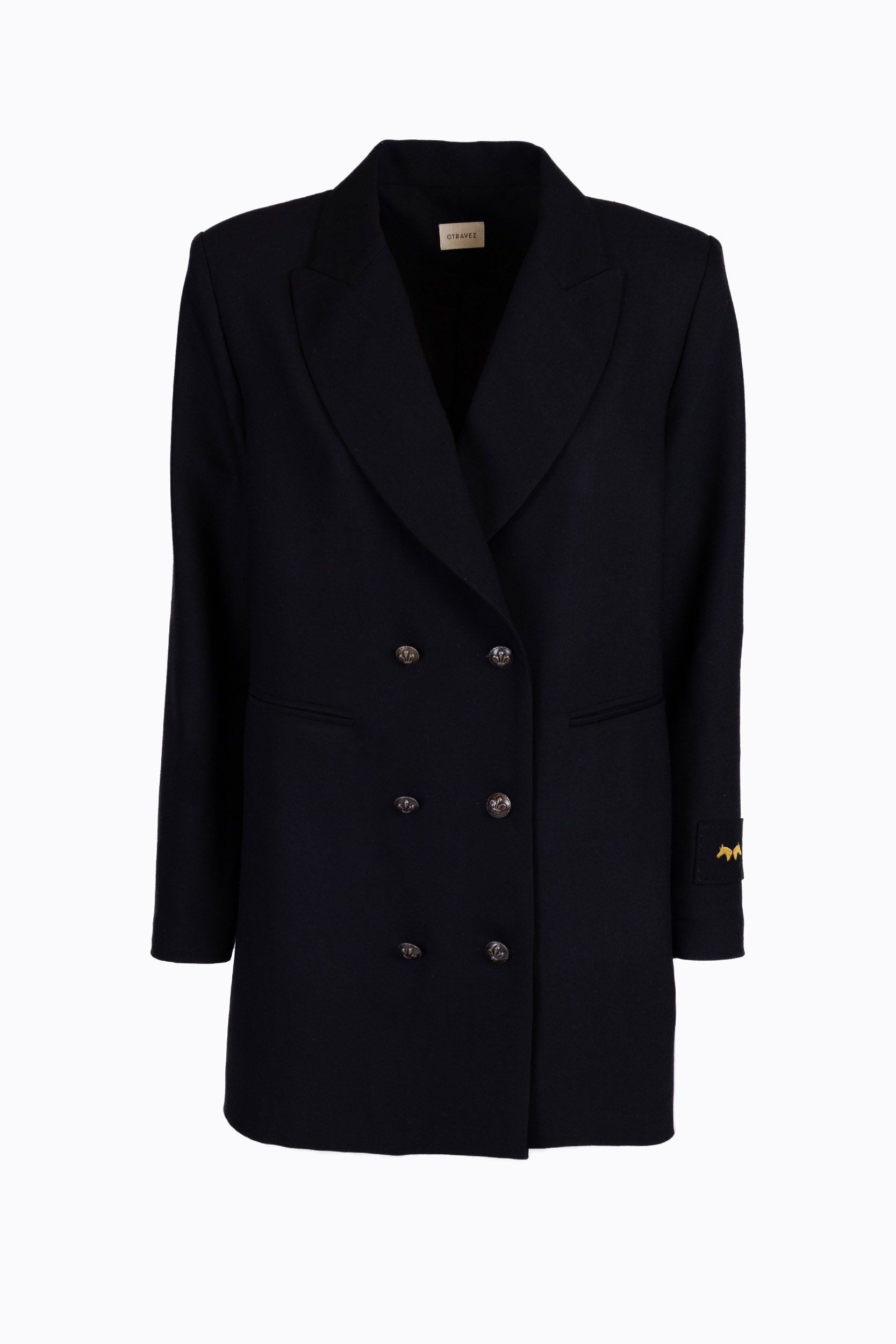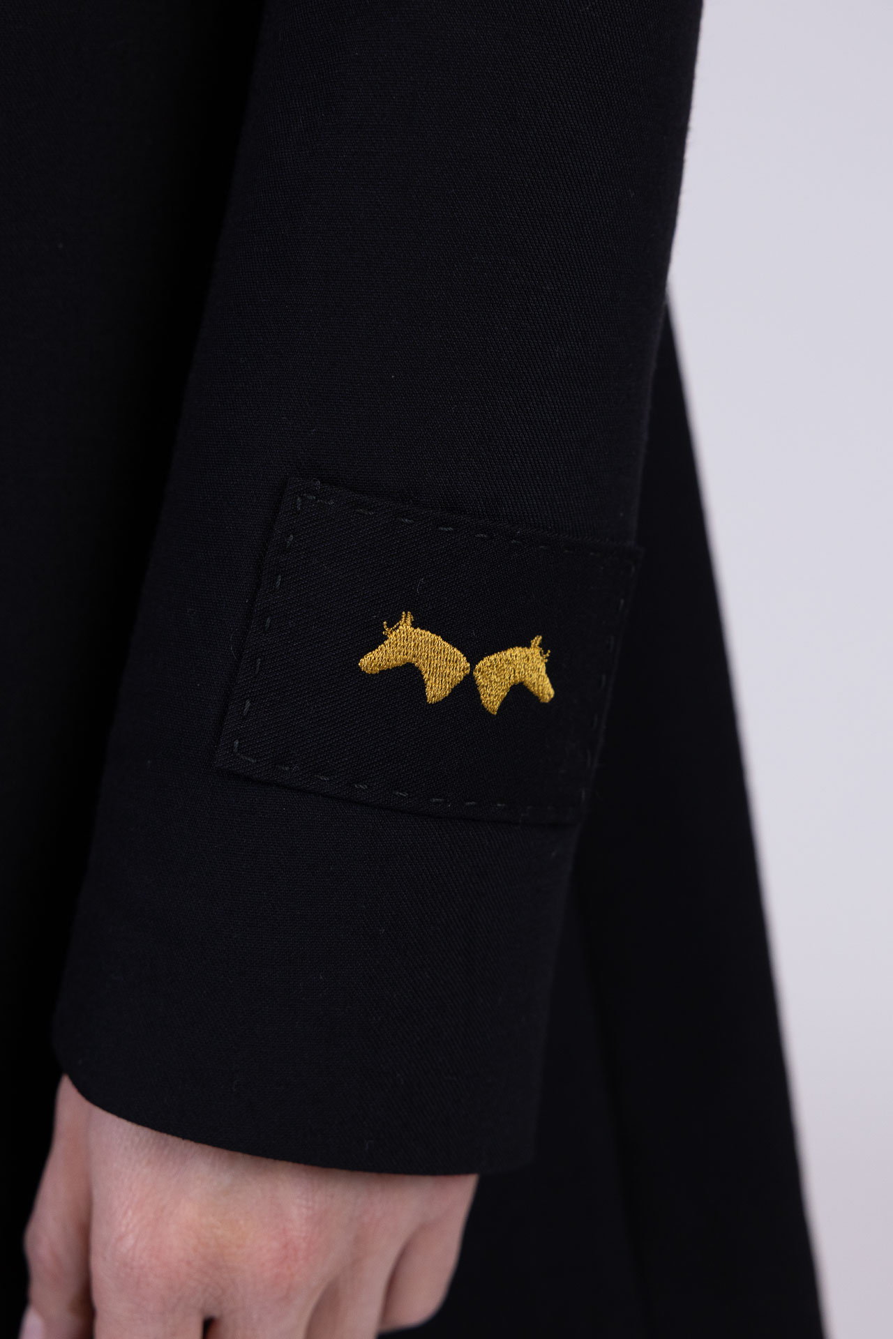 Gli otto bottoni frontali e il rever classico definiscono una linea pulita e armoniosa, mentre le spalline strutturate donano equilibrio e carattere. Sulla manica sinistra, un ricamo dorato con due teste di cavallo impreziosisce il capo con un dettaglio artigianale unico.