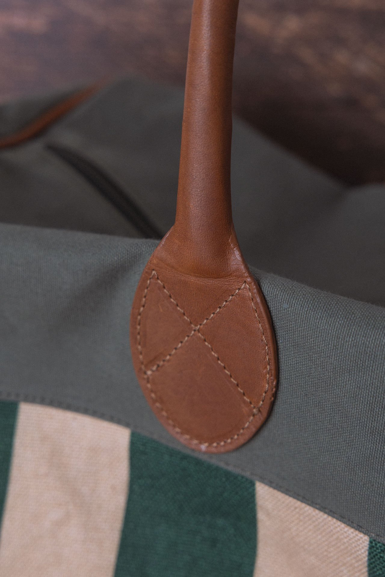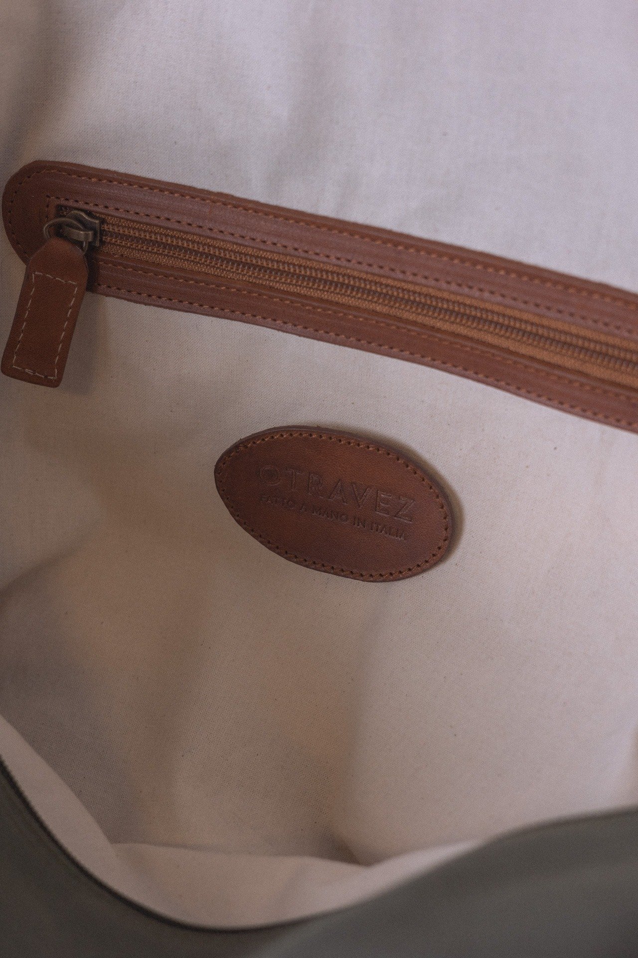 I manici e i dettagli in pelle color cuoio, applicati con cura artigianale, aggiungono struttura e pregio al modello. La lunghezza dei manici è studiata per permettere di portare il borsone comodamente sottobraccio, garantendo praticità e comfort negli spostamenti.