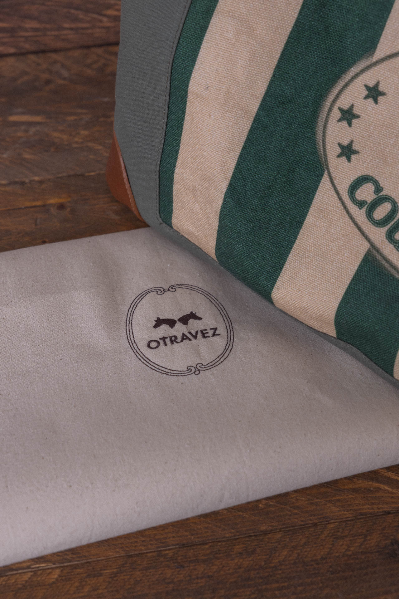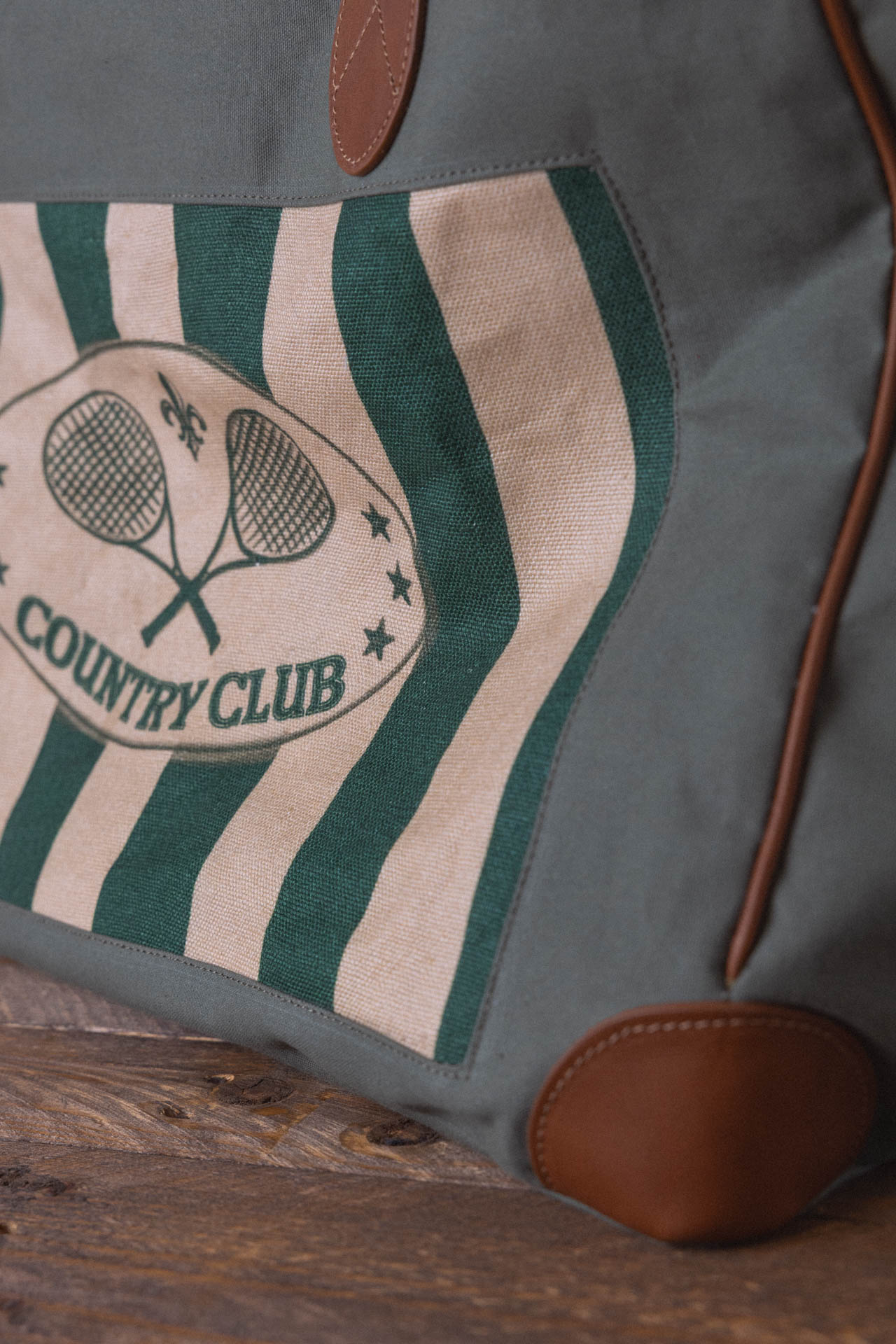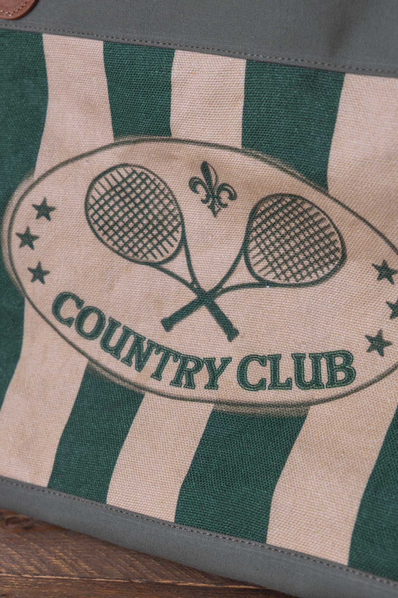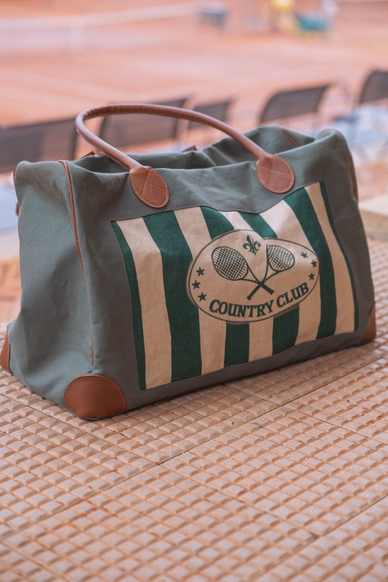Realizzato in resistente tessuto nei toni del verde militare, è impreziosito da un pannello frontale a righe verticali verde foresta e avorio, che richiama i codici iconici della collezione. Al centro, la stampa evocativa “Country Club” con racchette incrociate rafforza l’immaginario sportivo dal fascino vintage, diventando il segno distintivo del design.