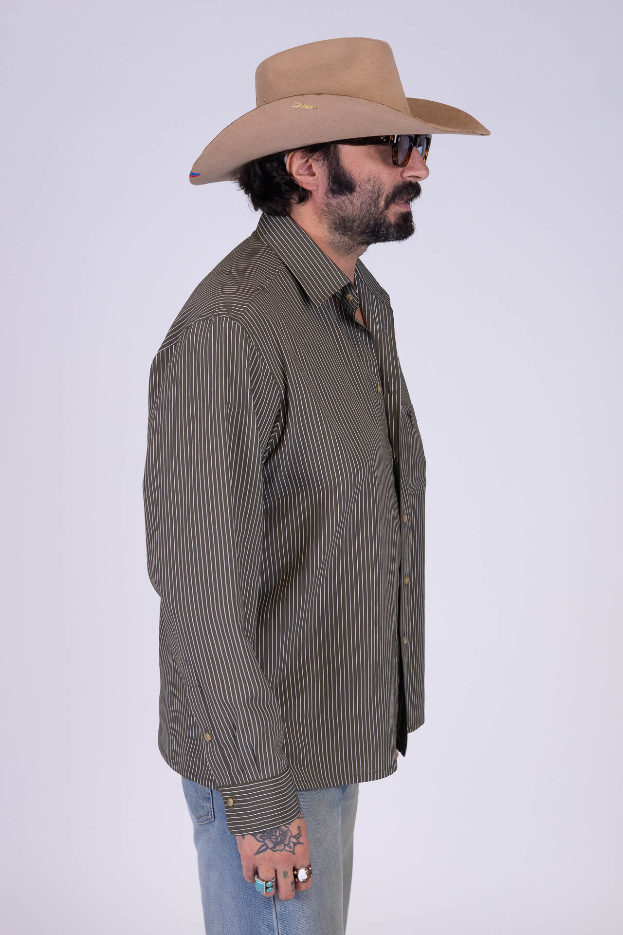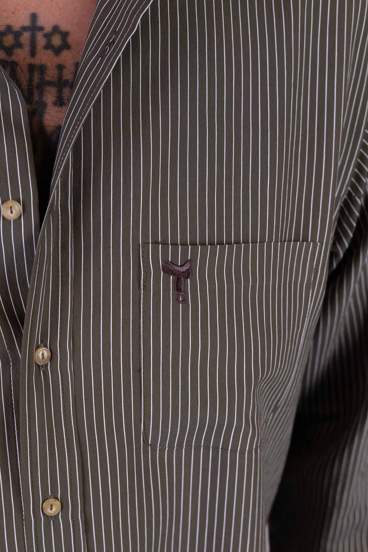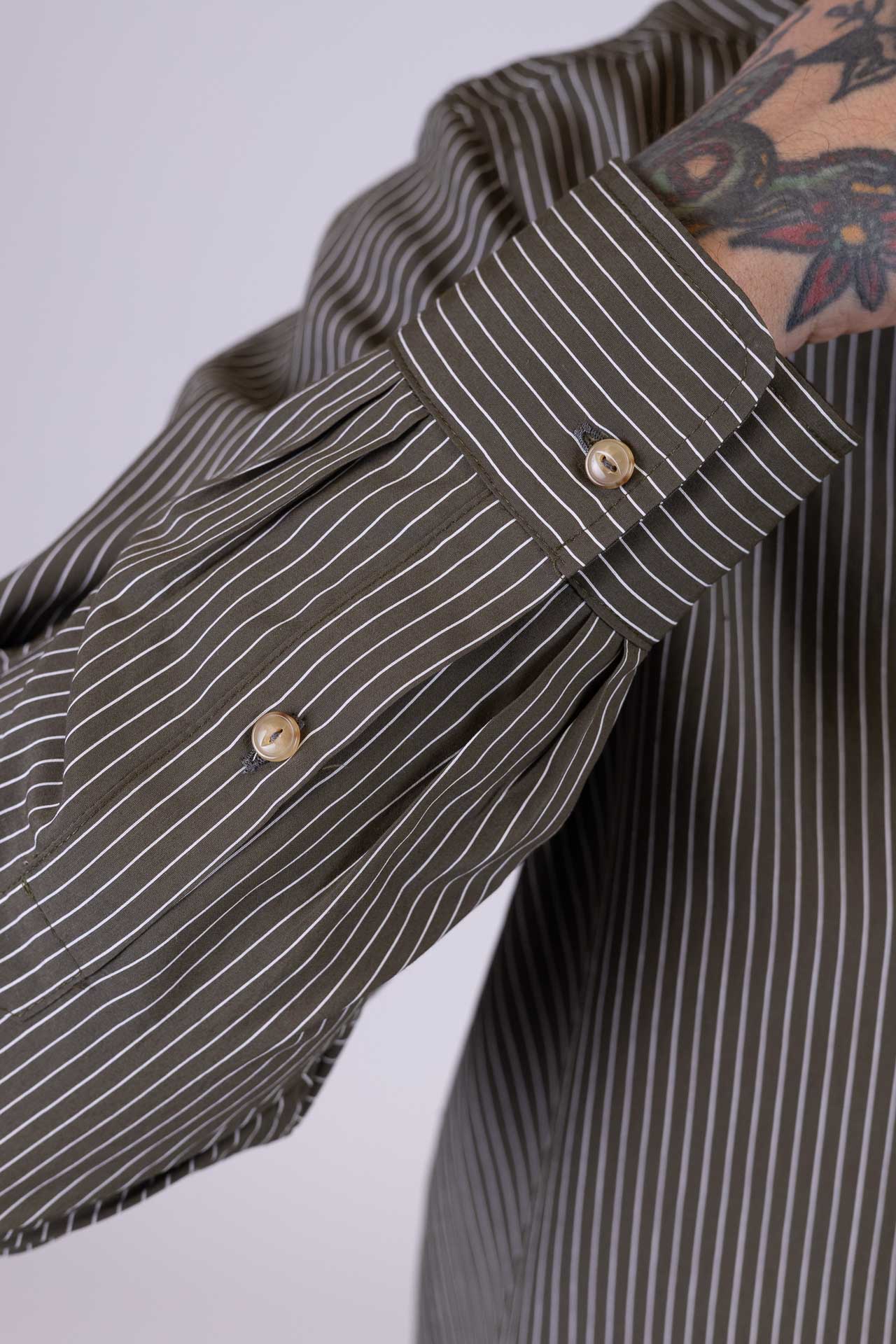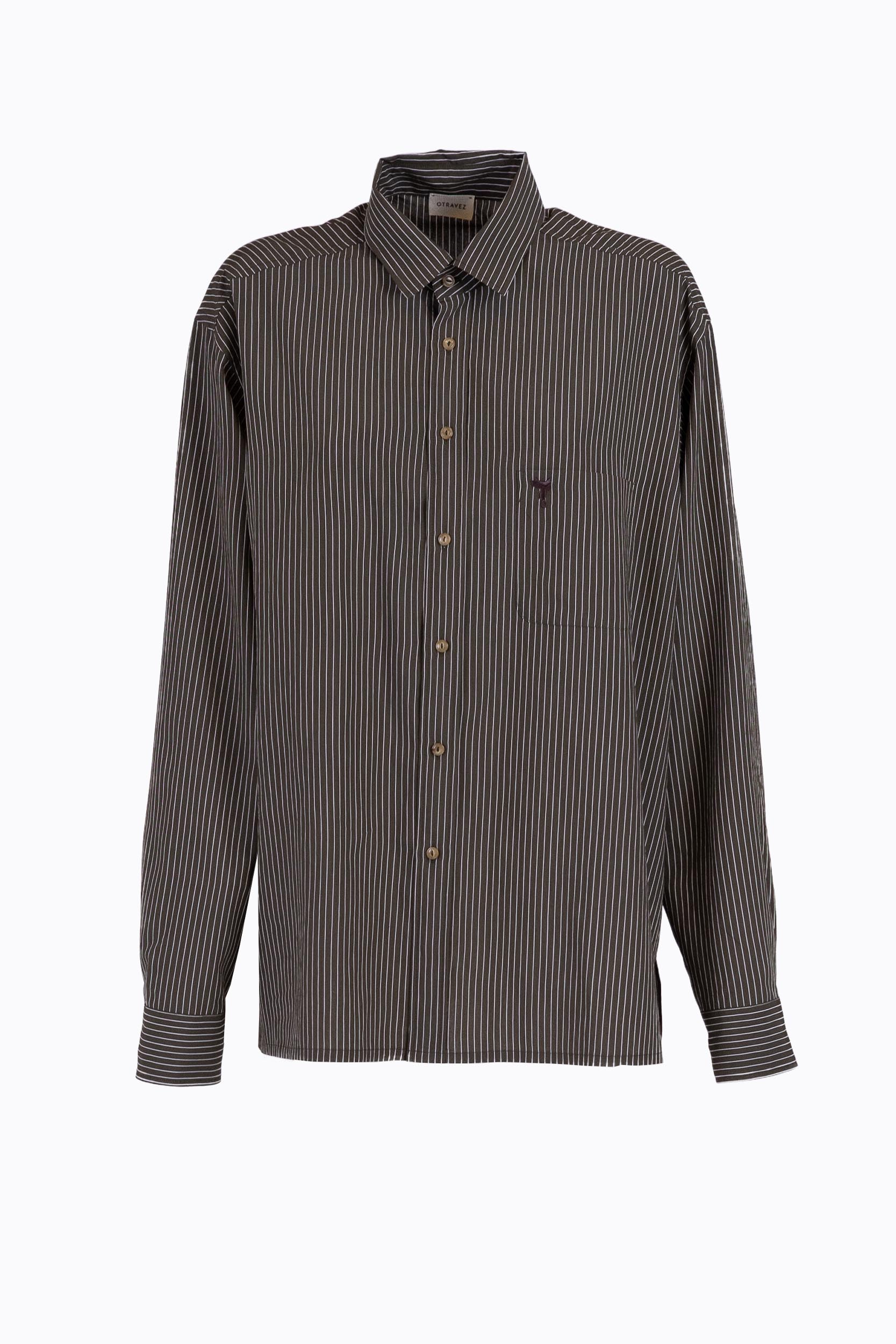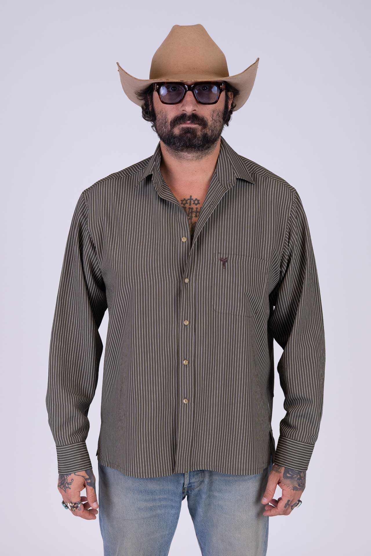 Questa camicia unisex, con abbottonatura a uomo e righe verticali, unisce eleganza e carattere in un unico design. Il taschino frontale sinistro, caratterizzato da un ricamo marrone di una sella di cavallo, raccontano una storia di passione fin dalle sue radici, mentre le linee verticali slanciano la figura. I polsini sono leggermente stondati e arricchiti da bottoncini in pasta naturale. Un capo di cui non potrai più fare a meno.