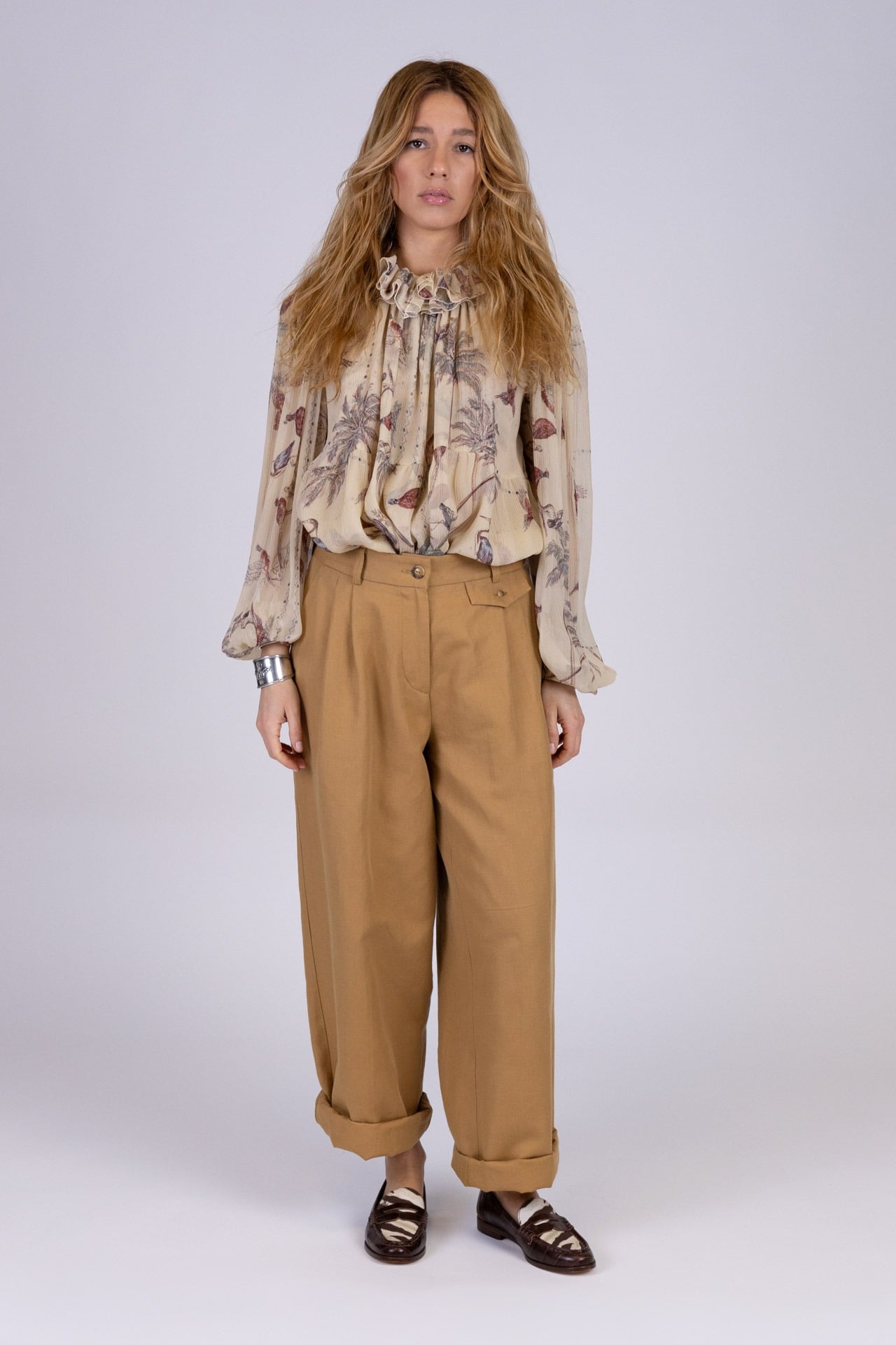 Le maniche ampie e leggermente arricciate completano la silhouette con armonia, creando una linea ariosa e sofisticata.