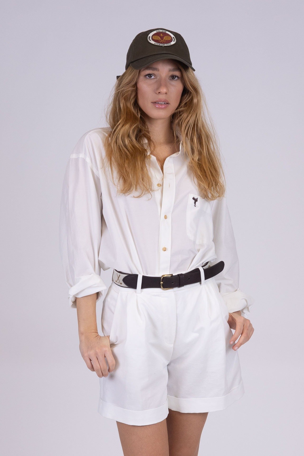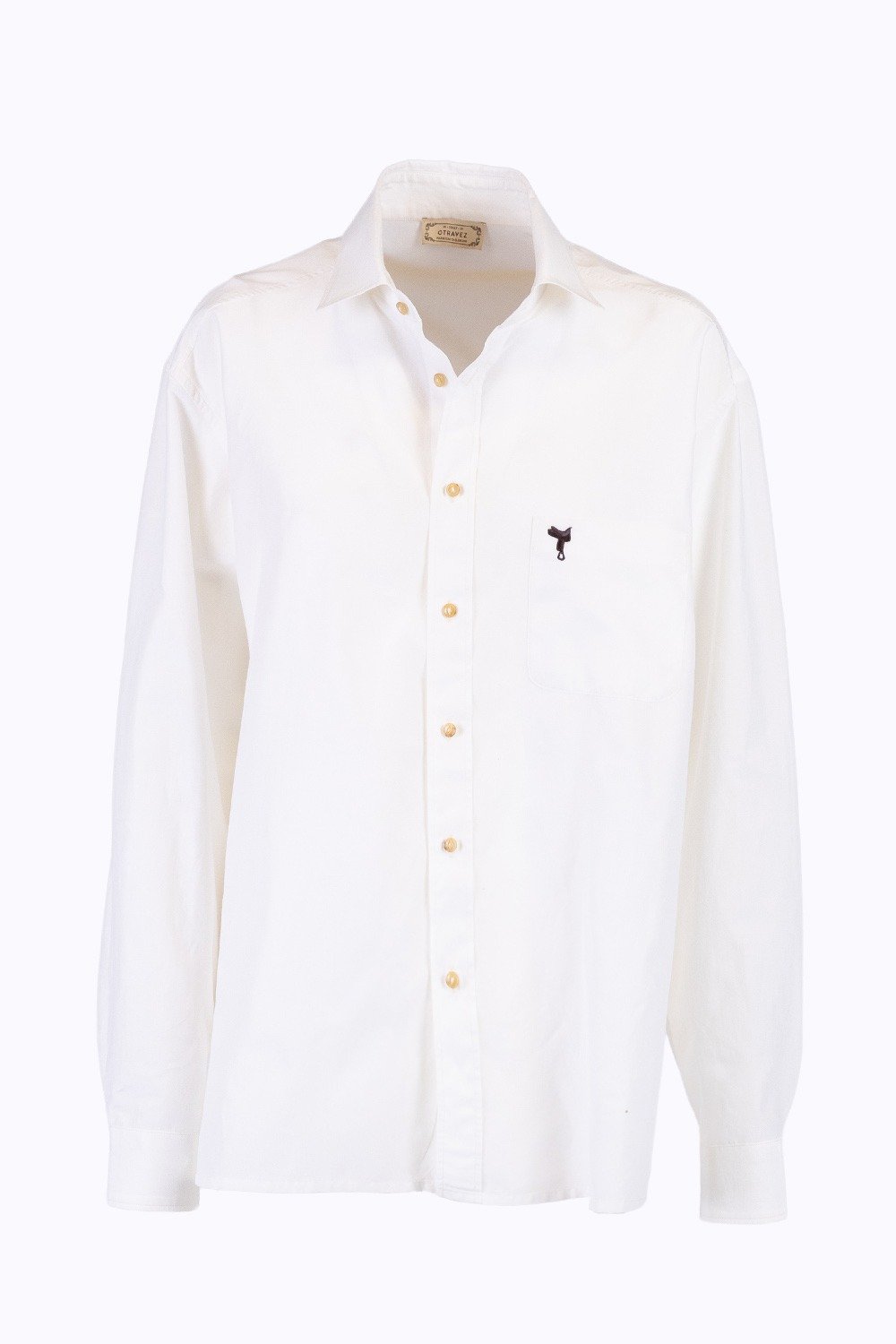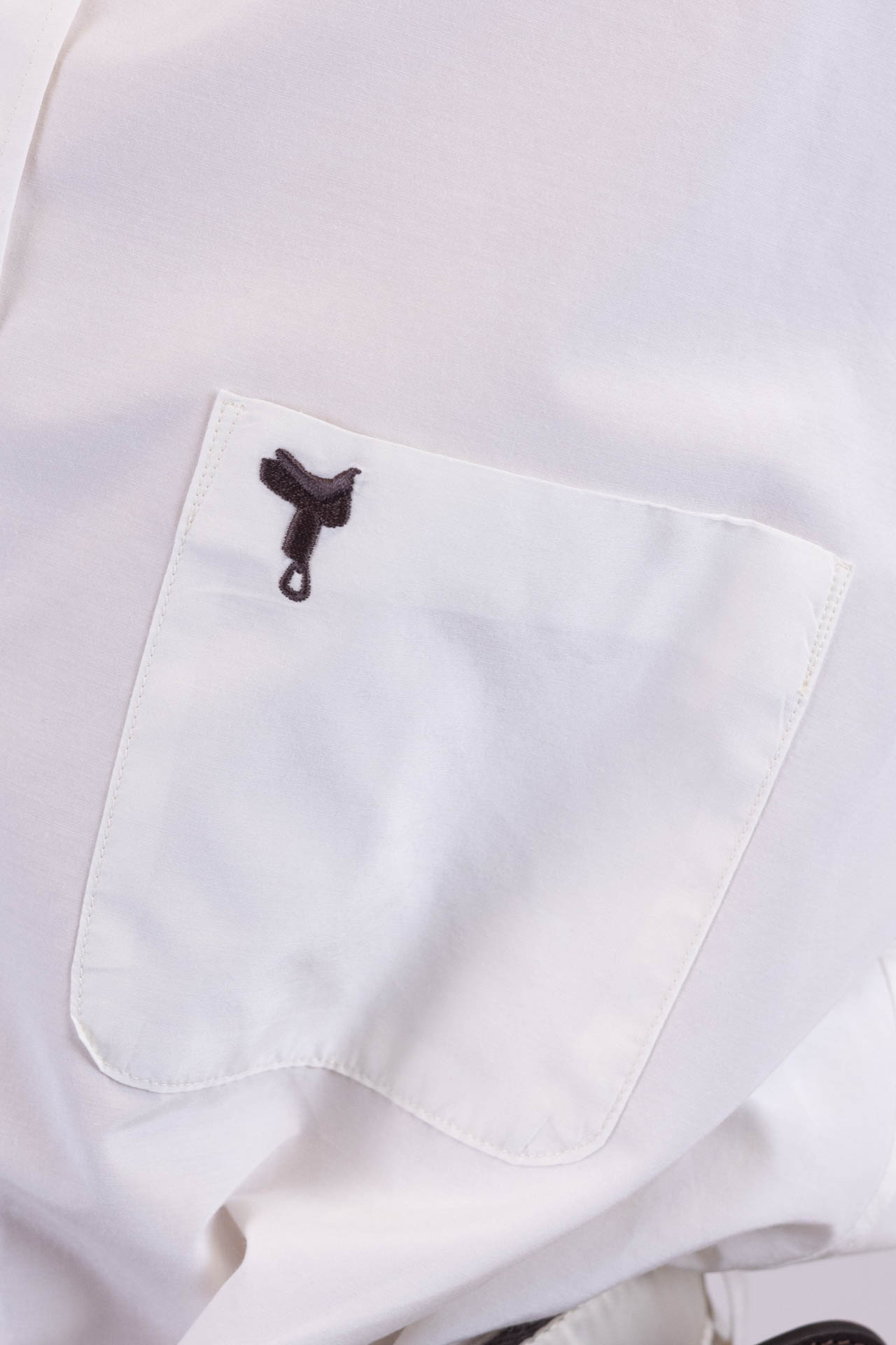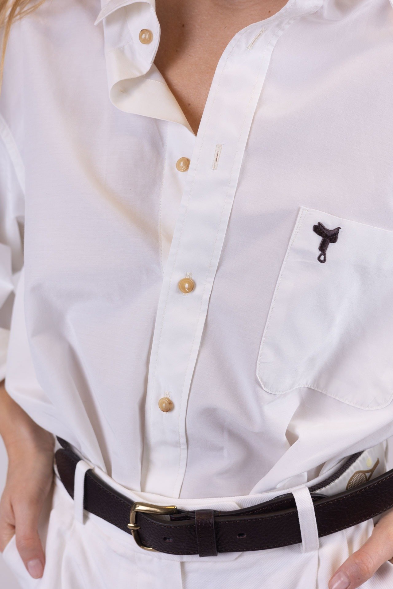 Questa camicia unisex, con abbottonatura a uomo e realizzata in un morbido e luminoso tessuto misto seta e cotone di colore bianco, unisce eleganza e personalità in un design essenziale e raffinato. Il taschino frontale sinistro, impreziosito dal ricamo marrone di una sella di cavallo, diventa un dettaglio iconico che evoca una storia di passione e radici autentiche.