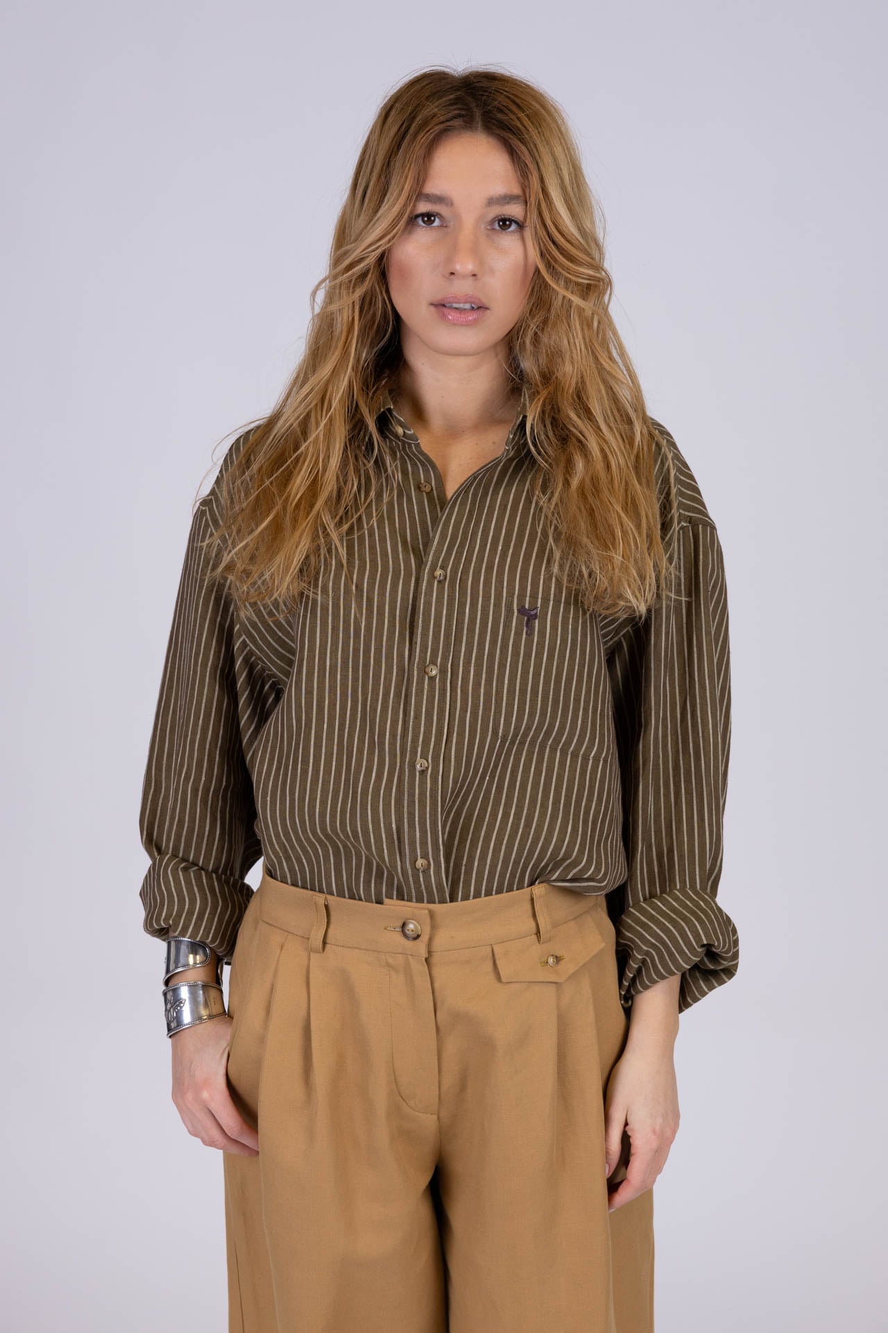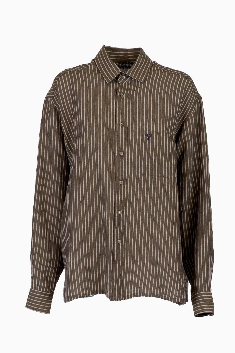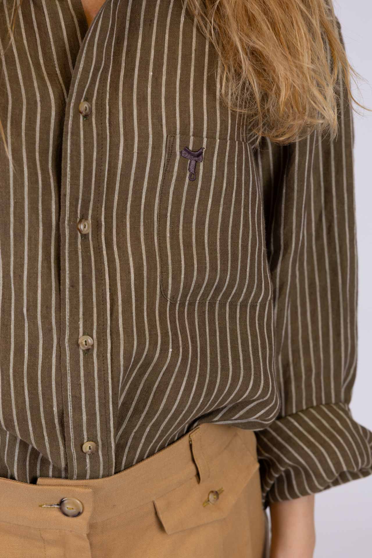 Questa camicia unisex, con abbottonatura a uomo e realizzata in un morbido e luminoso tessuto misto seta e cotone di colore bianco, unisce eleganza e personalità in un design essenziale e raffinato. Il taschino frontale sinistro, impreziosito dal ricamo marrone di una sella di cavallo, diventa un dettaglio iconico che evoca una storia di passione e radici autentiche.
