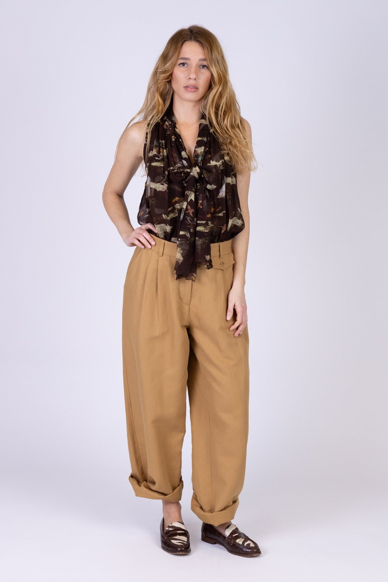 Lo scollo a goccia definisce con discrezione la linea del décolleté, mentre il foulard integrato diventa un elemento distintivo da annodare liberamente, aggiungendo carattere e versatilità al capo.