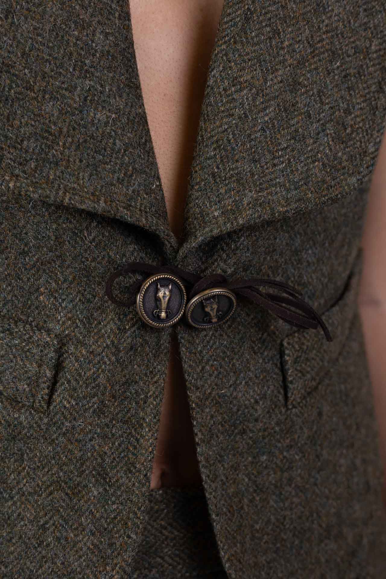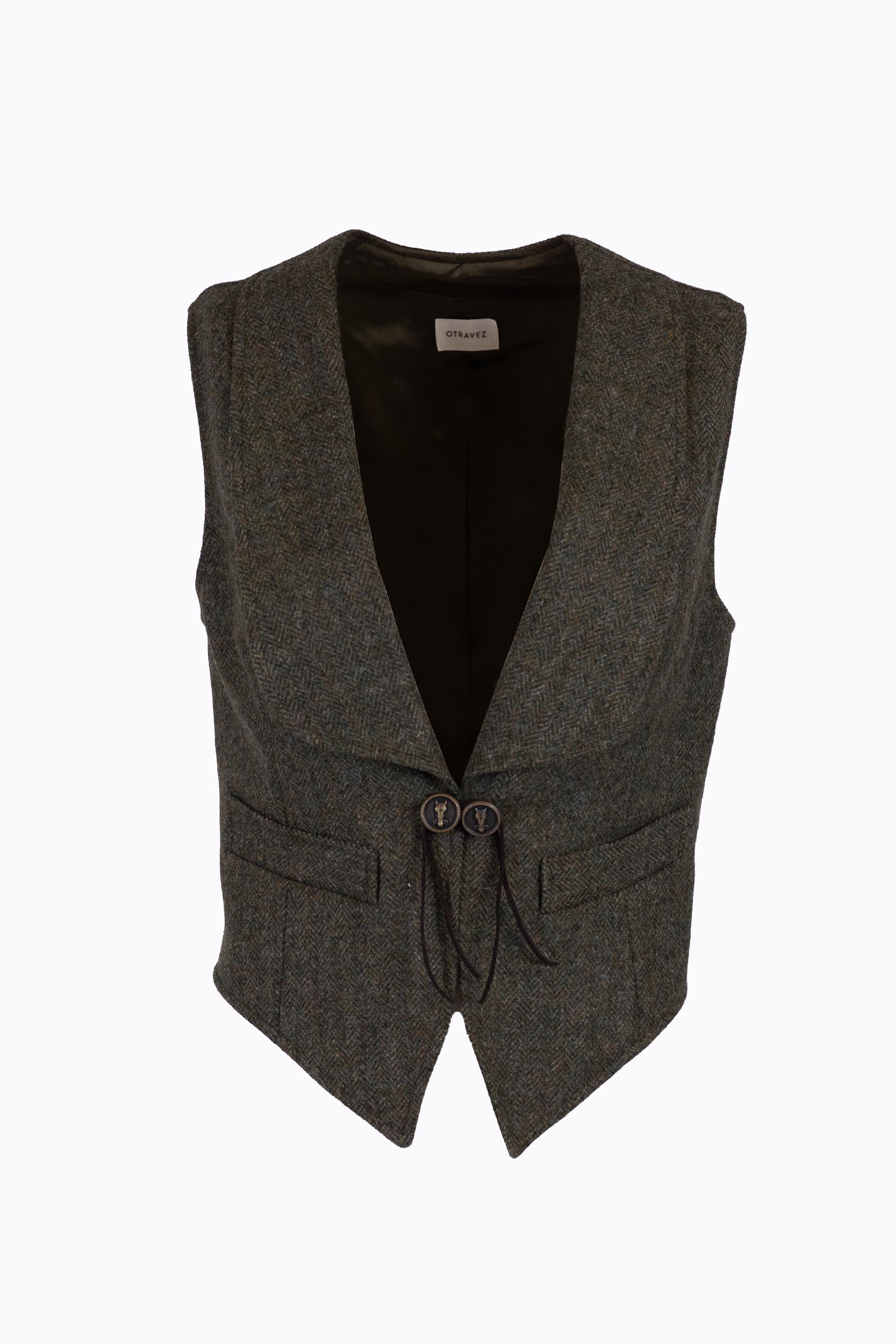 Gilet realizzato in 100% lana inglese con rever . Dietro con carré dal motivo a punta. Davanti senza incrocio con punti; motivo a doppi bottoni in metallo anticati cavallo, annodati da un laccio in pelle marrone.