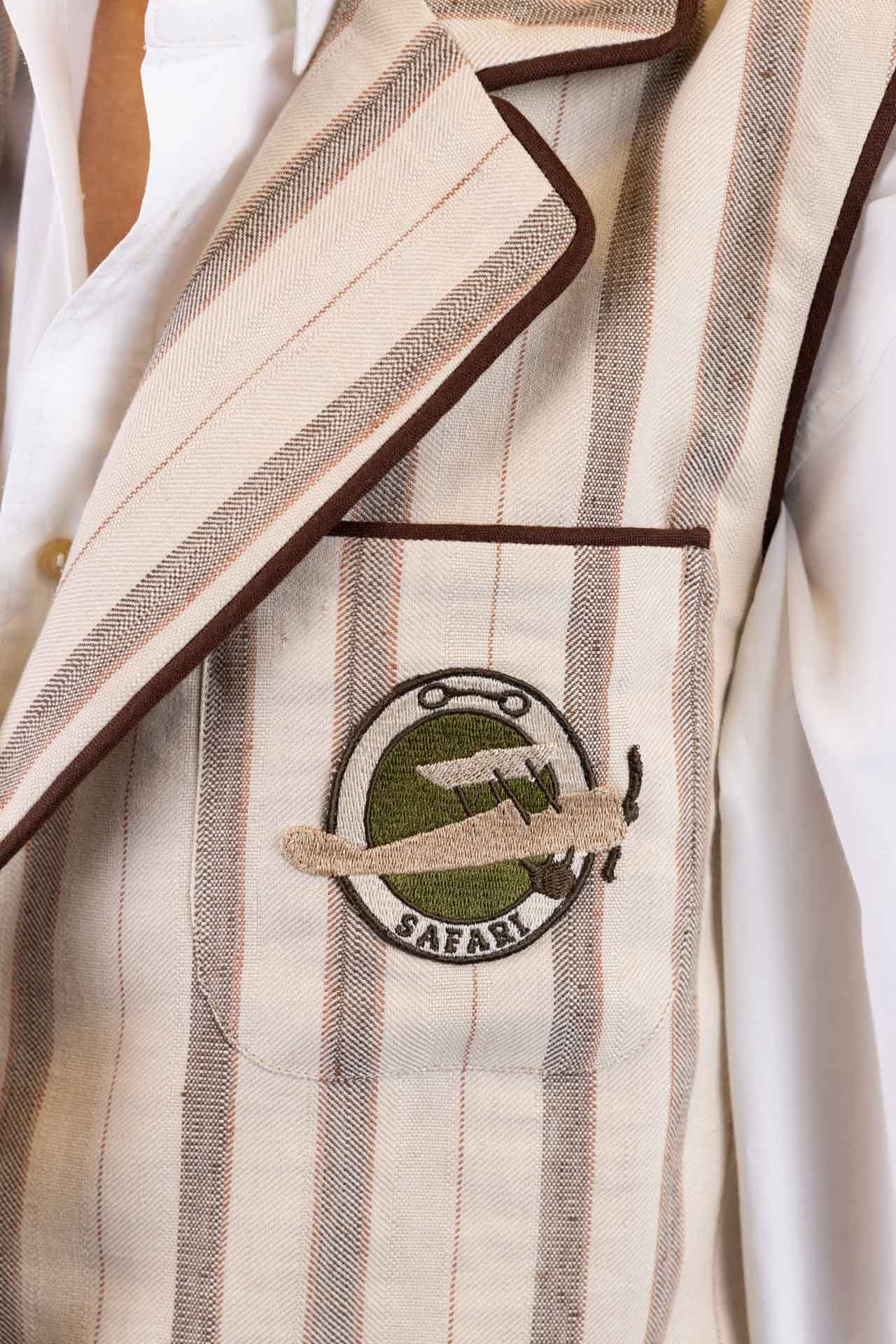 Il patch ricamato sulla tasca, raffigurante un aereo, richiama l’immaginario del viaggio e aggiunge un elemento narrativo distintivo.