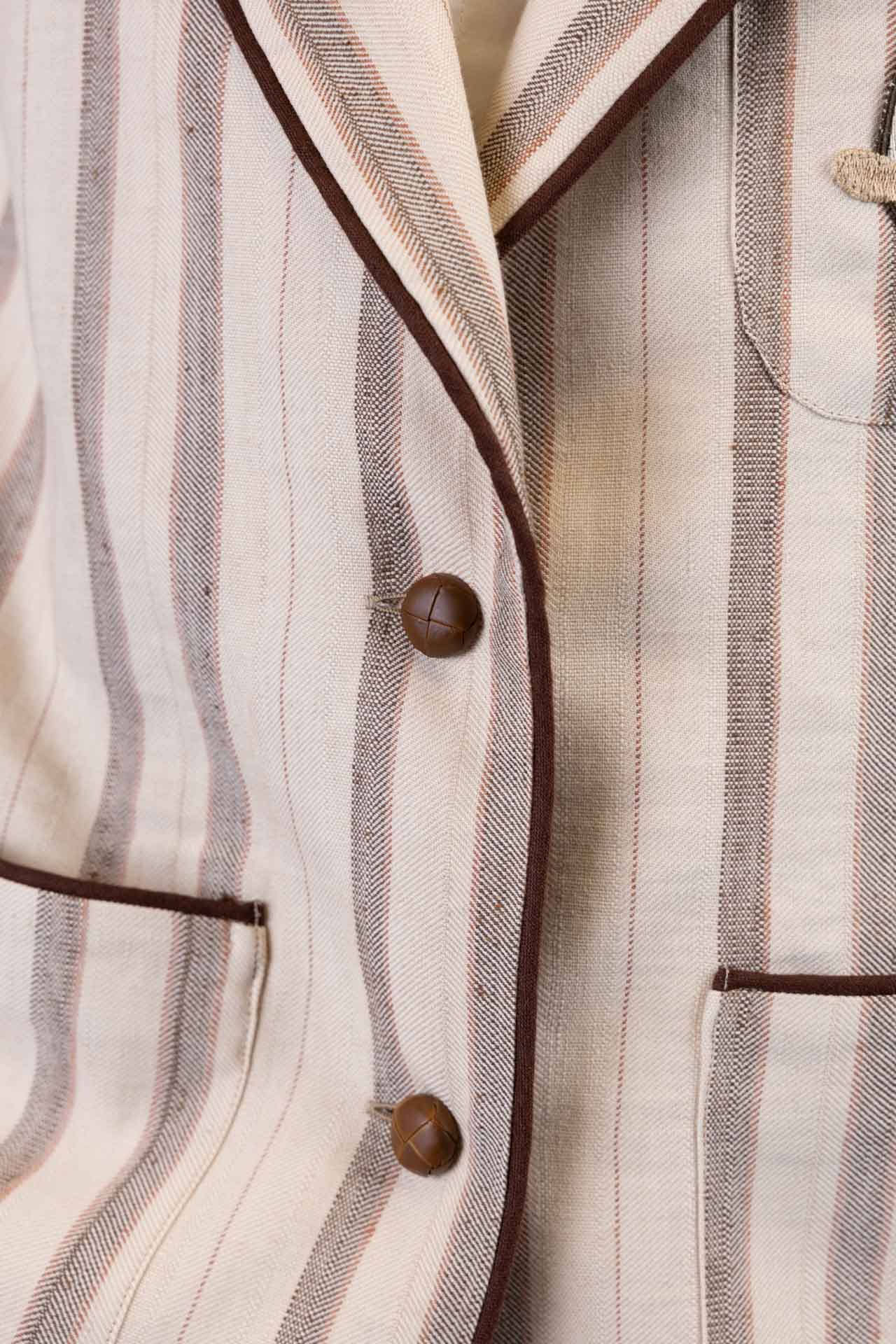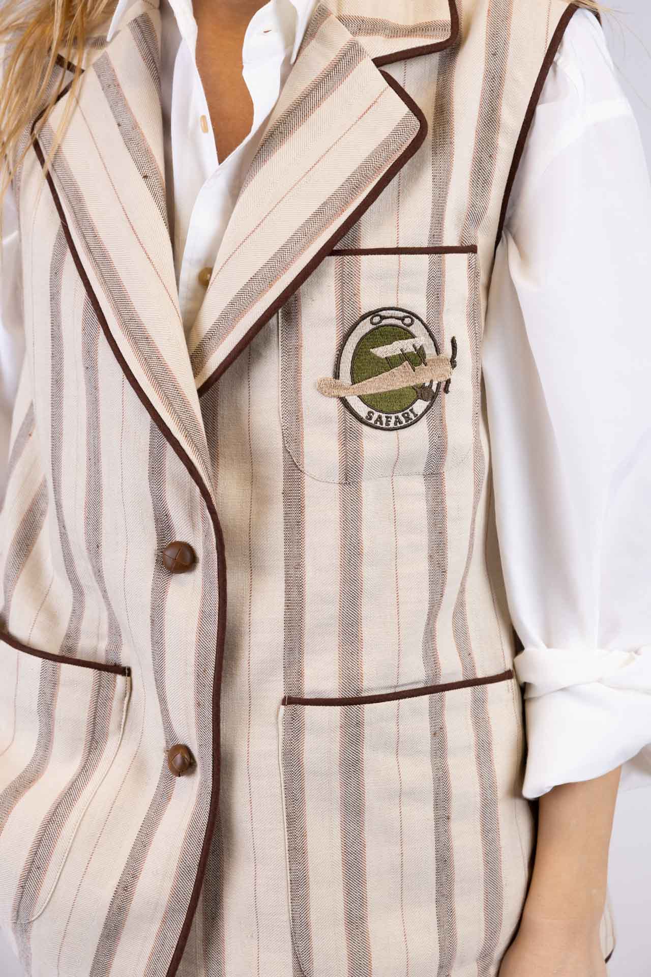 Il bordino in lino segue tutti i profili del capo e ne definisce la struttura, mentre i bottoni in pelle riciclata centrali completano il design con un accento materico ricercato.