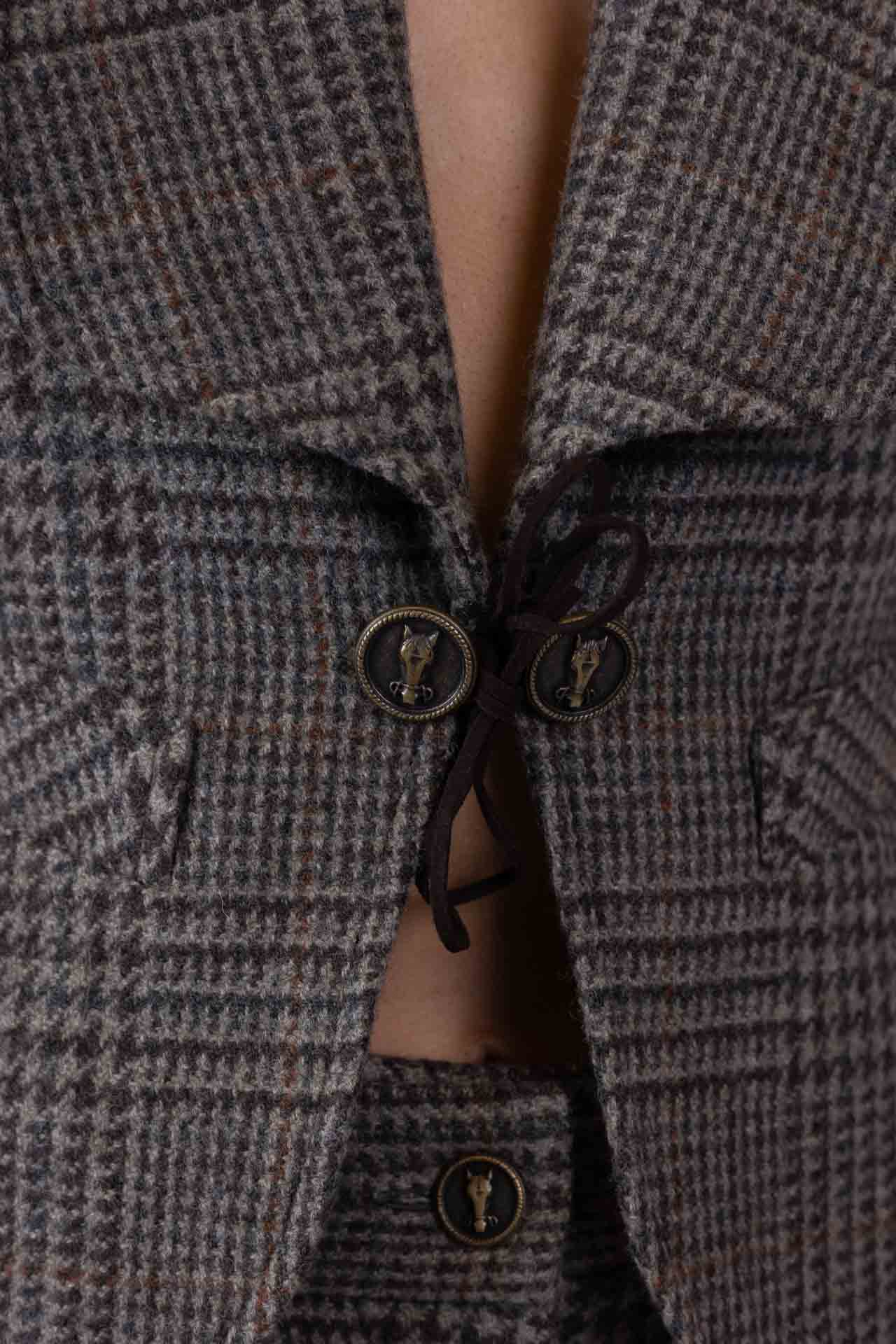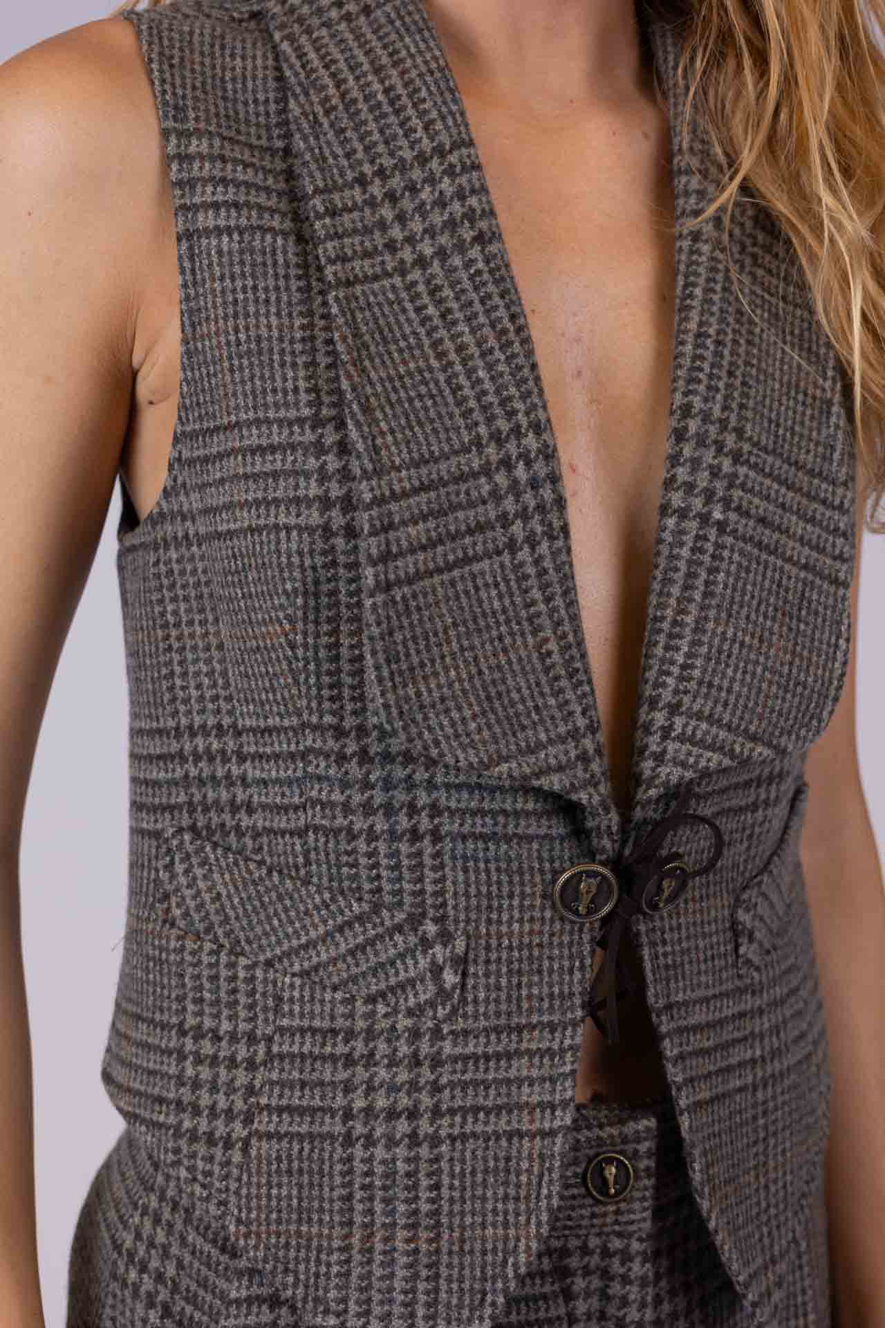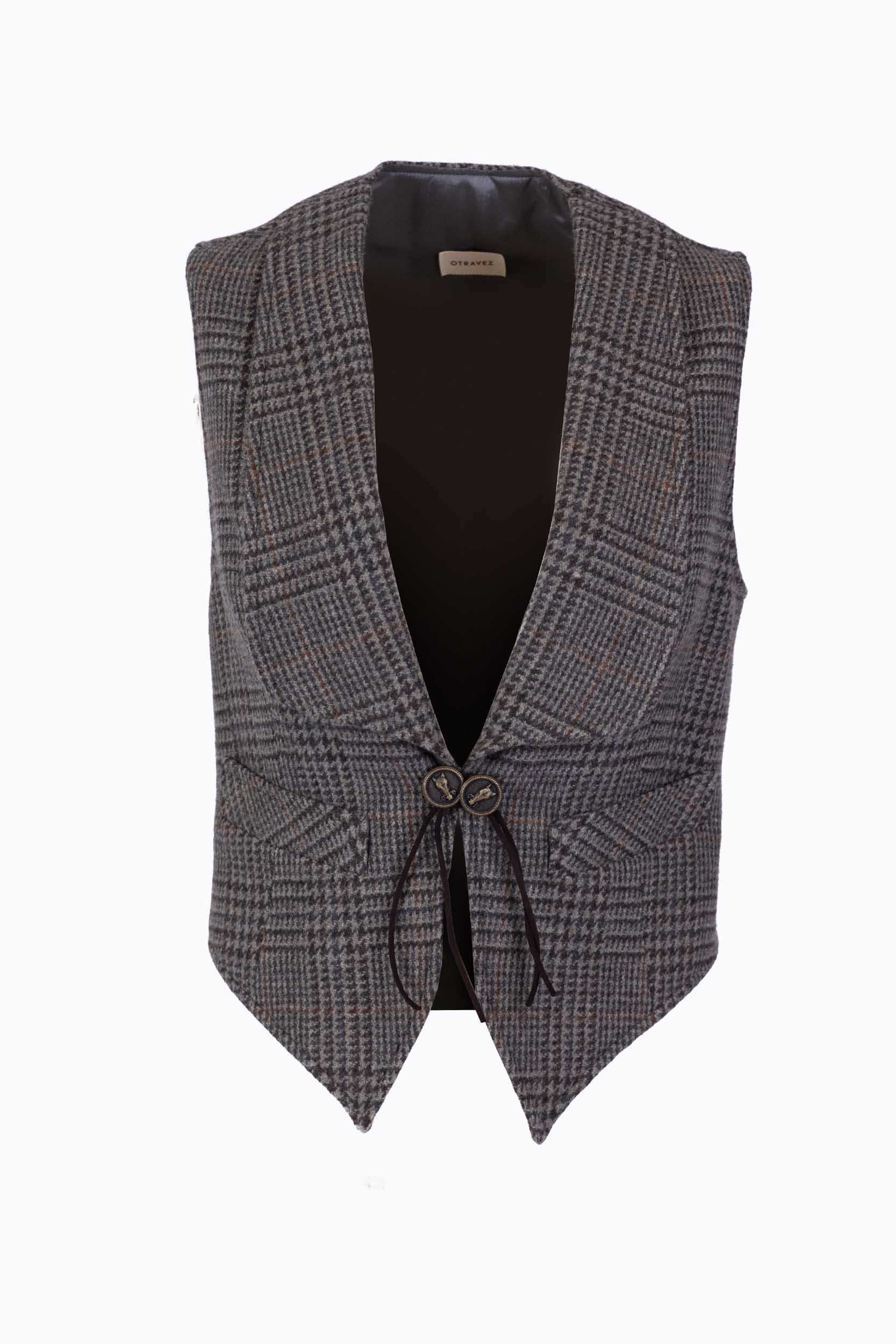 Gilet realizzato in 100% lana inglese con rever . Dietro con carré dal motivo a punta. Davanti senza incrocio con punti; motivo a doppi bottoni in metallo anticati cavallo, annodati da un laccio in pelle marrone.