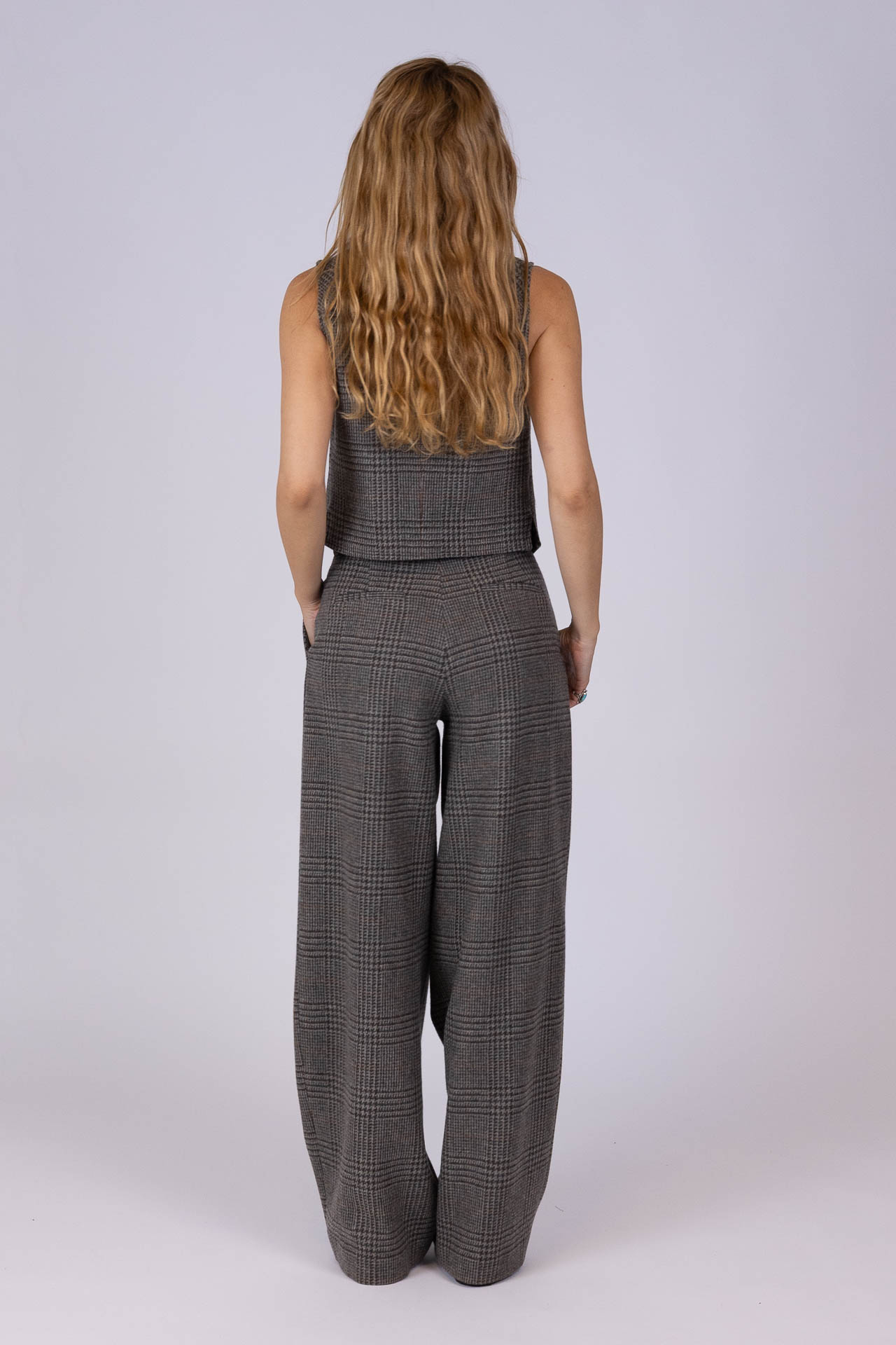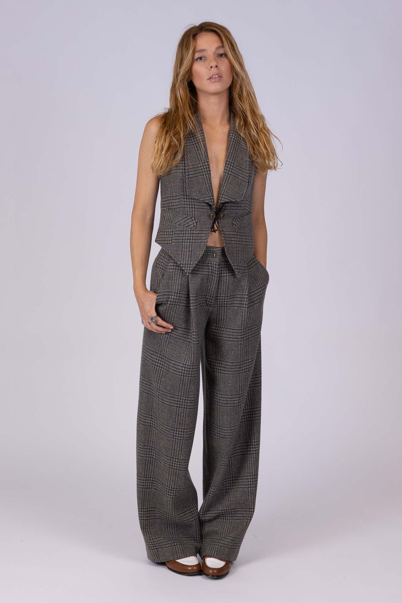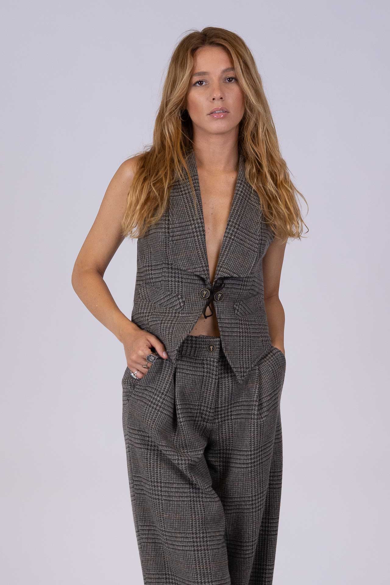 Gilet realizzato in 100% lana inglese con rever . Dietro con carré dal motivo a punta. Davanti senza incrocio con punti; motivo a doppi bottoni in metallo anticati cavallo, annodati da un laccio in pelle marrone.