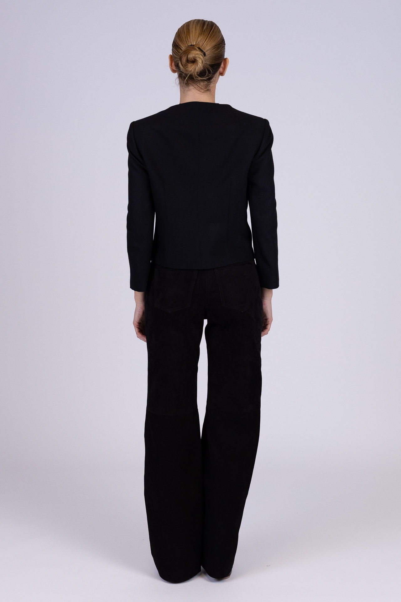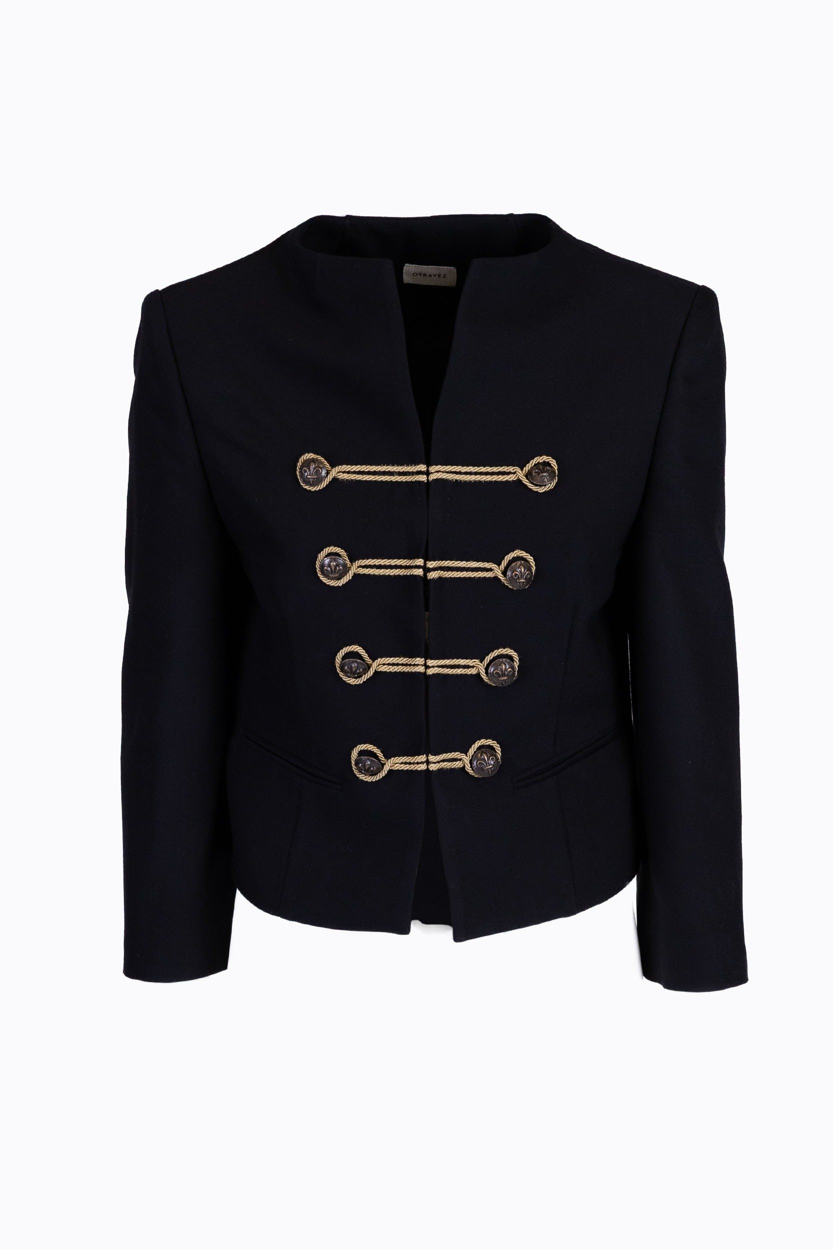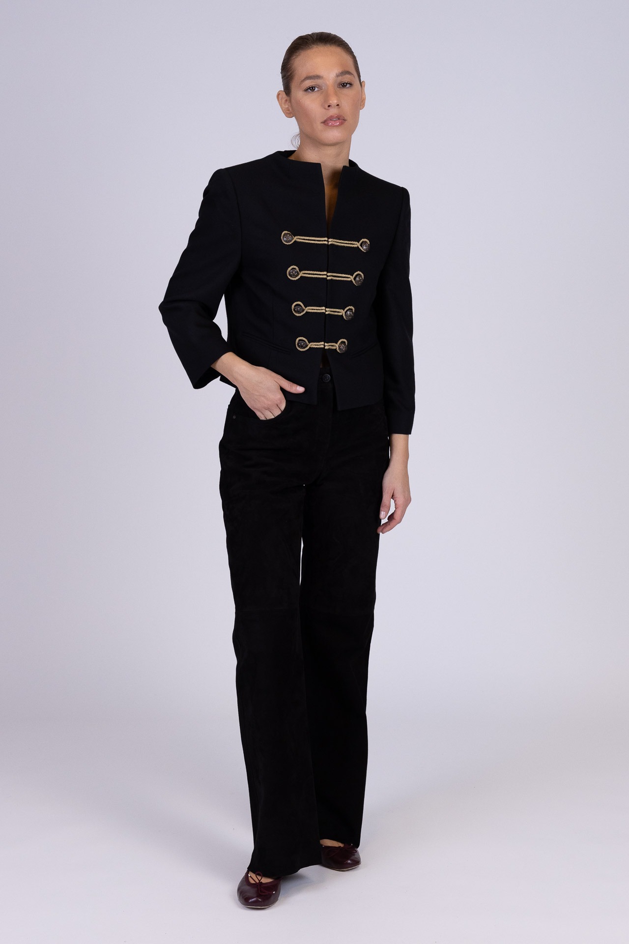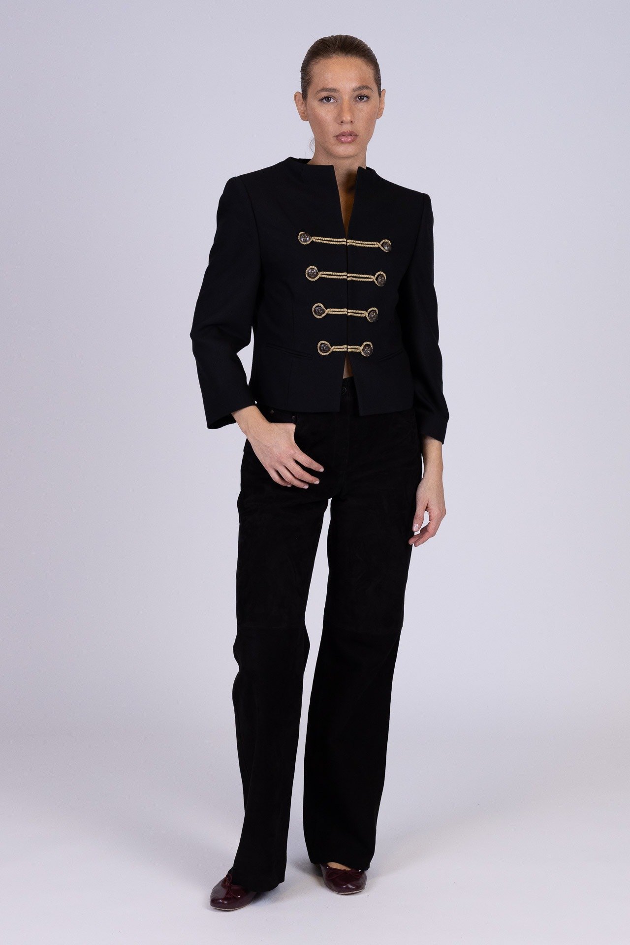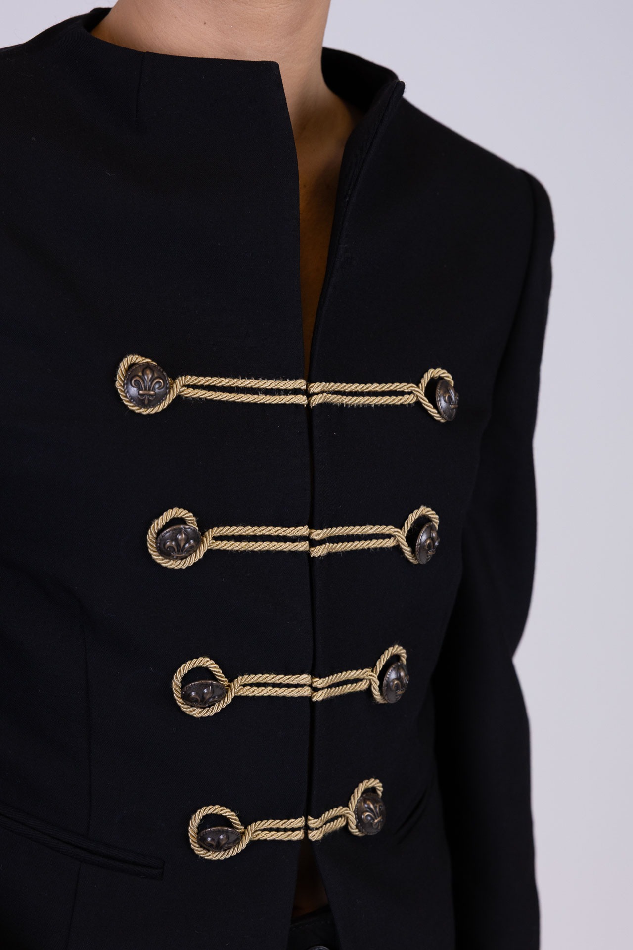 Realizzata in lana vergine pettinata nera, si distingue per la sua struttura impeccabile e le spalline sagomate che mantengono una silhouette decisa e raffinata. Gli alamari in filo d’oro e i bottoni color bronzo con giglio fiorentino aggiungono un tocco prezioso, evocando il fascino dell’artigianato d’altri tempi.