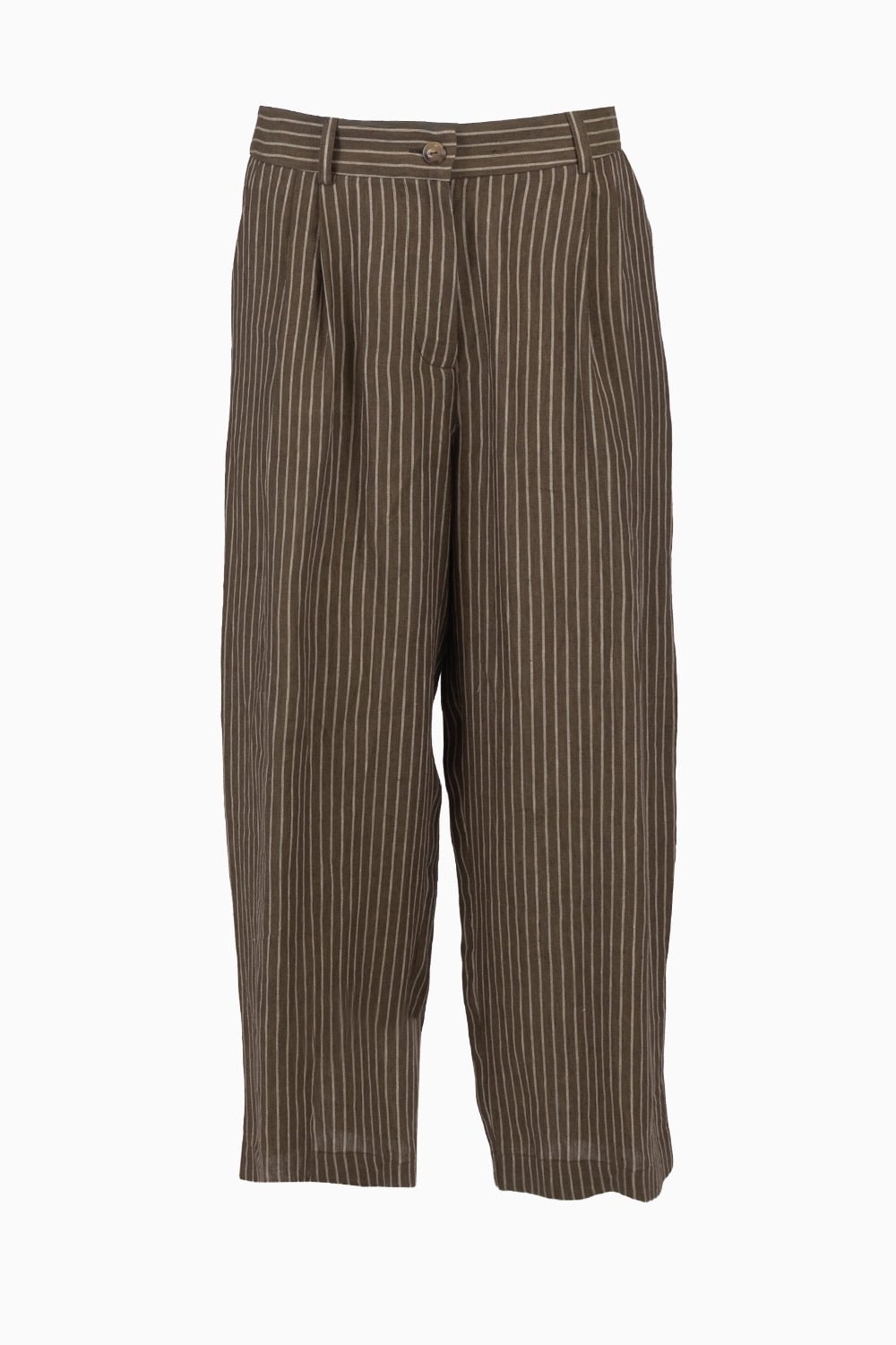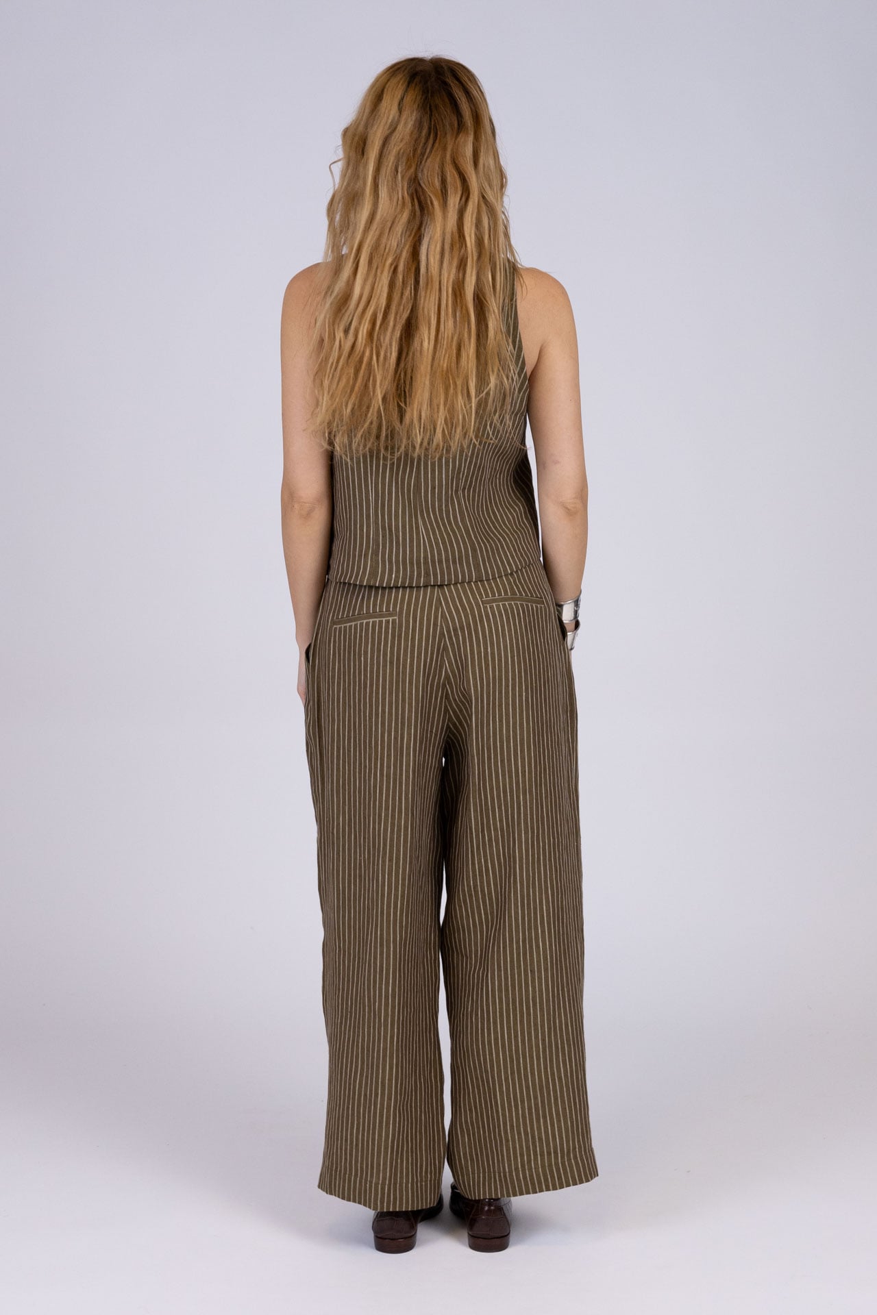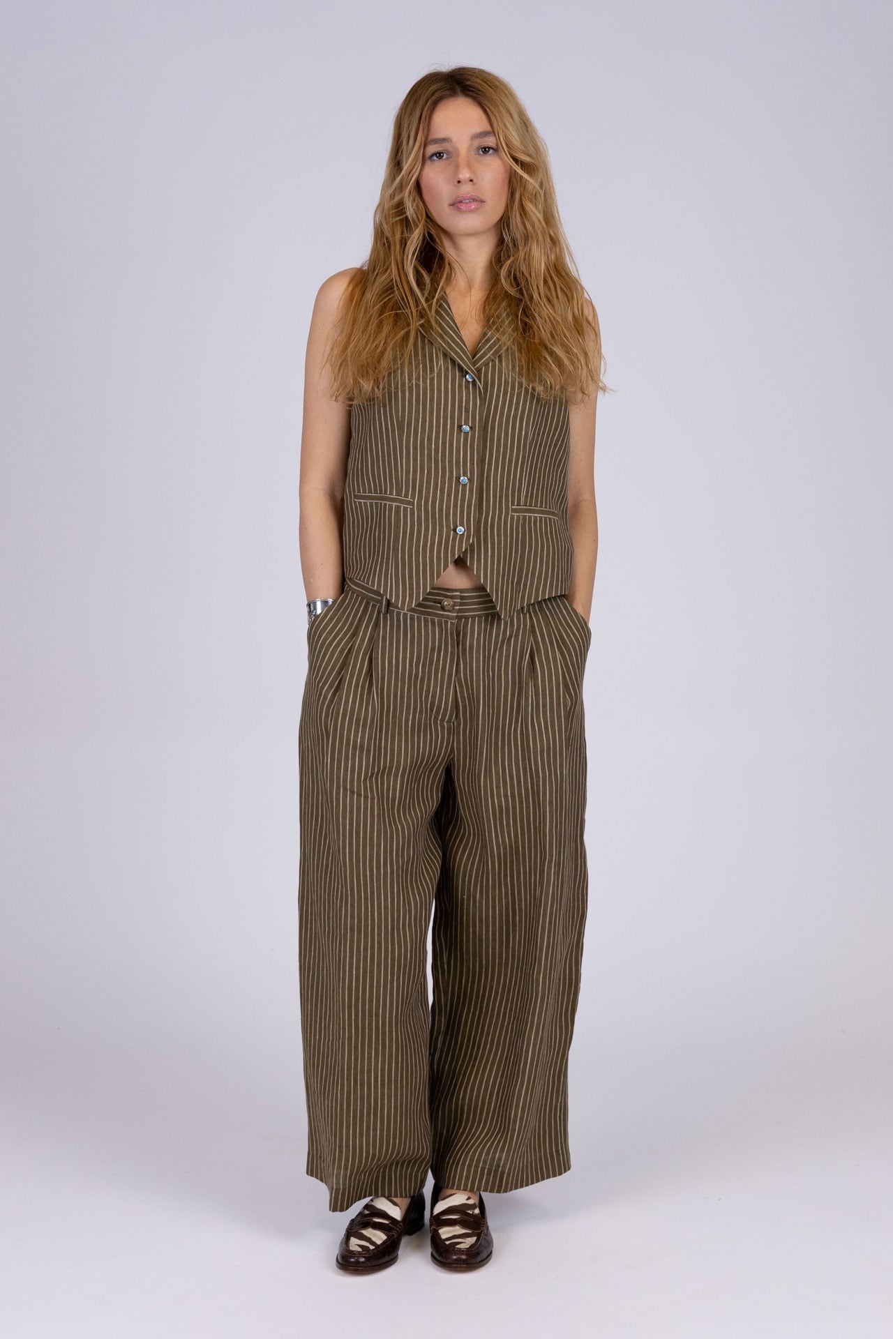 Pantalone realizzato in 100% lino, un tessuto naturale e traspirante che unisce leggerezza e struttura, perfetto per una vestibilità fresca e sofisticata. Il modello a vita bassa non segna il punto vita ma si appoggia con naturalezza sui fianchi, lasciando la silhouette morbida e rilassata, mentre la linea della gamba scende dritta e fluida fino alla caviglia.