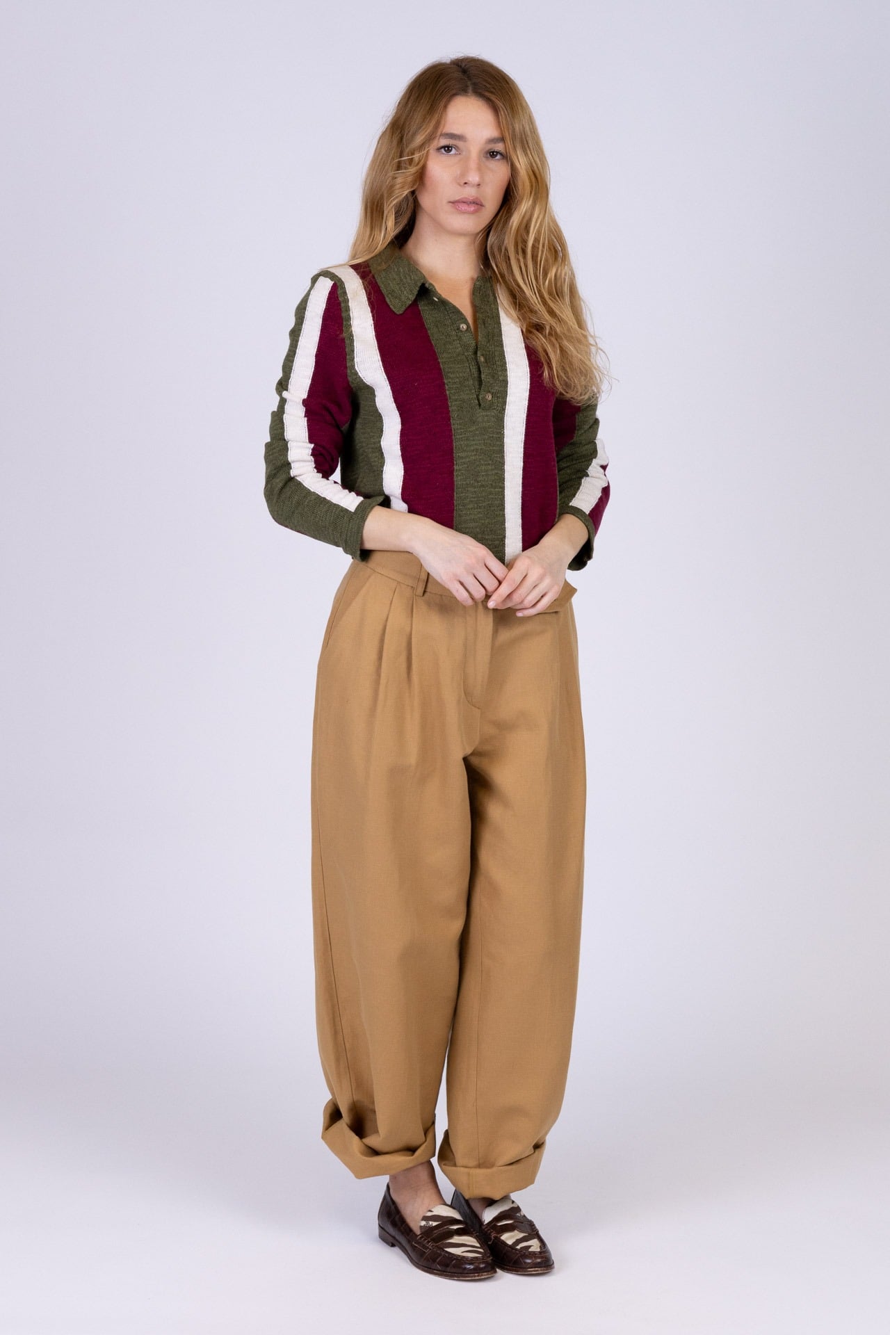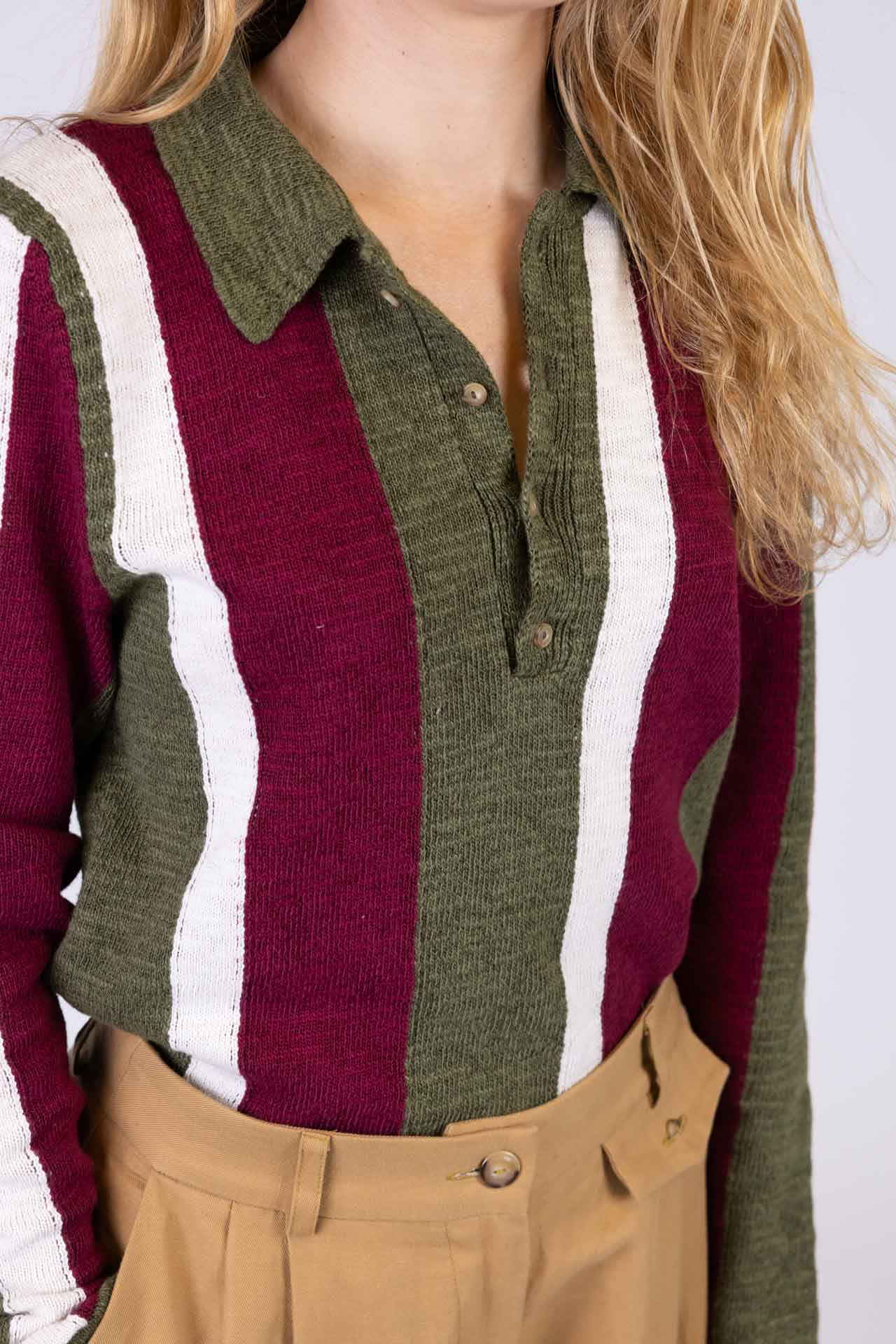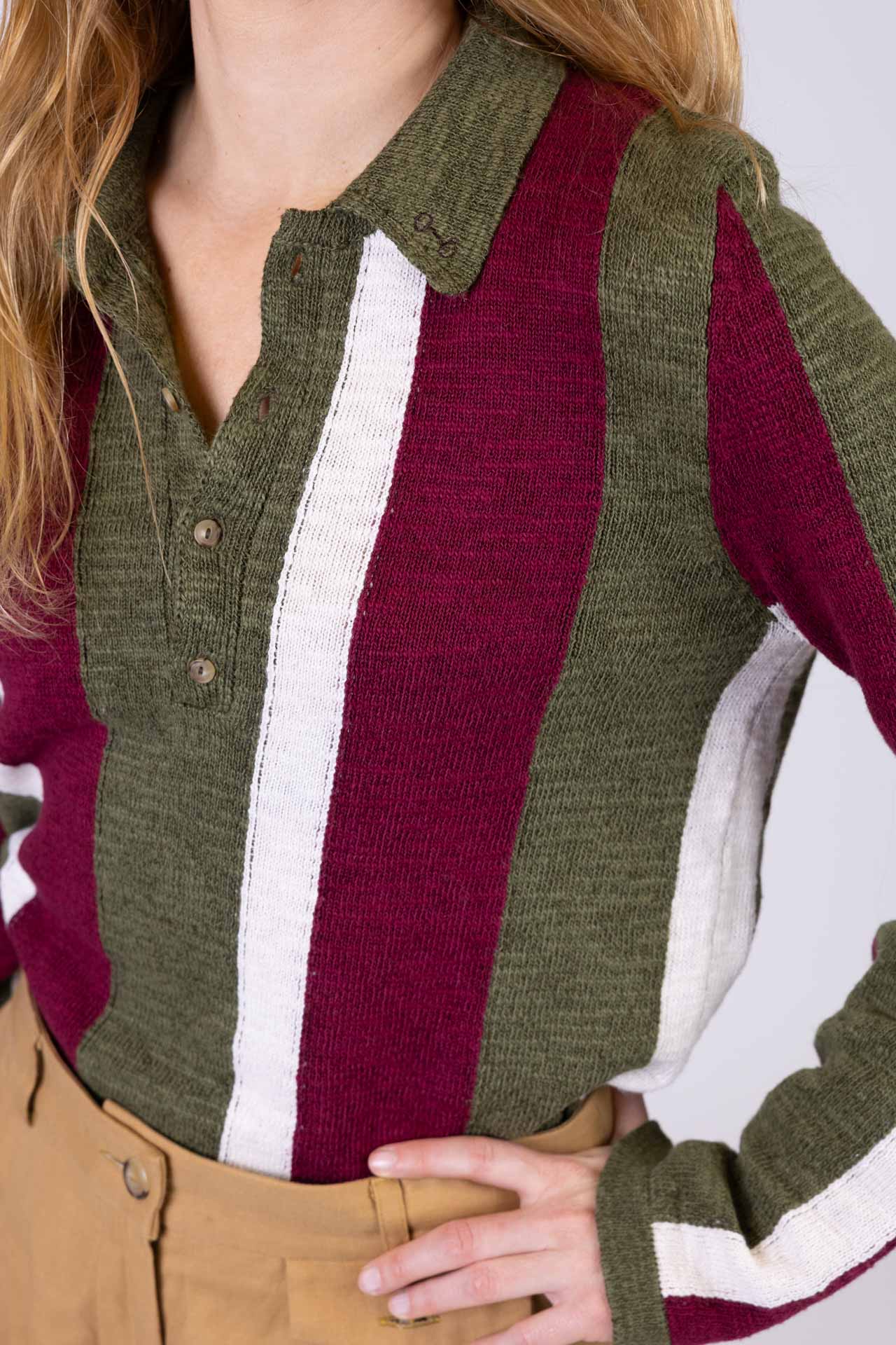 Questa polo a manica lunga in cotone e lino unisce eleganza e comfort in un capo dal design raffinato. Realizzata con una lavorazione artigianale di alta qualità e lavorazione ad intarsio, presenta righe verticali con profili verdi che valorizzano il disegno del capo e ne esaltano il carattere distintivo. Il filato è morbido e fresco al tatto, garantendo una piacevole sensazione sulla pelle.