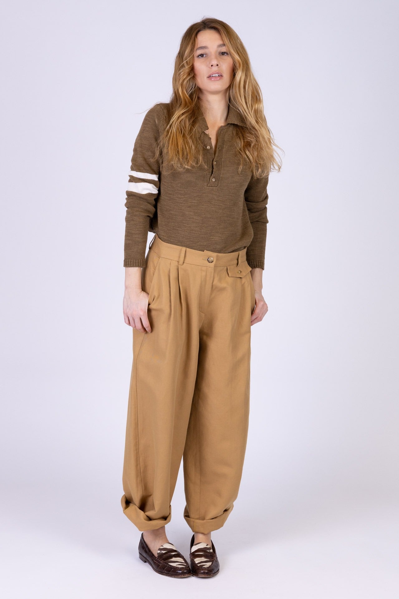 Questa polo a manica lunga in cotone e lino, unisce eleganza e comfort in un capo dal design raffinato. Realizzata con una lavorazione artigianale di alta qualità, il filato è morbido e fresco al tatto, garantendo una piacevole sensazione sulla pelle.  Presenta due dettagli particolari : le due righe panna a contrasto sulla zona dell’avambraccio destro, e un ricamo sul colletto con raffigurato un morsetto per cavallo,  dettagli distintivi che richiamano una tradizione di stile e raffinatezza. Il modello, dal taglio morbido e dalla vestibilità confortevole, permette una libertà di movimento ideale per le serate estive più fresche. Perfetta per chi cerca un capo versatile che fonde praticità e un tocco di classe, questa polo si adatta facilmente a momenti casual ma eleganti.